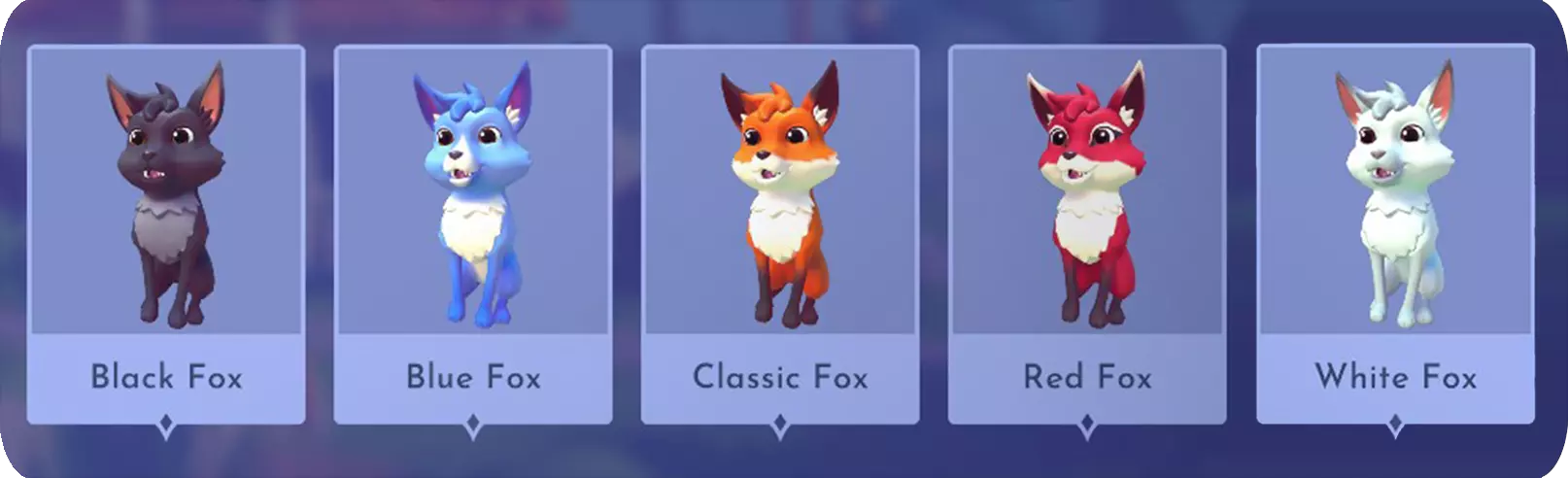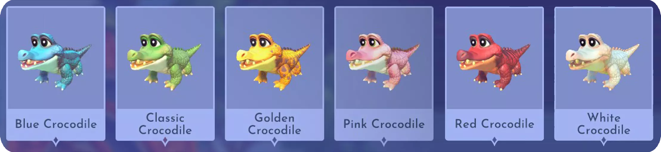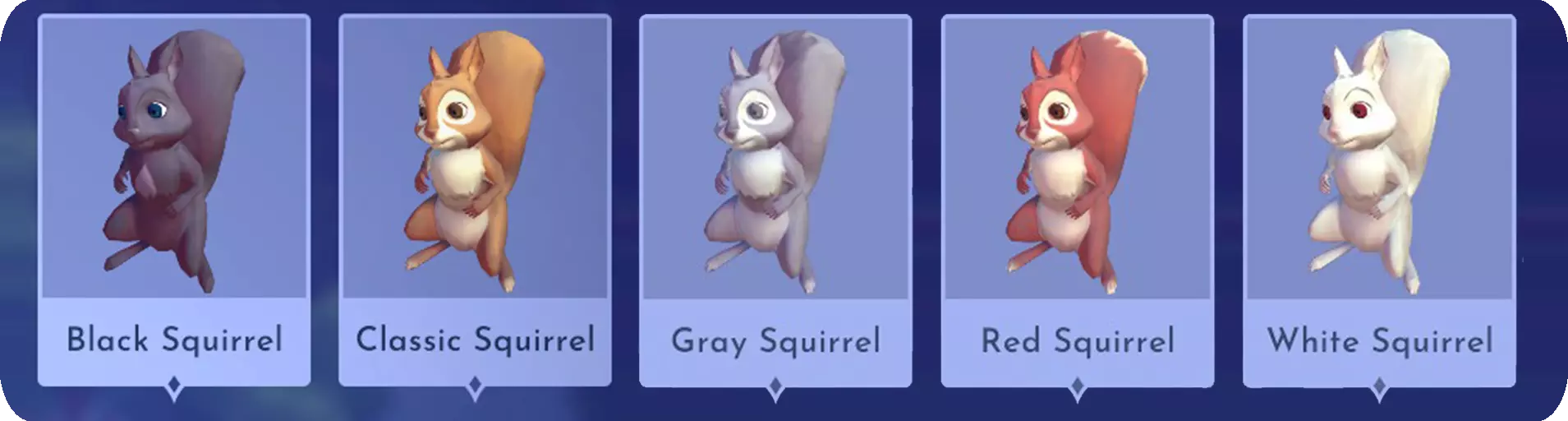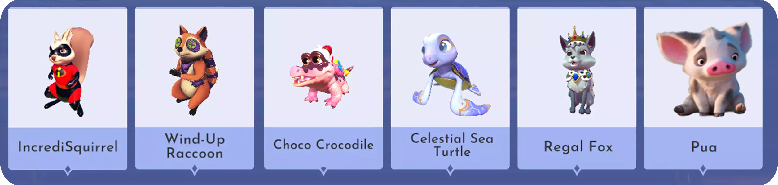 IncrediSquirrel:从2022年9月皮克斯星光之路获得。 发条浣熊:从2022年10月反派星光之路获得。 巧克力鳄鱼:在游戏发布第一周通过邮箱获得。 天体海龟:购买【迪士尼梦光谷】豪华版创始人包后获得。 皇家狐狸:购买【迪士尼梦光谷】终极版创始人包后获得。 Pua:完成莫阿娜的“THE SEARCH FOR PUA”任务后获得。