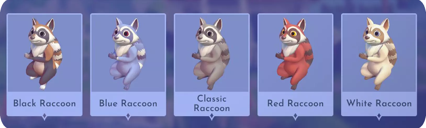喜爱的食物:白鲟 喜欢:螃蟹 - 黑狐 | 周日[中午12点-午夜12点],周二/周三/周六[全天]。 - 蓝狐 | 周日[午夜12点-中午12点],周二/周四/周五[全天]。 - 经典狐 | 周日[午夜12点-中午12点],周一/周三/周五[全天]。 - 红狐 | 周六[凌晨2点-早上8点]。 - 白狐 | 周日[中午12点-午夜12点],周二/周四/周五[全天]。 接近方法: 走向它们并追逐3次。第三次追逐后,你将能够喂养它们。 浣熊