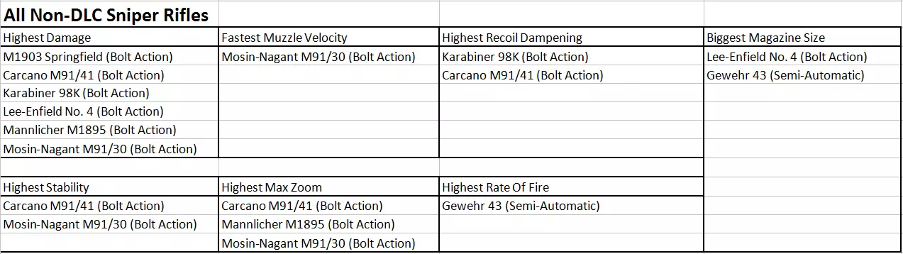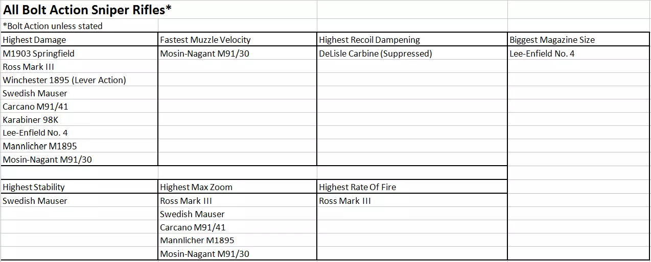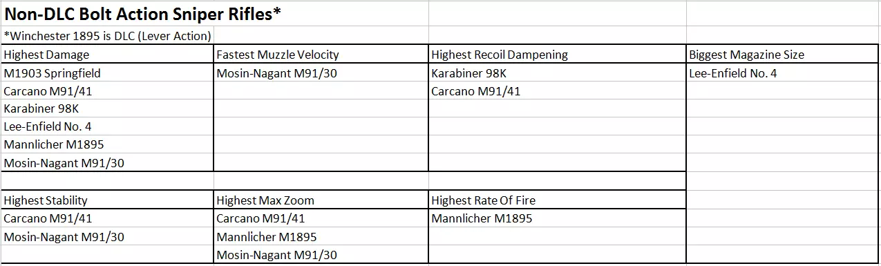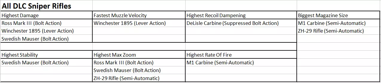 结论 如你所见,所有枪械都各有不同,它们在不同情况下的表现也各不相同。这归根结底取决于以下几点: 1) 你是否愿意购买DLC? 2) 你偏好近距离还是远距离作战? 3) 你是否想频繁使用狙击步枪? 4) 你偏好强攻还是潜行? 5) 你是否有稳定的瞄准手? (内容可能会有变动!) 注意:在“真实”和“真实+”难度下,狙击步枪仅锁定最大 zoom(???)。如果你已升级其他属性,则这些属性仍保持升级状态(???)。 补充说明:所有栓动式和杠杆式狙击步枪在升级后具有相同的伤害输出。 半自动狙击步枪也是如此,但伤害较低。 参考资料 这些图片是本指南的依据,你也可以用它们进行自己的比较和研究。狙击步枪