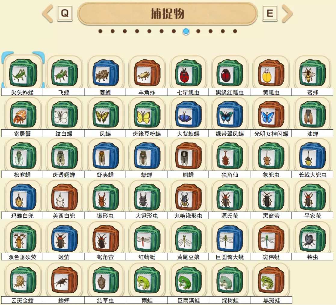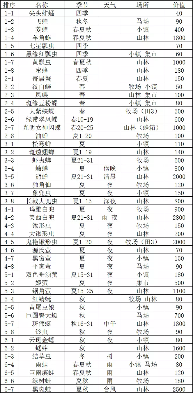 全农作物纯靠肝就能获得,这里不一一列举了。 全捕捉图鉴捕捉:使用手柄时轻推摇杆,或使用键盘时按住Ctrl键,可以不惊动虫子。 刷新机制:上午不刷新,中午后大致每3小时刷新一次。