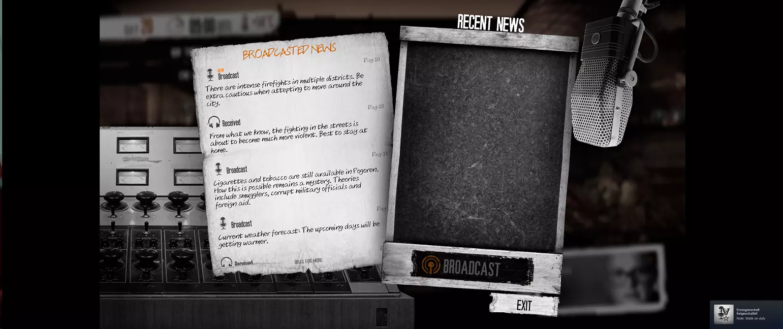 请确保每天使用并收听你的广播系统,并且发布每条新闻。该成就应在马利克被杀或加入叛军之前解锁。你也可能从弗兰科那里或在公寓中找到的纸质笔记(军方的威胁)获得新闻。 务必访问每个地点和房间,以免错过新闻。 解锁该成就需要收集26份笔记。 如果无法完成,可以查看下方的详细成就指南。 - 已知问题(根据社区反馈):你可能会收到两次烟草价格下跌的新闻。据其他玩家反映,这会导致成就挑战失败。只需重启当天,并且不要再询问弗兰科即可。如果你就上次事件向马利克撒谎,可能会阻碍军事新闻相关内容。 “Malik on Duty”成就指南+片段 鉴于很多人抱怨无法解锁该成就,我重置了成就并重新速通了一遍。这是专门为你们做的。 确保在访问完所有地点后,不要留马利克独自在家。否则会触发“马利克事件”(他离开或死亡),你将不得不从头开始。 在获得“激烈交火记录”前,不要前往废弃小队。如果在获得“激烈交火记录”后成就仍未弹出,只需退出到主菜单并重新开始当天。 你不必完全严格按照步骤执行。你可能会更早或更晚获得一些新闻。