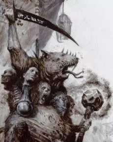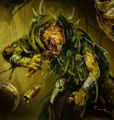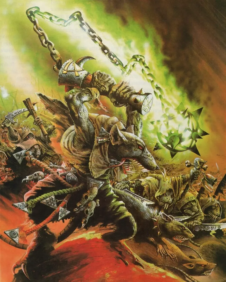 当契约达成时,幸存的鼠人领袖在露丝契亚被更名为纳垢利奇。这个名字并非不幸的巧合:它揭示了疫病氏族真正的效忠对象。这与《战锤幻想战役:露丝契亚》(2004年版)的设定一致,其中记载初代纳垢利奇“深受其邪恶神祇的青睐”,因此对纳垢系法术免疫。 得益于纳垢的祝福,初代纳垢利奇拥有超乎寻常的漫长寿命。他将衰败的疫病氏族重建为军事强权,迁徙回旧世界,引发了第一次鼠人内战,并通过决斗杀死一名腐烂领主,赢得了十三人议会的席位。“大疫主纳垢利奇”自此成为疫病氏族最高领袖的传统头衔。现任大疫主是努尔格利奇七世,他占据着十三人议会的第十席。这一职位使他能够否决克拉奇·末日爪——瑞克特氏族的统治者,同时也是特retch·畏尾的宗主。 鼠裔孽种 努尔格利奇的瘟疫宫廷是《战锤幻想战役:露丝契亚》(2004年)中引入的斯卡文鼠人 army list。其中详细描述了疫病氏族早期的部队,例如初代努尔格利奇、千痘大锅、脓囊怪以及鼠裔孽种。 与该 army list 中的大多数单位一样,鼠裔孽种并没有官方模型。不过,它似乎是瘟疫宫廷中触怒了纳垢的成员所残留的形态,很像混沌孽种。其描述如下: 引用自 WHFB: Lustria, p.63:通往荣耀的道路确实充满危险,而那些在这条路上动摇者的命运之一,便是被转化为某种可怕到难以想象的存在。 神圣数字 每个混沌神祇都与一个特定的数字相关联,这些数字能为其追随者赋予额外的力量:色孽对应6,纳垢对应7,恐虐对应8,奸奇对应9,马拉尔对应11,而角鼠则对应13。