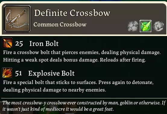 十字弩的特殊攻击(右键)是爆炸螺栓,与爆炸桶不同,它不会对玩家造成伤害。不过它会将玩家击退,因此可以用作火箭跳。这作为逃生工具尤其有用,因为即使玩家被网困住,螺栓也能将其击退。