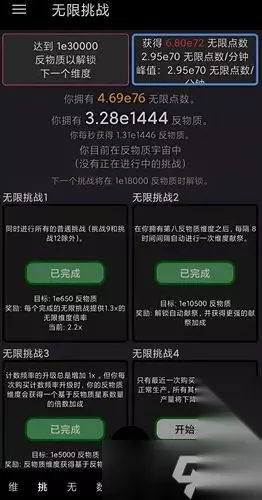这是我在即将毁灭现实时截的图,可以看到,对于反物质维度倍数而言,主要来源是符文炼金、无限升级和维度提升,而前期作为主输出的无限维度在此时已经离开了强势期,突破无限升级更是顶级没用的东西。当然,不同机制有着自己的强势期,不能一概而论,需要根据自己的实际情况来选择。 无限之前 无限之前主打的就是力大飞砖,也是最无聊的阶段,主要目的是教会玩家基础的生产概念和提升方式,在无限之前就可以学习到整个完整的生产公式。 无限之前会逐步解锁自动购买器,一个极大提升玩家成就感的机制,但解放玩家的双手并不意味着解放大脑(悲)。无限 无限最重要的不是无限升级,而是新增加的无限维度和复制器。 无限维度的生产方式与普通维度一致,只是第一无限维度生产无限力量,无限力量在乘7次方后加到普通维度的倍数上,这将会成为很长时间内反物质维度倍数的主要来源。相比之下,无限升级提供的是更快从重置中恢复的能力,突破无限升级提供的是更低的购买价格,论生产效率难以和无限维度相提并论。 挑战无限后解锁了挑战,每个挑战都有着各自的限制和目标,算是整个游戏中最有意思的部分,甚至后期部分机制需要靠前期的挑战来解。部分挑战在施加限制的同时也会提供一定加成,进一步向玩家解释机制。例如C8在禁用维度提升和星系后,会提供更强力的维度献祭,这其实是在告诉玩家倍数终究敌不过时间加成;IC5则让玩家学会留意购买价格等。 复制器也是个让人又爱又恨的东西。刚解锁时它确实没什么用,其生产机制为:每隔一段时间(Interval),按一定概率(Replicate chance)判定每个已有复制体能否生成新的复制体。复制体总数会按某个倍数换算为无限维度的倍数,但这个倍数作用不大,更重要的是复制体星系——花费1.08e308复制体购买后可获得额外星系,从而提升每秒生产次数的效率。复制器在永恒阶段及现实阶段前都能提供大量的星系,但在现实阶段后会逐步被超光速星系取代。 永恒:施工中 现实:施工中 自动机:可能会写另一篇指南,放在这里 天神挑战:施工中