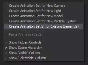 操作方法 提示:请在调整好相机和模型姿势后执行此操作。 步骤1:在已生成模型且相机准备就绪的情况下,右键点击动画集编辑器,然后点击“为现有元素创建动画集”。