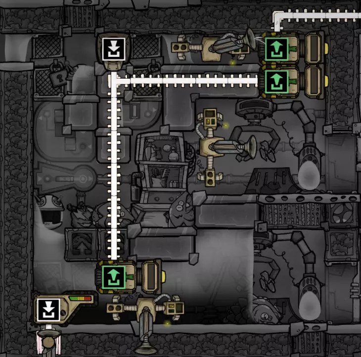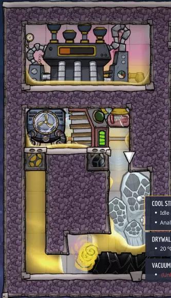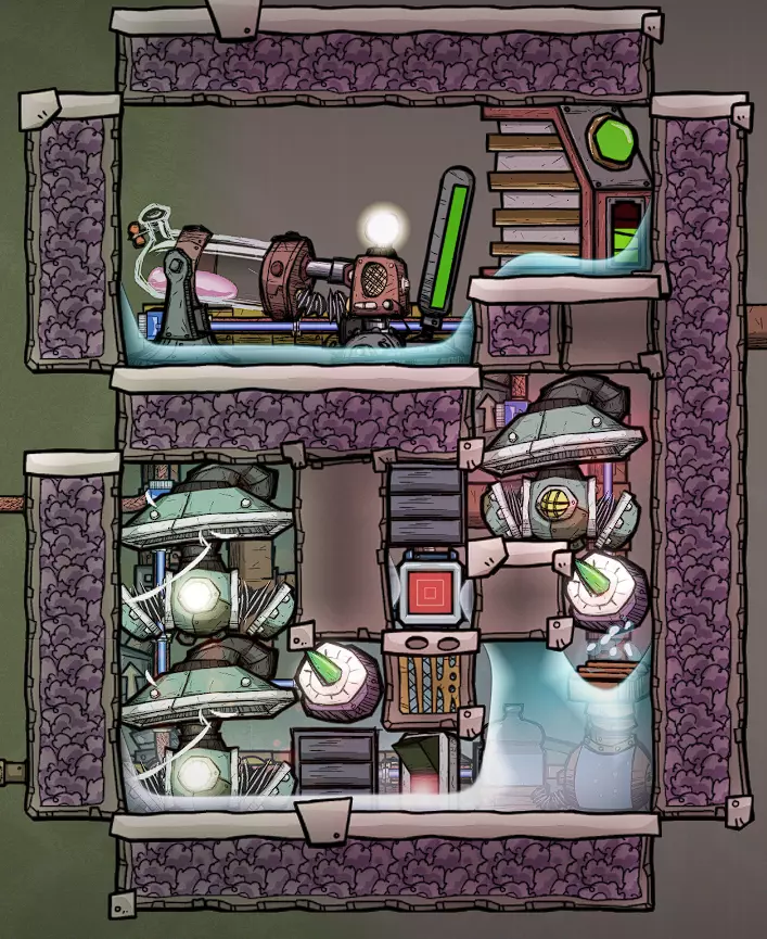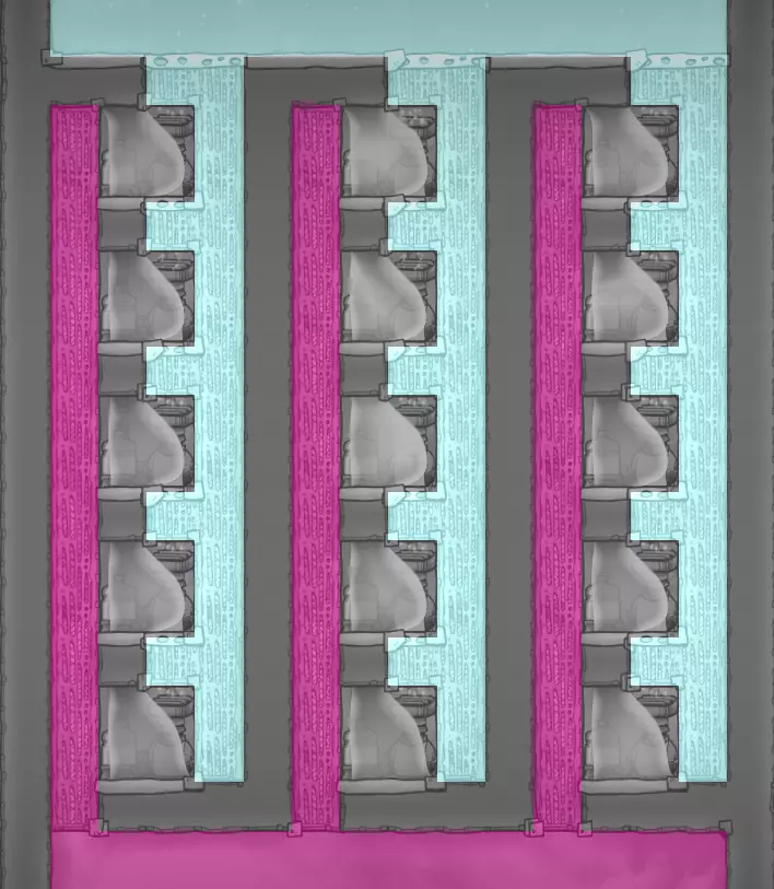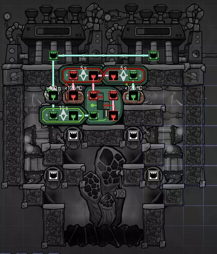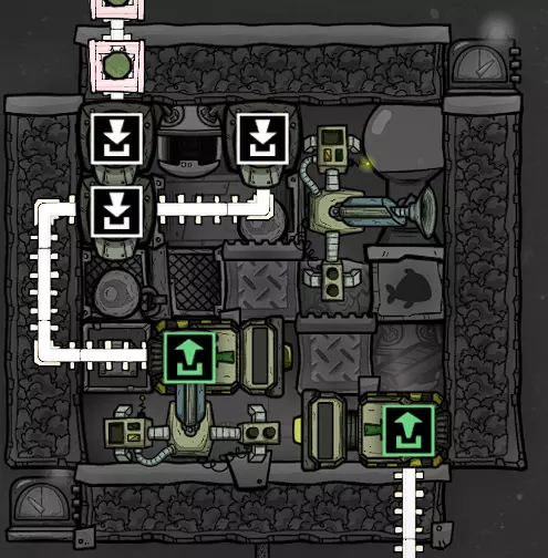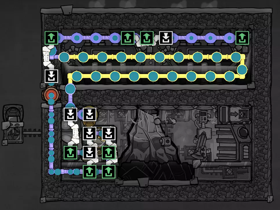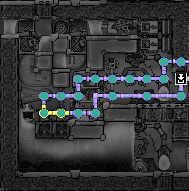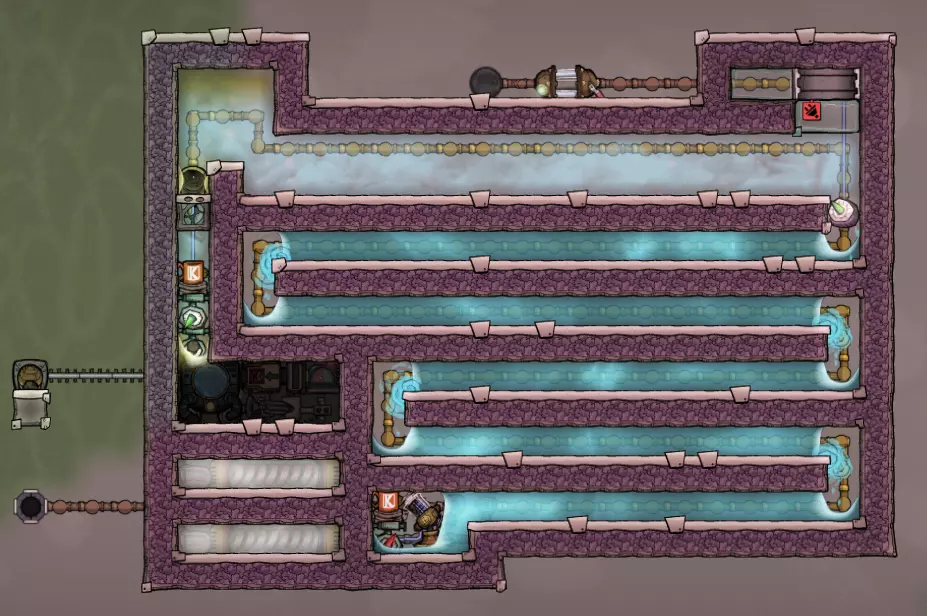 这个建造的核心思路是让复制人将污染水泵入液体排空器,但在复制人够到排空器之前将其封闭,使污染水落入一个极浅的液池(每格低于1kg),这样无论上方实际气压如何,都能强制触发释气。 该建造的主要目的是生产黏土而非氧气,但它仍能为10个复制人提供足够氧气,且能耗仅为2个氧气扩散器的四分之一。 需要注意的是,“大合并”更新极大削弱了污染水方块的释气效率,这意味着将其转化为瓶装水可以在极少的格子内加快释气速度。 这是该建造的简化版本: