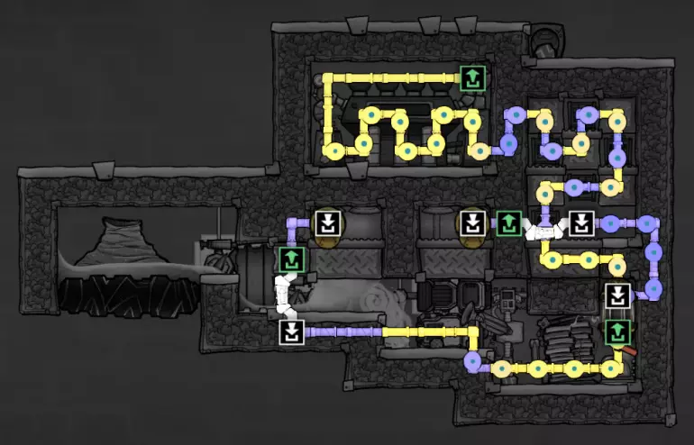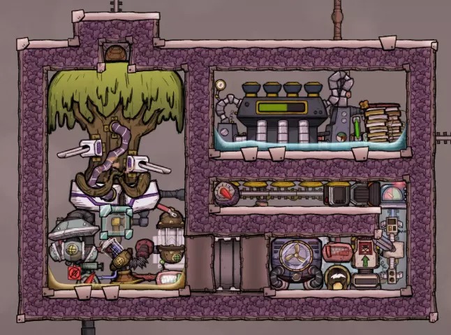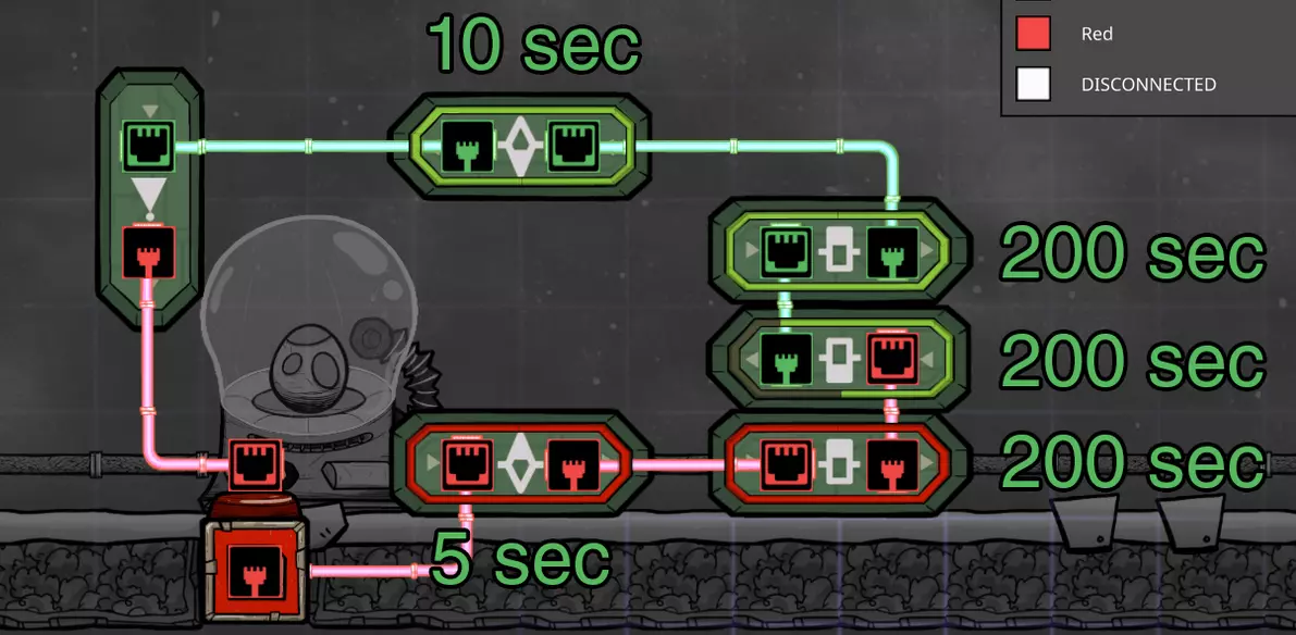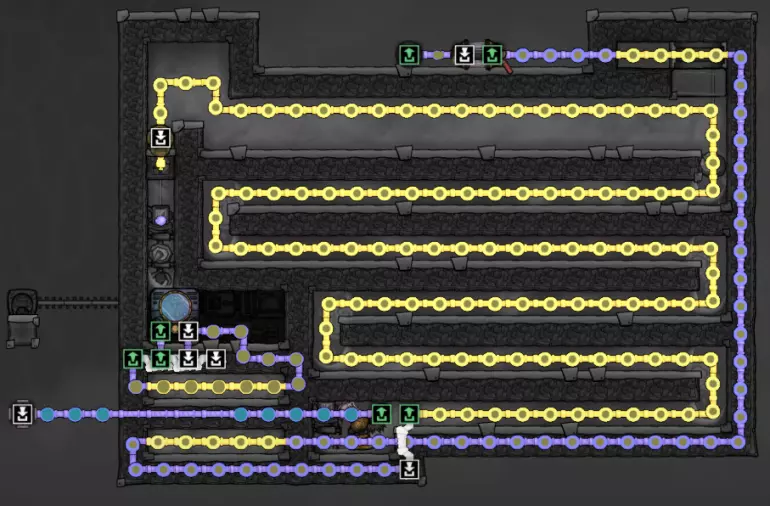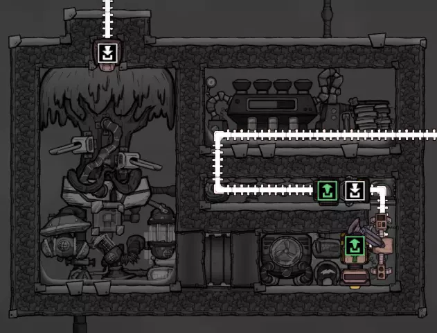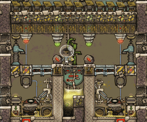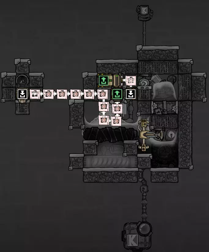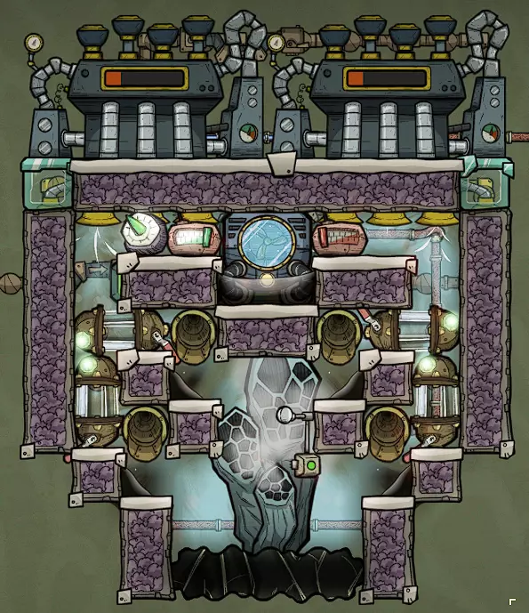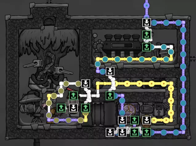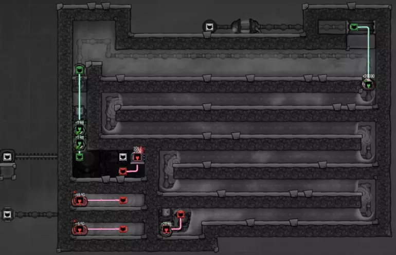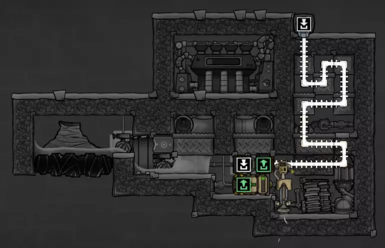 这个建造的核心思路是让复制人将污染水泵入液体排空器,但在复制人够到排空器之前将其封闭,使污染水落入一个极浅的液池(每格低于1kg),这样无论上方实际气压如何,都能强制触发释气。 该建造的主要目的是生产黏土而非氧气,但它仍能为10个复制人提供足够氧气,且能耗仅为2个氧气扩散器的四分之一。 需要注意的是,“大合并”更新极大削弱了污染水方块的释气效率,这意味着将其转化为瓶装水可以在极少的格子内加快释气速度。 这是该建造的简化版本: