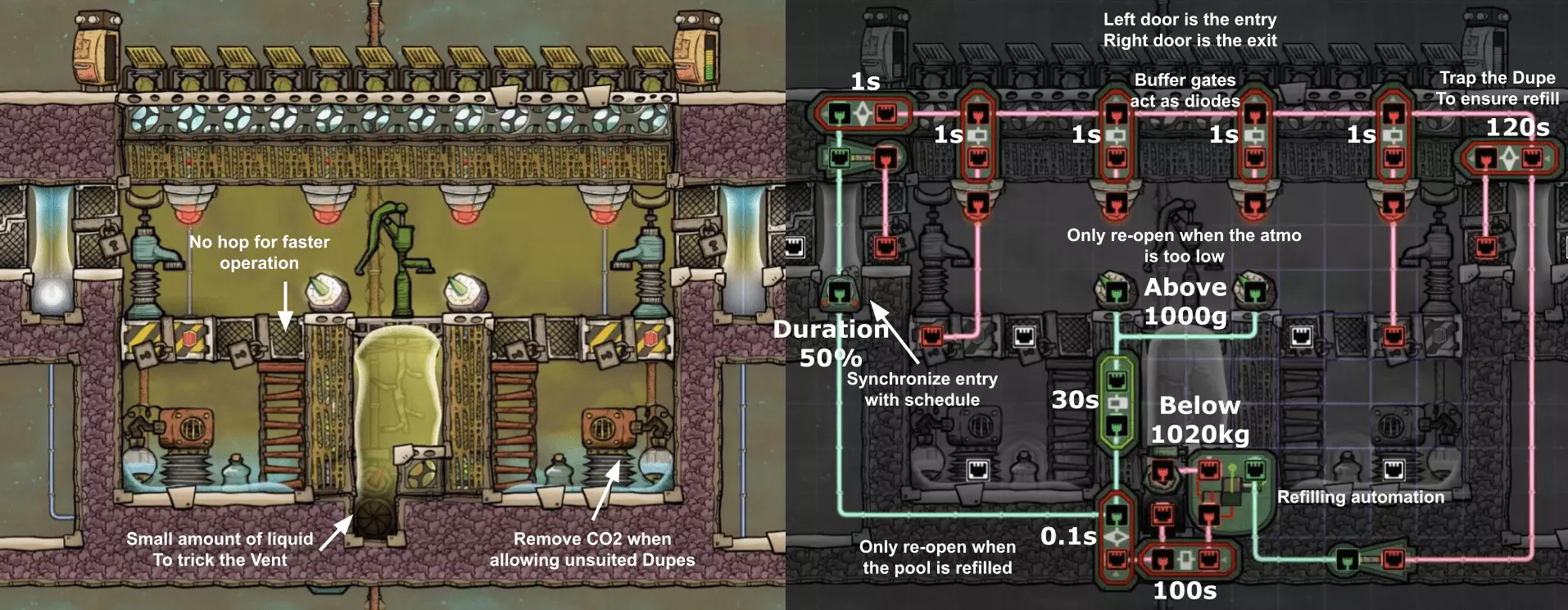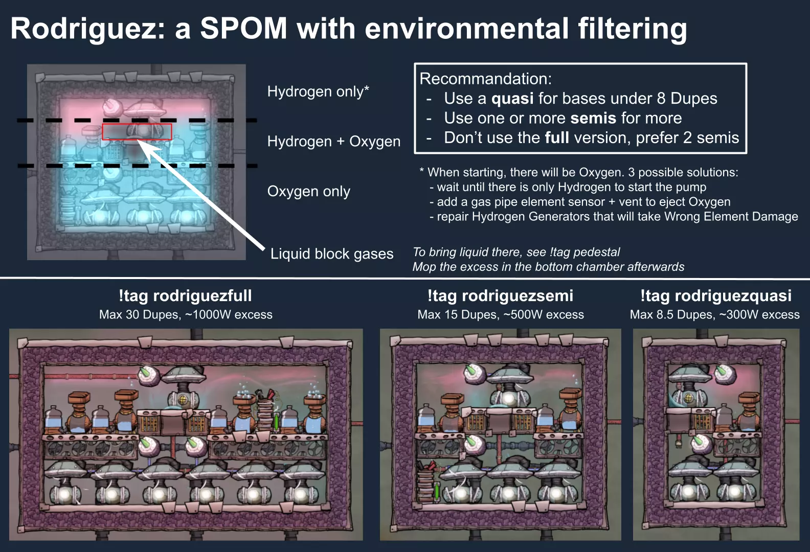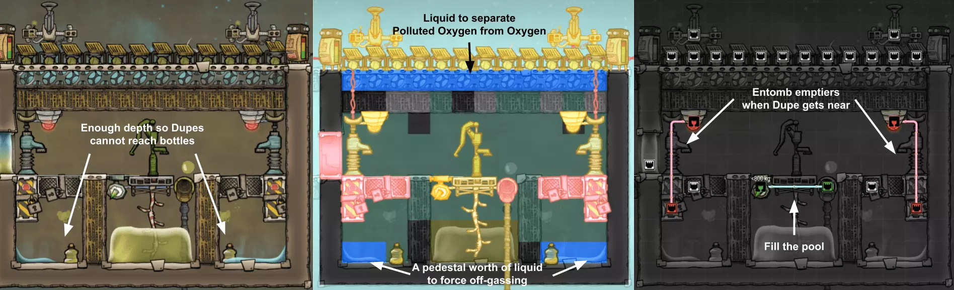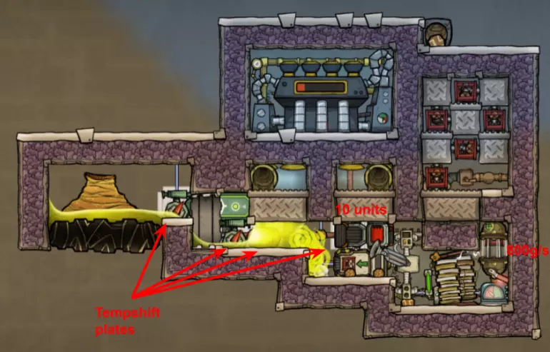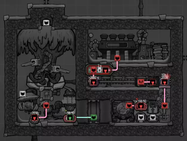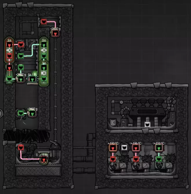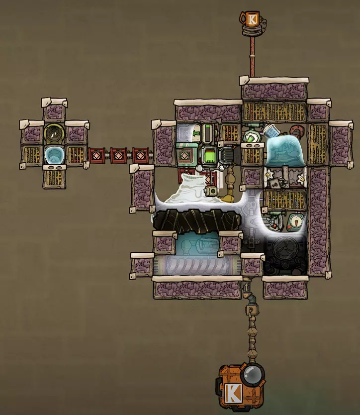 特定于《缺氧:眼冒金星》DLC的建造方案将以此图标标记。它们要么使用了《缺氧:眼冒金星》中的间歇泉、兴趣点,要么是为了解决原版游戏中不存在的问题(主要是没有浮土从天而降,导致过滤介质不像原版那样随处可见)。 免责声明:虽然我认为这些建造方案都很棒,但我并未实际建造过所有方案。如果在使用某个建造方案时遇到问题,请前往非官方ONI Discord获取帮助(希望原作者能亲自解答)。我会尽力注明自这些方案设计以来可能发生的任何变化(旧bug已修复、新bug出现等)。摘要 所有建造方案的快速链接(主要用于直接分享建造方案链接,因为Steam摘要不支持锚点): 电解器:罗德里格斯方案 电解器:九头蛇方案 除臭器 冷却蒸汽喷口:小丑帽方案 盐水喷泉:无限盐调谐器方案 污染水喷泉:蒸发调谐器方案 污染氧气喷口:奇尔特方案 氢气喷口 金属火山 漏油裂隙 硫磺喷泉:硫磺石方案 自动溺毙pez分配器 drecko pacu:pacubox 3方案孵化器自动化:SSAI 8名复制人自给自足基地:麻辣豆腐 bunkhouse 24名复制人核心基地 液氧/液氢:集成火箭燃料补给器 酸气锅炉 实验52B:Exspilement 石脑油生产 建造方法 虽然我假设大家对游戏机制有较好的熟悉度,但我还是会先介绍一些非常实用的建造方法,这些方法是构建部分设计所必需的。 关于建造材料 在展示建筑时,一个常见的问题是“使用了什么材料?”。 要详细说明本合集中每个建筑使用的所有材料是不现实的。 对于有主要文章的建筑,作者通常会在文章中详细说明这些材料。对于其他情况,合理选择材料即可: 任何需要隔热的结构都应使用火成岩建造(基性岩效果同样好)。 例外1:若要接触岩浆或温度超过1400°C的环境,请使用黑曜石。 例外2:强烈建议蒸汽轮机的基座使用陶瓷,因为蒸汽轮机与其基座会进行热交换。 辐射液体管道应使用铜、铁或金建造(它们的特性基本相同)。由于铝并非所有地图都有且性能更优,因此被视为太空材料。 辐射气体管道应使用铜矿或铁矿建造。在《缺氧:眼冒金星》中,钴矿同样适用。 液冷机的冷却液为污染水。超级冷却液效果更好,但它是一种太空材料,而大多数建造方案都以进入太空前为目标。在《缺氧:太空之旅》中,核废料也比污染水更好用。 具有过热温度的建筑(如泵),若处于75°C至125°C的环境中,应使用金汞齐(若使用金属矿石)或铜、铁、金(若使用精炼金属)建造。若环境温度在125°C以上,则应改用钢。 一般来说,建造方案分为三类: 1. 可在极早期建造,因为它们不需要钢或塑料。 2. 可在较早阶段建造,因为它们需要钢或塑料。 3. 只能在后期建造,因为它们需要太空材料:铝、超级冷却液、导热质或黏菌凝胶。大多数配装至少会尝试属于第二类,因为大量使用太空材料会严重限制配装的使用场景,而且配装是否使用塑料(比如有蒸汽轮机)或钢材(比如有建筑在125°C以上的大气环境中会过热)是很明显的。 因此,我只会在某些配装需要太空材料时特别说明。 【单格液体基座】 许多设计会在特定位置使用一格低质量液体。 要实现这一点,你可以使用抽水机和倒瓶器组合,来输送200千克的瓶子。不过这样做之后,你会留下大量多余的液体需要清理。相反,当你需要在特定单元格中放置少量液体(例如用于液体气闸)时,你可以在那里建造一个基座,指定一种液体(必须有可用的手动泵或该类型的瓶子),复制人会带来最多1千克的瓶装液体。