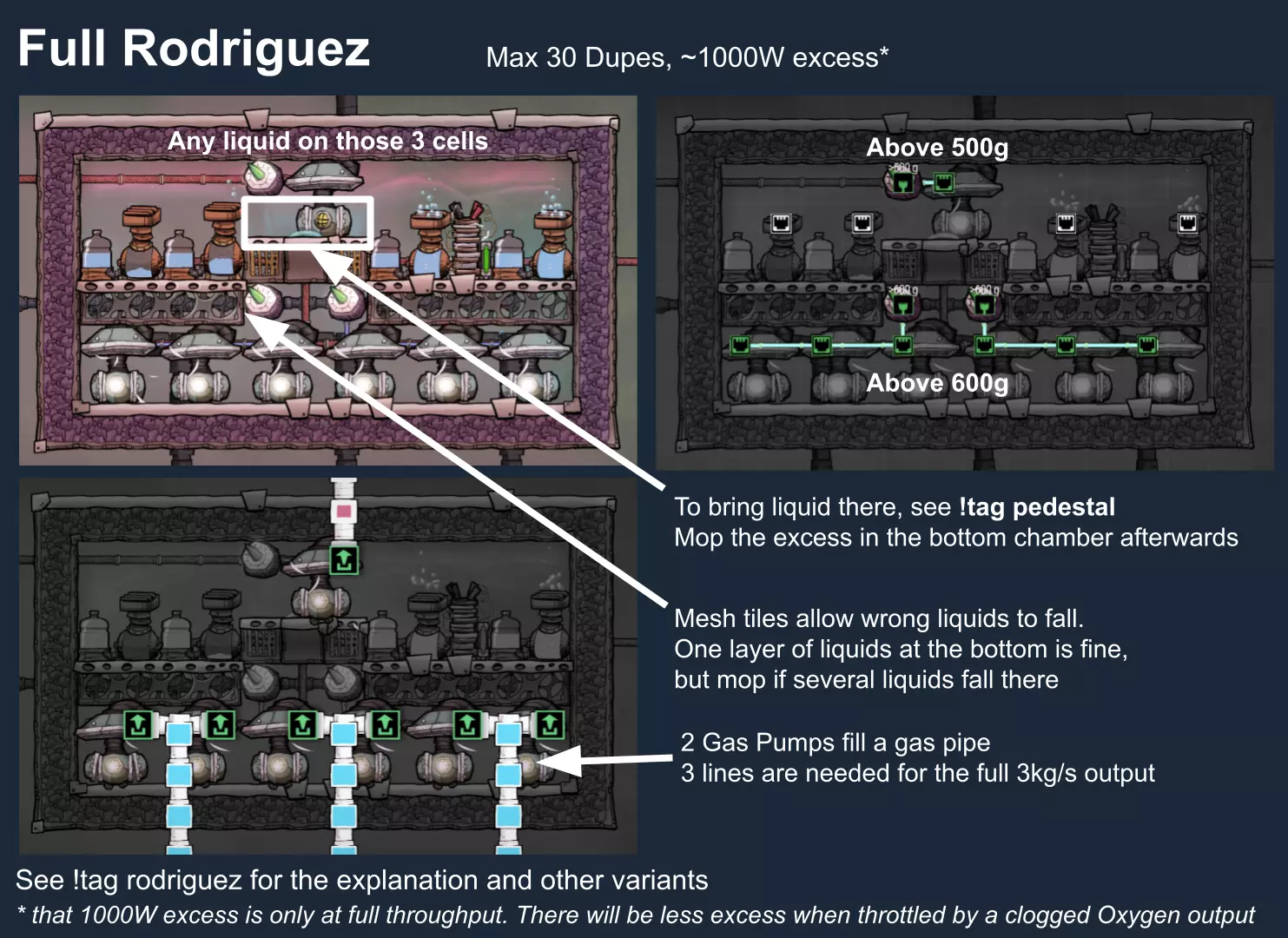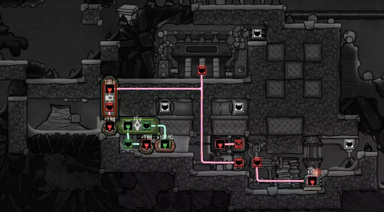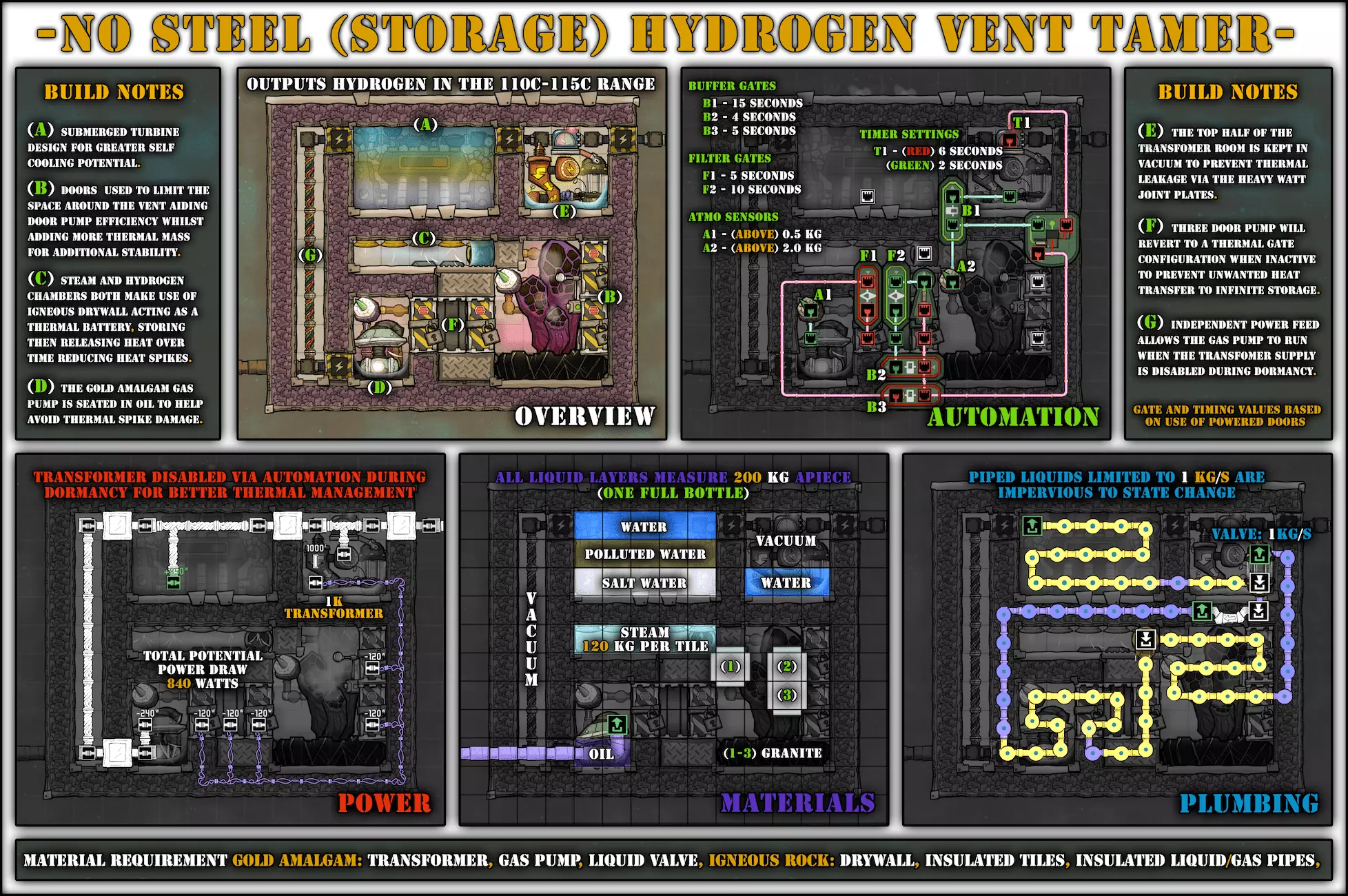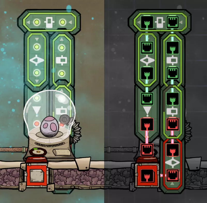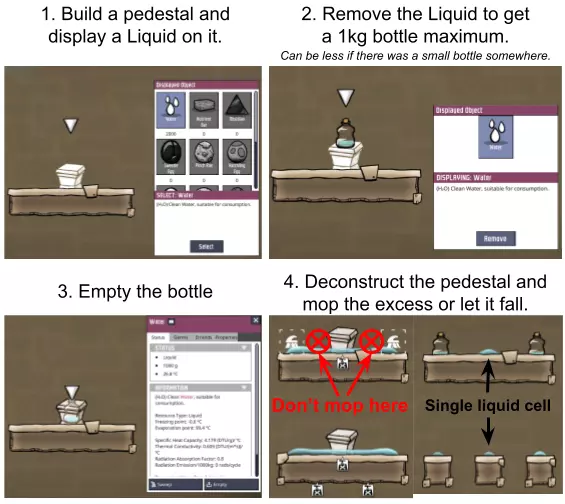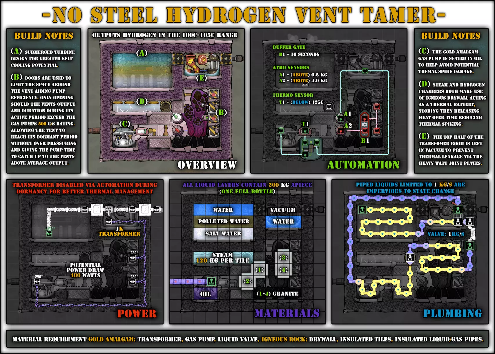 特定于《缺氧:眼冒金星》DLC的建造方案将以此图标标记。它们要么使用了《缺氧:眼冒金星》中的间歇泉、兴趣点,要么是为了解决原版游戏中不存在的问题(主要是没有浮土从天而降,导致过滤介质不像原版那样随处可见)。 免责声明:虽然我认为这些建造方案都很棒,但我并未实际建造过所有方案。如果在使用某个建造方案时遇到问题,请前往非官方ONI Discord获取帮助(希望原作者能亲自解答)。我会尽力注明自这些方案设计以来可能发生的任何变化(旧bug已修复、新bug出现等)。摘要 所有建造方案的快速链接(主要用于直接分享建造方案链接,因为Steam摘要不支持锚点): 电解器:罗德里格斯方案 电解器:九头蛇方案 除臭器 冷却蒸汽喷口:小丑帽方案 盐水喷泉:无限盐调谐器方案 污染水喷泉:蒸发调谐器方案 污染氧气喷口:奇尔特方案 氢气喷口 金属火山 漏油裂隙 硫磺喷泉:硫磺石方案 自动溺毙pez分配器 drecko pacu:pacubox 3方案孵化器自动化:SSAI 8名复制人自给自足基地:麻辣豆腐 bunkhouse 24名复制人核心基地 液氧/液氢:集成火箭燃料补给器 酸气锅炉 实验52B:Exspilement 石脑油生产 建造方法 虽然我假设大家对游戏机制有较好的熟悉度,但我还是会先介绍一些非常实用的建造方法,这些方法是构建部分设计所必需的。 关于建造材料 在展示建筑时,一个常见的问题是“使用了什么材料?”。 要详细说明本合集中每个建筑使用的所有材料是不现实的。 对于有主要文章的建筑,作者通常会在文章中详细说明这些材料。对于其他情况,合理选择材料即可: 任何需要隔热的结构都应使用火成岩建造(基性岩效果同样好)。 例外1:若要接触岩浆或温度超过1400°C的环境,请使用黑曜石。 例外2:强烈建议蒸汽轮机的基座使用陶瓷,因为蒸汽轮机与其基座会进行热交换。 辐射液体管道应使用铜、铁或金建造(它们的特性基本相同)。由于铝并非所有地图都有且性能更优,因此被视为太空材料。 辐射气体管道应使用铜矿或铁矿建造。在《缺氧:眼冒金星》中,钴矿同样适用。 液冷机的冷却液为污染水。超级冷却液效果更好,但它是一种太空材料,而大多数建造方案都以进入太空前为目标。在《缺氧:太空之旅》中,核废料也比污染水更好用。 具有过热温度的建筑(如泵),若处于75°C至125°C的环境中,应使用金汞齐(若使用金属矿石)或铜、铁、金(若使用精炼金属)建造。若环境温度在125°C以上,则应改用钢。 一般来说,建造方案分为三类: 1. 可在极早期建造,因为它们不需要钢或塑料。 2. 可在较早阶段建造,因为它们需要钢或塑料。 3. 只能在后期建造,因为它们需要太空材料:铝、超级冷却液、导热质或黏菌凝胶。大多数配装至少会尝试属于第二类,因为大量使用太空材料会严重限制配装的使用场景,而且配装是否使用塑料(比如有蒸汽轮机)或钢材(比如有建筑在125°C以上的大气环境中会过热)是很明显的。 因此,我只会在某些配装需要太空材料时特别说明。 【单格液体基座】 许多设计会在特定位置使用一格低质量液体。 要实现这一点,你可以使用抽水机和倒瓶器组合,来输送200千克的瓶子。不过这样做之后,你会留下大量多余的液体需要清理。相反,当你需要在特定单元格中放置少量液体(例如用于液体气闸)时,你可以在那里建造一个基座,指定一种液体(必须有可用的手动泵或该类型的瓶子),复制人会带来最多1千克的瓶装液体。
