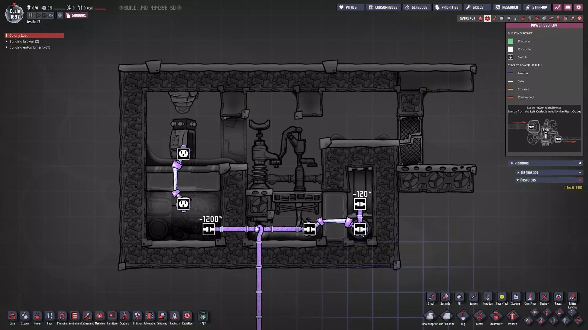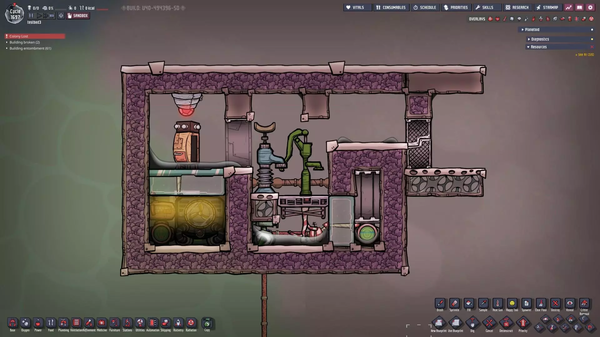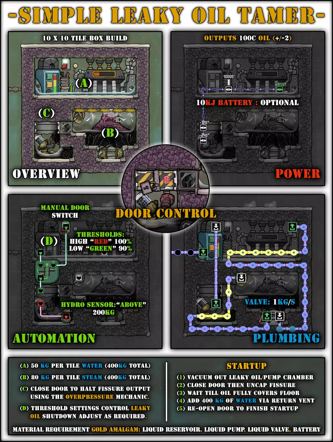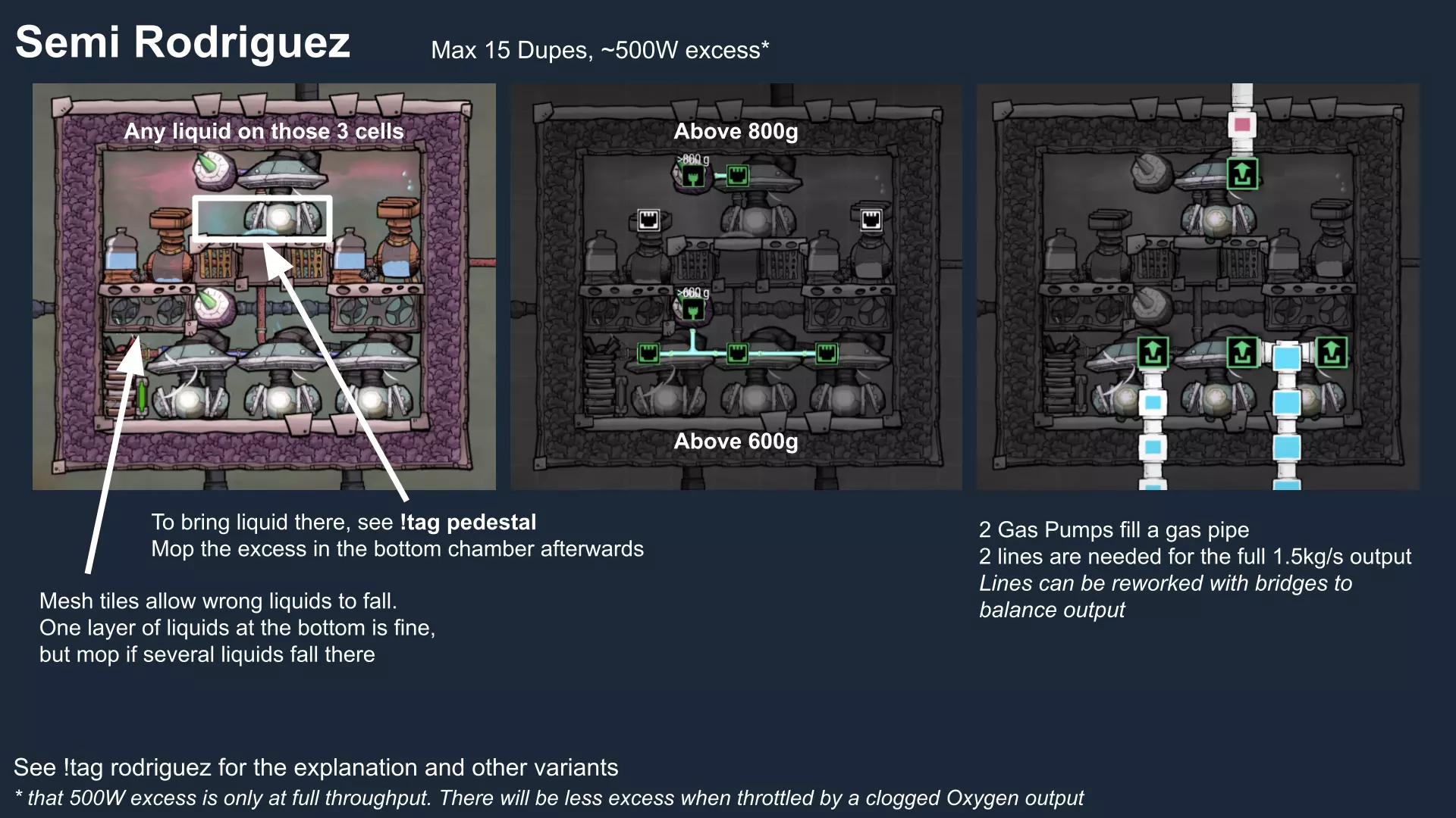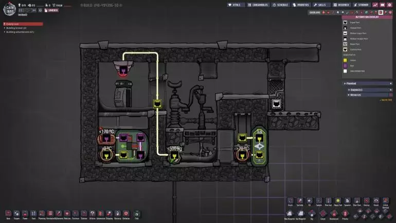 特定于《缺氧:眼冒金星》DLC的建造方案将以此图标标记。它们要么使用了《缺氧:眼冒金星》中的间歇泉、兴趣点,要么是为了解决原版游戏中不存在的问题(主要是没有浮土从天而降,导致过滤介质不像原版那样随处可见)。 免责声明:虽然我认为这些建造方案都很棒,但我并未实际建造过所有方案。如果在使用某个建造方案时遇到问题,请前往非官方ONI Discord获取帮助(希望原作者能亲自解答)。我会尽力注明自这些方案设计以来可能发生的任何变化(旧bug已修复、新bug出现等)。摘要 所有建造方案的快速链接(主要用于直接分享建造方案链接,因为Steam摘要不支持锚点): 电解器:罗德里格斯方案 电解器:九头蛇方案 除臭器 冷却蒸汽喷口:小丑帽方案 盐水喷泉:无限盐调谐器方案 污染水喷泉:蒸发调谐器方案 污染氧气喷口:奇尔特方案 氢气喷口 金属火山 漏油裂隙 硫磺喷泉:硫磺石方案 自动溺毙pez分配器 drecko pacu:pacubox 3方案孵化器自动化:SSAI 8名复制人自给自足基地:麻辣豆腐 bunkhouse 24名复制人核心基地 液氧/液氢:集成火箭燃料补给器 酸气锅炉 实验52B:Exspilement 石脑油生产 建造方法 虽然我假设大家对游戏机制有较好的熟悉度,但我还是会先介绍一些非常实用的建造方法,这些方法是构建部分设计所必需的。 关于建造材料 在展示建筑时,一个常见的问题是“使用了什么材料?”。 要详细说明本合集中每个建筑使用的所有材料是不现实的。 对于有主要文章的建筑,作者通常会在文章中详细说明这些材料。对于其他情况,合理选择材料即可: 任何需要隔热的结构都应使用火成岩建造(基性岩效果同样好)。 例外1:若要接触岩浆或温度超过1400°C的环境,请使用黑曜石。 例外2:强烈建议蒸汽轮机的基座使用陶瓷,因为蒸汽轮机与其基座会进行热交换。 辐射液体管道应使用铜、铁或金建造(它们的特性基本相同)。由于铝并非所有地图都有且性能更优,因此被视为太空材料。 辐射气体管道应使用铜矿或铁矿建造。在《缺氧:眼冒金星》中,钴矿同样适用。 液冷机的冷却液为污染水。超级冷却液效果更好,但它是一种太空材料,而大多数建造方案都以进入太空前为目标。在《缺氧:太空之旅》中,核废料也比污染水更好用。 具有过热温度的建筑(如泵),若处于75°C至125°C的环境中,应使用金汞齐(若使用金属矿石)或铜、铁、金(若使用精炼金属)建造。若环境温度在125°C以上,则应改用钢。 一般来说,建造方案分为三类: 1. 可在极早期建造,因为它们不需要钢或塑料。 2. 可在较早阶段建造,因为它们需要钢或塑料。 3. 只能在后期建造,因为它们需要太空材料:铝、超级冷却液、导热质或黏菌凝胶。大多数配装至少会尝试属于第二类,因为大量使用太空材料会严重限制配装的使用场景,而且配装是否使用塑料(比如有蒸汽轮机)或钢材(比如有建筑在125°C以上的大气环境中会过热)是很明显的。 因此,我只会在某些配装需要太空材料时特别说明。 【单格液体基座】 许多设计会在特定位置使用一格低质量液体。 要实现这一点,你可以使用抽水机和倒瓶器组合,来输送200千克的瓶子。不过这样做之后,你会留下大量多余的液体需要清理。相反,当你需要在特定单元格中放置少量液体(例如用于液体气闸)时,你可以在那里建造一个基座,指定一种液体(必须有可用的手动泵或该类型的瓶子),复制人会带来最多1千克的瓶装液体。