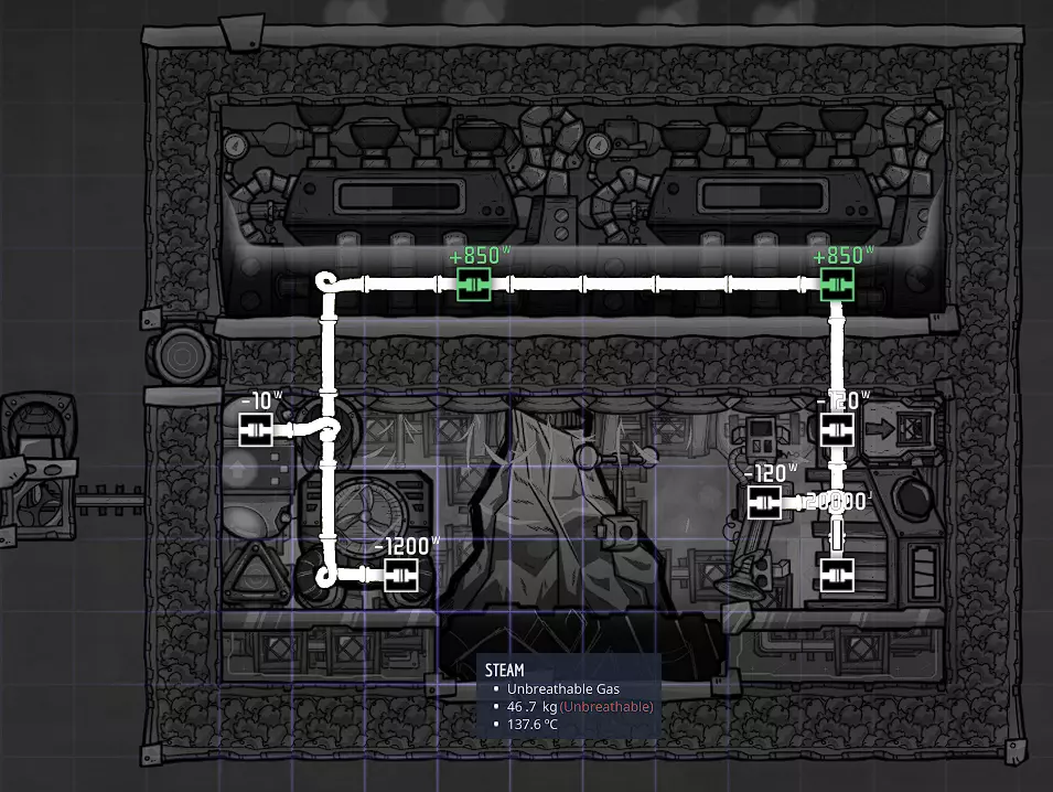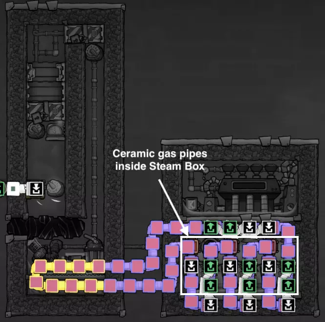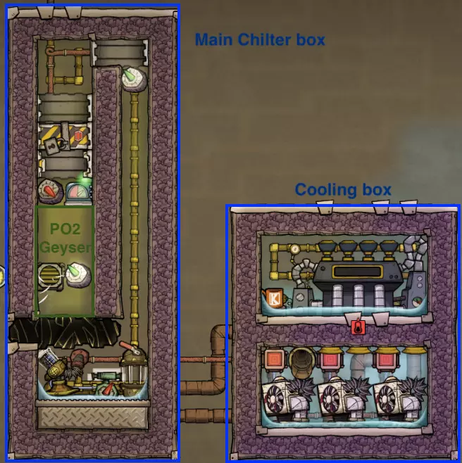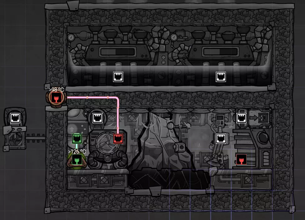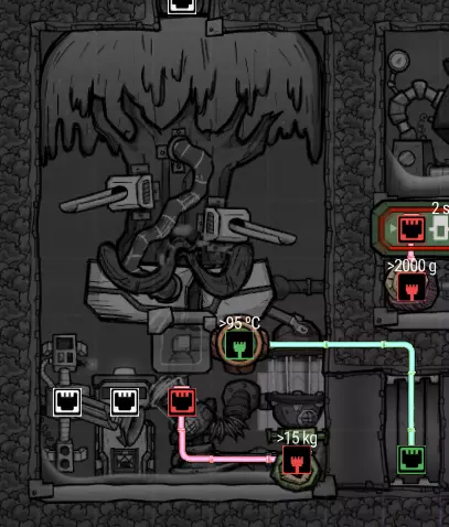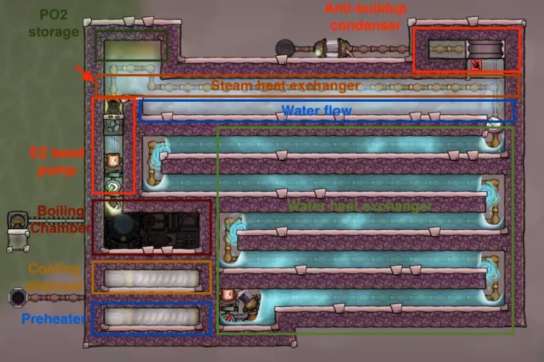 污染水间歇泉的温度要么是30°C(污染水喷口),要么是-10°C(冷泥间歇泉),这意味着需要大量热量才能使其蒸发。为了大幅降低热量需求,你必须使用逆流热交换器,这在我的后期游戏指南中有更详细的说明。 高效煮沸水还有一些注意事项,为此你需要一些额外的装置: - 预热器:用于输入水温度低于0°C的情况,以防止输出水冻结。 - 逆流热交换器:同时处理蒸汽和水。 - 热桥:当蒸汽上升到蒸汽段末端时,强制蒸汽冷凝。 - 水珠泵:将蒸汽从沸腾室移走。 - 污染氧室:用于初始化。总的来说,它的性能与水筛+岩石破碎机方案非常接近,同时省去了复制人的劳动力,但建设成本极高。