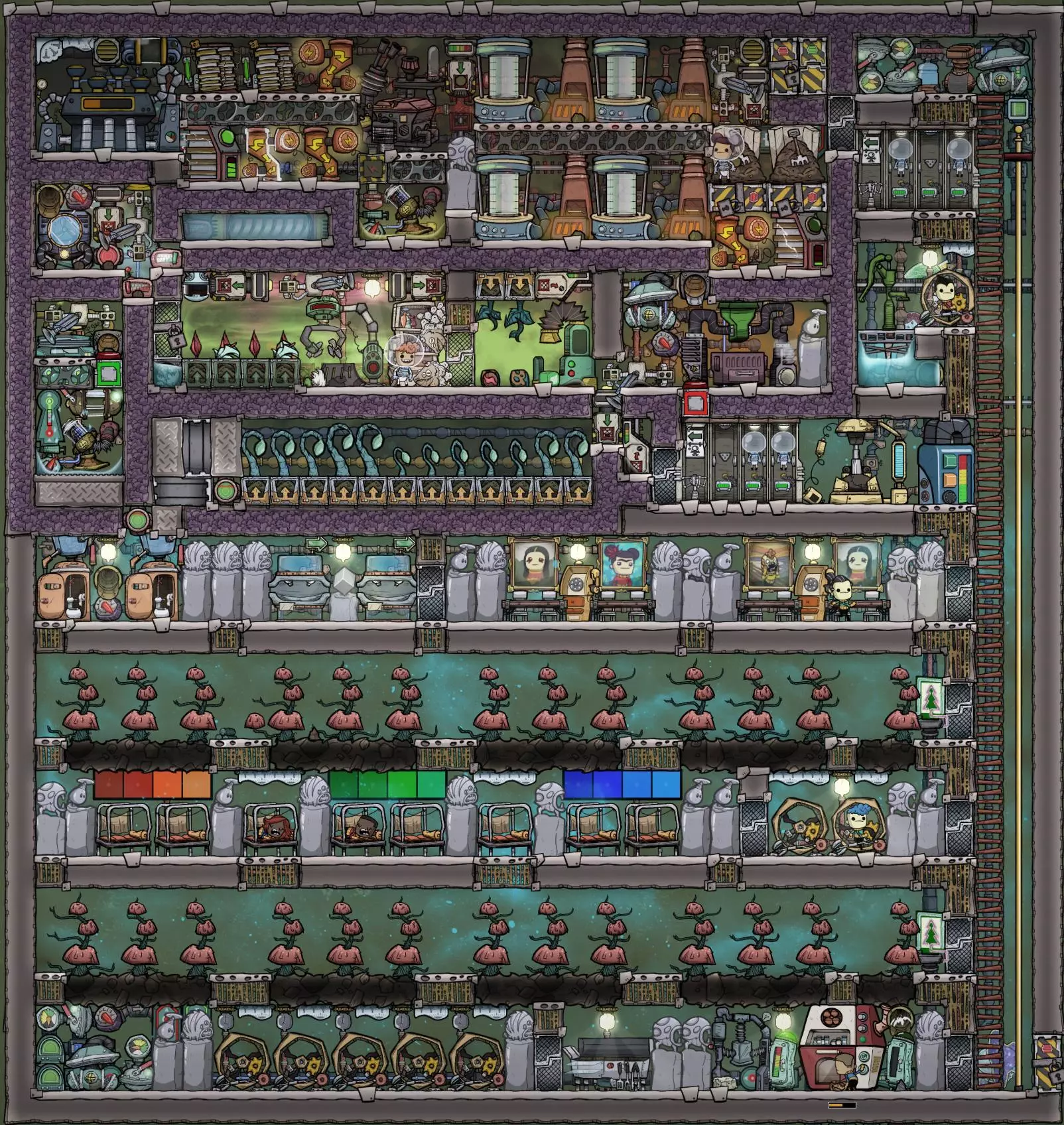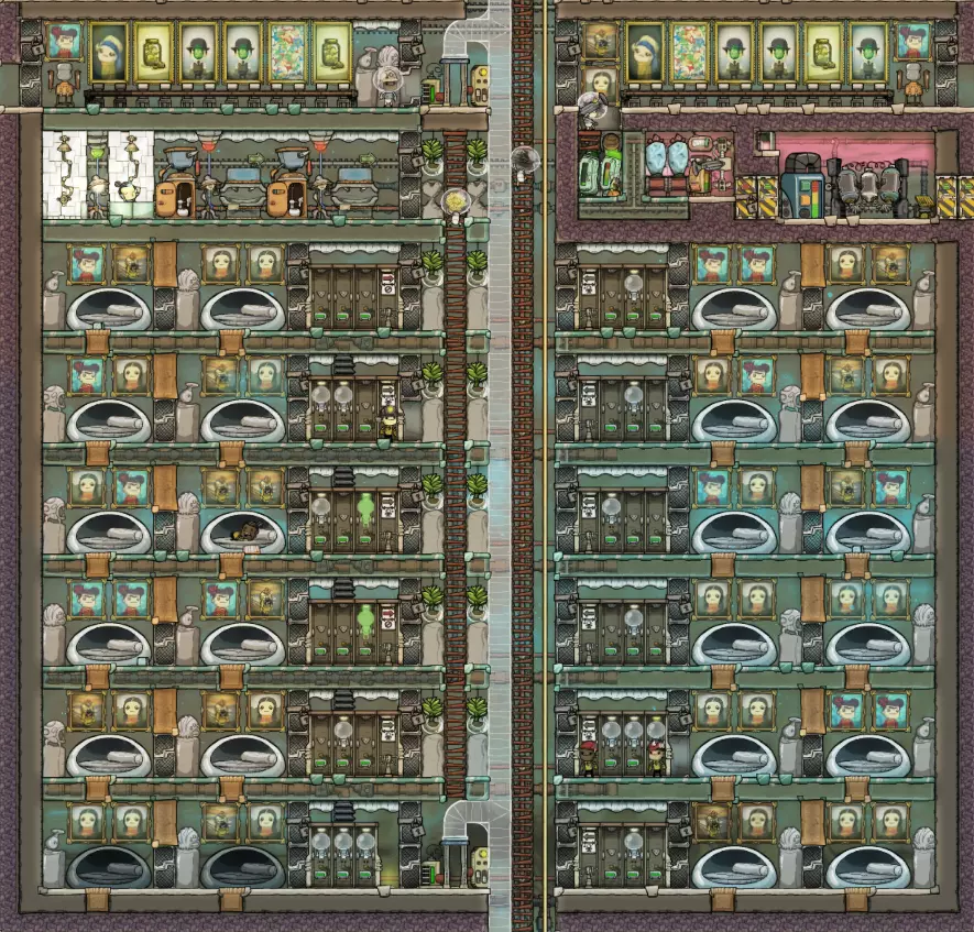 > 24复制人核心基地 目标:容纳24名复制人,并配备所有基础设施(食物、厕所、永久套装) 作者:Fradow 输入:食物、氧气、过滤介质 输出:24名快乐的复制人 这是一个专注于通过大量装饰以及让复制人几乎全程穿着 atmosuit(除睡眠时外)来保持他们心情愉悦的基地。每2名复制人配备3套 atmosuit,以避免当某个复制人刚挂好套装去睡觉时出现“被困”警报。 深度冷冻装置的设置略显笨拙,因为它是在Mergedown更新后才进行的改造,并非最初规划的一部分。 基地中还有一些细节可以改进,但总体而言,通过将所有核心需求区域集中在一起,很好地缩短了移动时间。