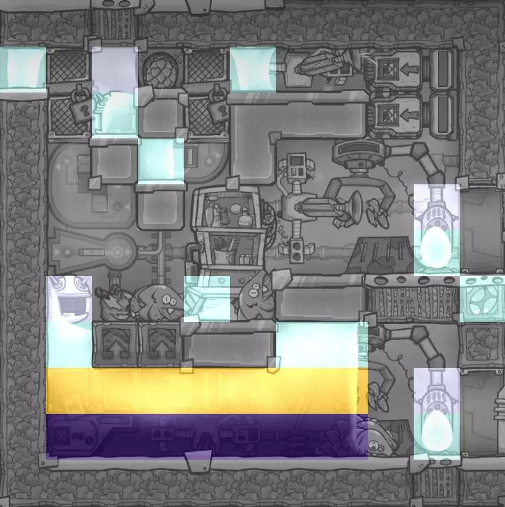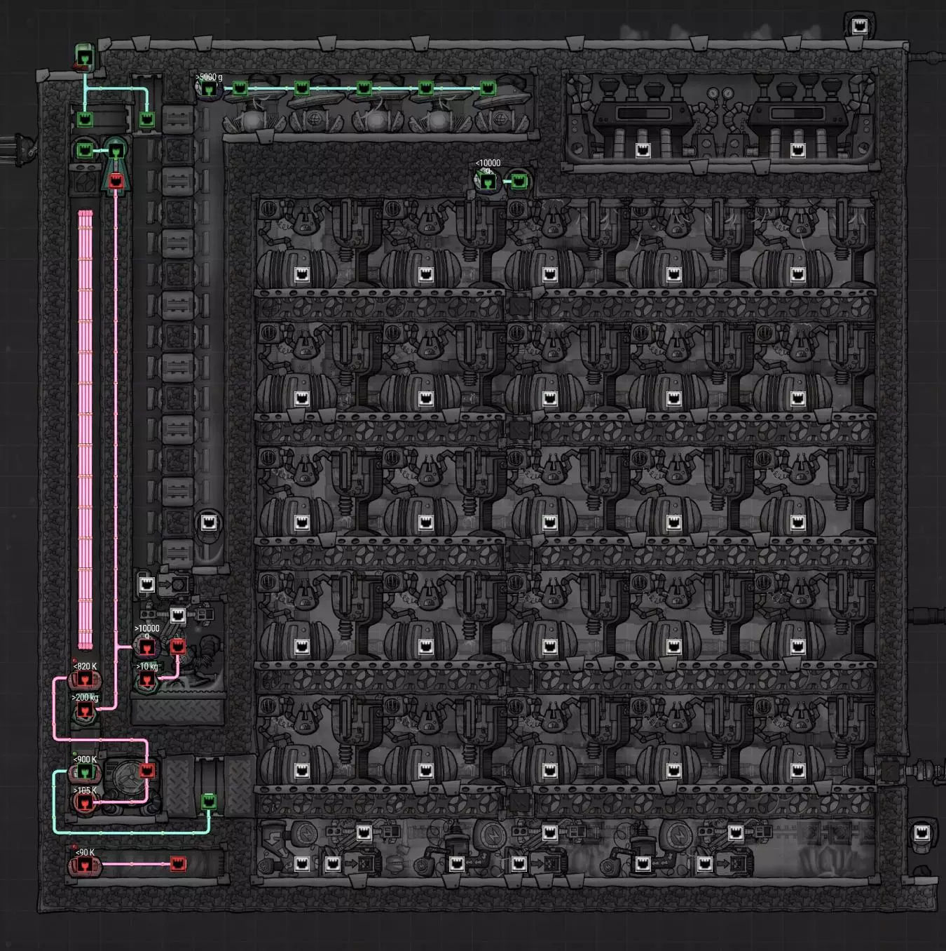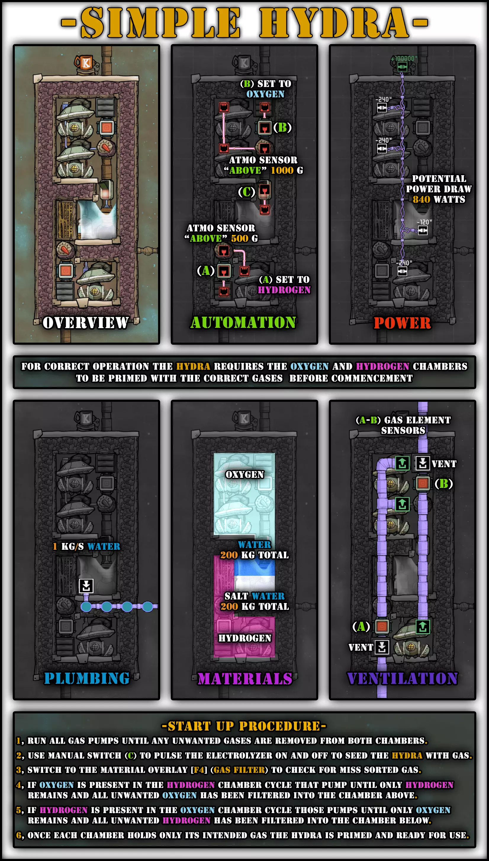 由于液体互不相溶,你可以通过液体排空器一层一层地堆叠它们,从最重的液体到最轻的液体依次操作。 右侧已包含一张最常见液体的图表。 这在多种应用场景中都很有用,例如: - 无需预先抽真空即可创建蒸汽室。 - 在自冷式蒸汽轮机上使用少量液体进行热交换。 - 在孵化器中自动淹死生物。 - 创建高级液体气闸。 - 覆盖电解器(九头蛇设计)的所有单元格。 - 以及更多用途…… 【抽真空房间】 当你尝试给房间抽真空时,第一反应可能是添加气体泵。虽然气体泵在能抽取满包气体时效率很高,但实际上它们并不太适合给房间抽真空。在稀薄大气中,迷你抽气泵只需消耗四分之一的电力就能抽取等量的气体。更重要的是,迷你抽气泵能够触及它所覆盖的所有单元格,而普通抽气泵无法触及其覆盖区域右上角的单元格。这意味着用迷你抽气泵来抽真空一个房间,会比使用普通抽气泵快得多。 不过,还有一种更好的方法,它不需要消耗电力,而是依靠复制人的劳动力:用瓷砖铺满整个区域,直到完全覆盖且不再有气体残留。在入口处添加液体气闸后,你可以拆除这些瓷砖,从而获得真空环境。 另一种替代方法,例如建造蒸汽室时,可以采用上一节中介绍的方法,通过堆叠液体来驱离气体。从最重到最轻的水类型:浓盐水、盐水、污染水、普通水。 氧气生产 首先是氧气生产,主要方式是电解器,有两种广为人知的建造方案,以及一种不太知名但具有额外目标的方案。 电解器:罗德里格斯方案 目标:将水转化为氧气,同时实现自我供能 作者:某位名为罗德里格斯的人士(因此得名),由弗朗西斯·约翰推广,萨图努斯改进 输入:每个电解器约850克/秒的水(运行时间占比85%) 输出:每个电解器约750克/秒的氧气和250瓦电力 罗德里格斯方案的基本原理是利用气体的重量差异以及较轻气体无法下沉到仅由较重气体组成的区域(反之亦然)的特性,在大气中分离气体。这就无需再使用气体过滤器,并且通过正确配置大气传感器,气泵永远不会吸入不完整的气体包。这会为你带来电力盈余。 这意味着在启动此装置时,气泵可抽取的储气单元中必须只含有它们应抽取的气体:顶部一排为氢气,底部两排为氧气。 以下是三种版本的预览说明:准自动化版、半自动化版和全自动化版。