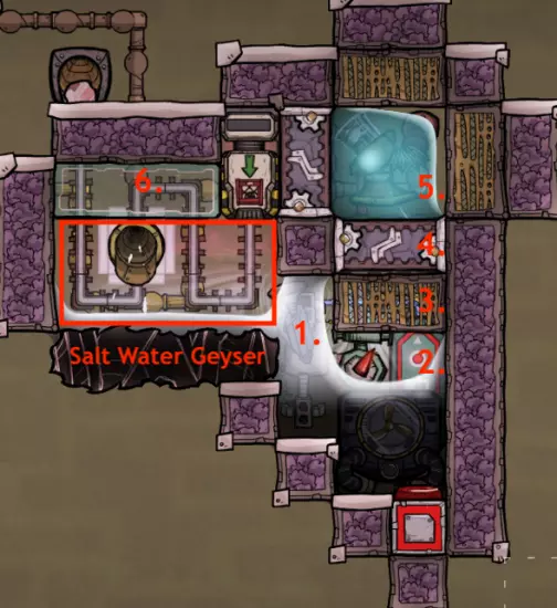 免责声明:此最新版本已知会删除部分蒸汽,低输出通风口约删除10%,高输出通风口约删除35%。目前尚无已知的解决方法。 盐水间歇泉:无限制盐器 目标:高效驯服盐水间歇泉以提取水 作者:Fradow,由Saturnus改进 输入:一个盐水间歇泉,普通间歇泉约需150瓦电力 输出:平均约1.5千克/秒的水,存储量无限 由于盐水间歇泉输出95°C的盐水,将其蒸发并立即重新冷凝为水的方式出奇地节能。这种方式比尝试使用蒸汽轮机或专用建筑脱盐器更节能,同时还省去了复制人的劳动力。