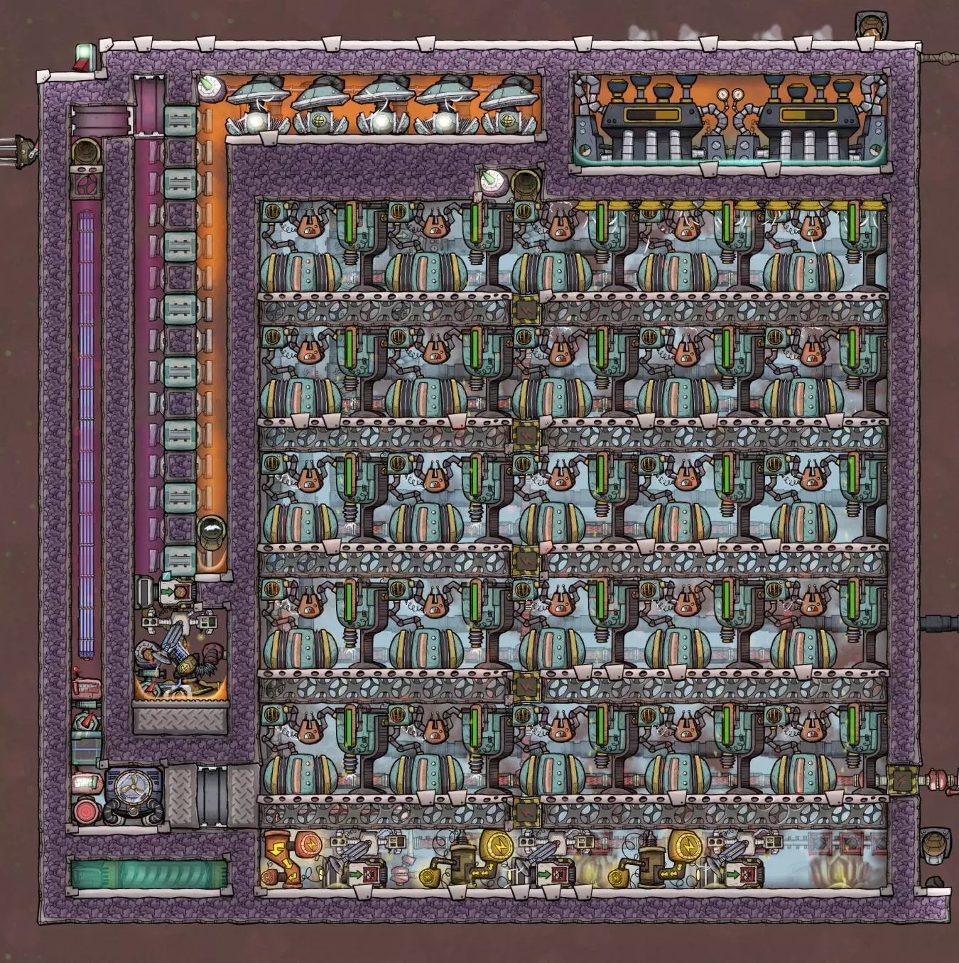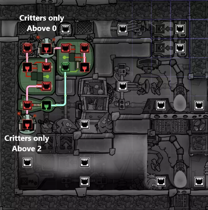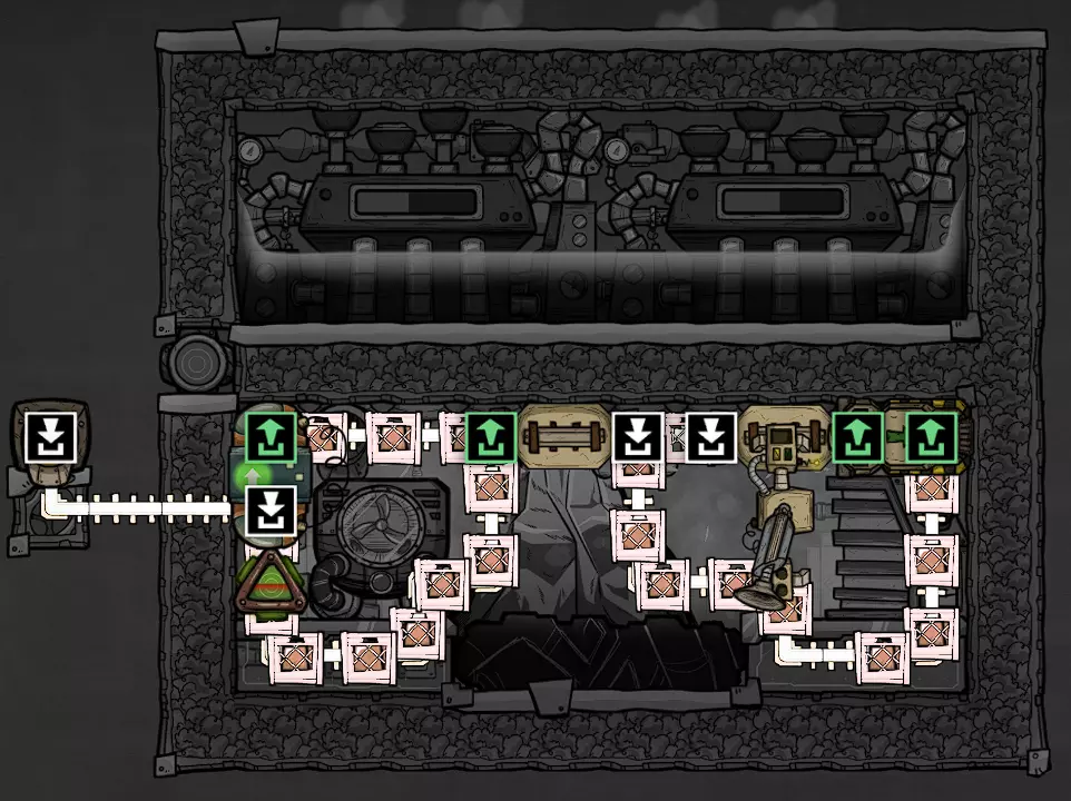 它不会自动控制门,这意味着让复制人进出房间是你的责任。实际建造中的大部分自动化复杂性都源于这一细节。 如果你让未穿宇航服的复制人进入,还需要在每侧各添加一个碳涤气器。 以下是完整的优化建造方案: