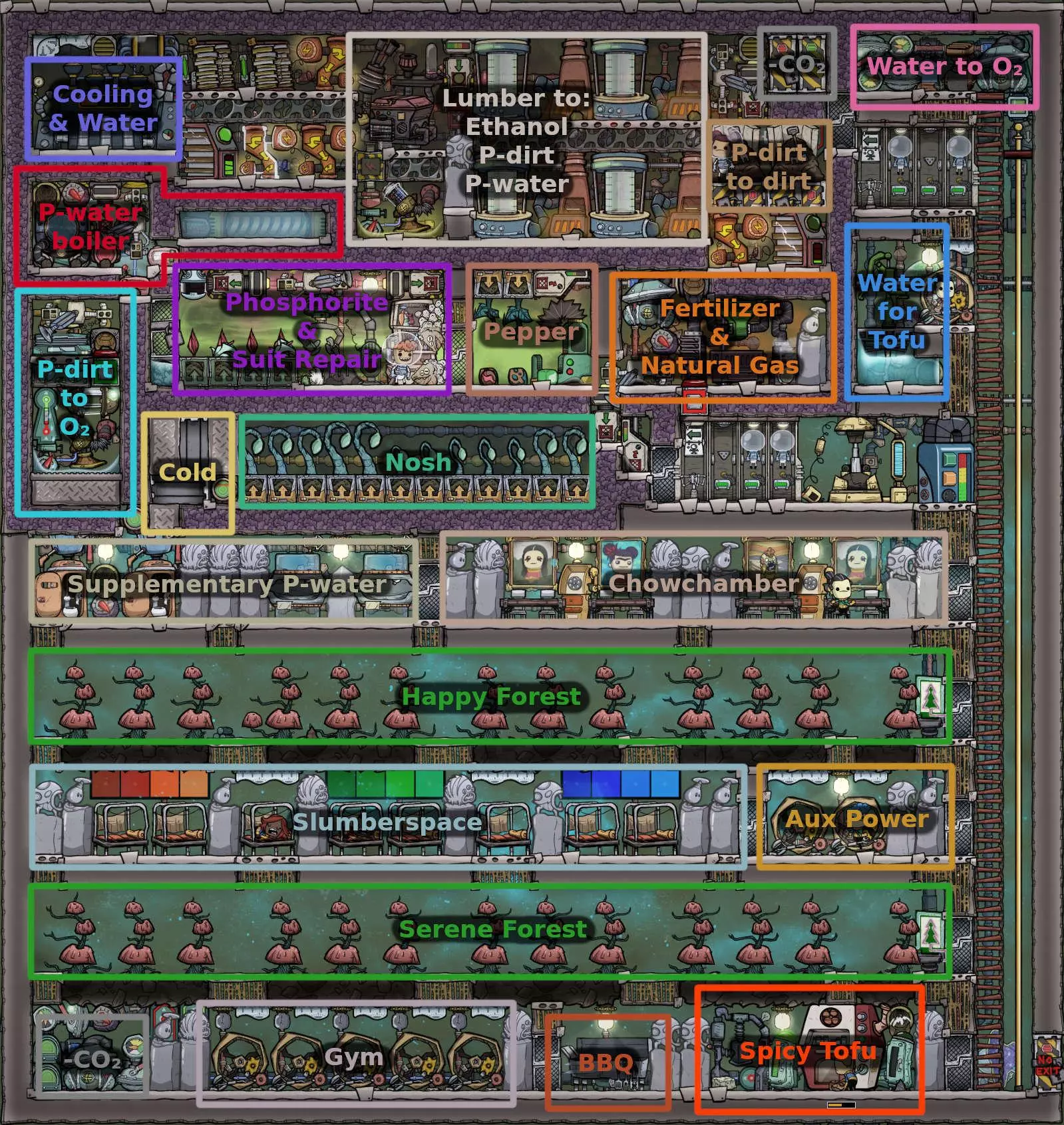 主要文章 目标:让8名复制人居住在一个完全自给自足的基地中 作者:Yobbo 输入:无 输出:少量水、氢气、磷矿、肥料、天然气,微量芦苇纤维、香蜂花、胡椒种子、诺什豆、烧烤、蛋壳。 以24棵野生种植的乔木树为基础构建乙醇循环(此处有26棵,额外2棵用于安全保障),通过将木材放入乙醇蒸馏器获得污染泥土和乙醇,再将乙醇放入石油发电机燃烧以获取电力和污染水,你可以得到750克/秒的污染水和1.33千克/秒的污染泥土。 该基地利用这种资源生成循环为基地供能,使用升华站处理污染泥土为复制人供氧,并通过多样化饮食为他们提供食物。它的尺寸为36x38格,包含墙壁在内。