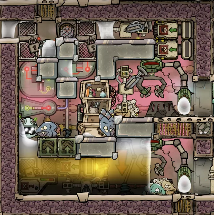 适用对象: - 舱门 - 滑鳞蜥 - 光虫(但需要更宽敞的牧场来种植树木) - drecko(但多余的 drecko 最好在氢气中进行饥饿养殖以剪取其鳞片) - 变异生物(《缺氧:太空服》)(但可能需要更宽敞的牧场来让它们与植物共处) 推 vole 不需要取出蛋,因为它们不会拥挤。 > drecko:dreckobox 目标:低劳动力的 drecko 稳定养殖场,用于生产芦苇纤维和塑料 作者:Ishamoridin 输入:种植食用树所需的泥土、复制人劳动力、剪毛站所需电力 输出:芦苇纤维、塑料、少量磷矿、肉、蛋壳 如果进行最大化优化,一个 drecko 养殖场只需要对繁殖期个体进行照料以及对所有 drecko 进行剪毛。由于复制人需要在工作站等待 drecko( drecko 是游戏中的一种生物)才能开始作业,因此你还需要尽量缩短 drecko 的移动路径。 要实现这一点,首先你要建造一个类似“pez 分配器”的装置,让 drecko 能够落入繁殖室或饥饿室(仅用于剪毛)。然后通过巧妙的液体放置来限制它们的移动路径。 最终成果就是这个“dreckobox”,它是 drecko 优化的巅峰之作,还配有一些彩蛋作为视觉点缀(气流瓷砖上方两种堆叠液体呈现出的特殊形状)。