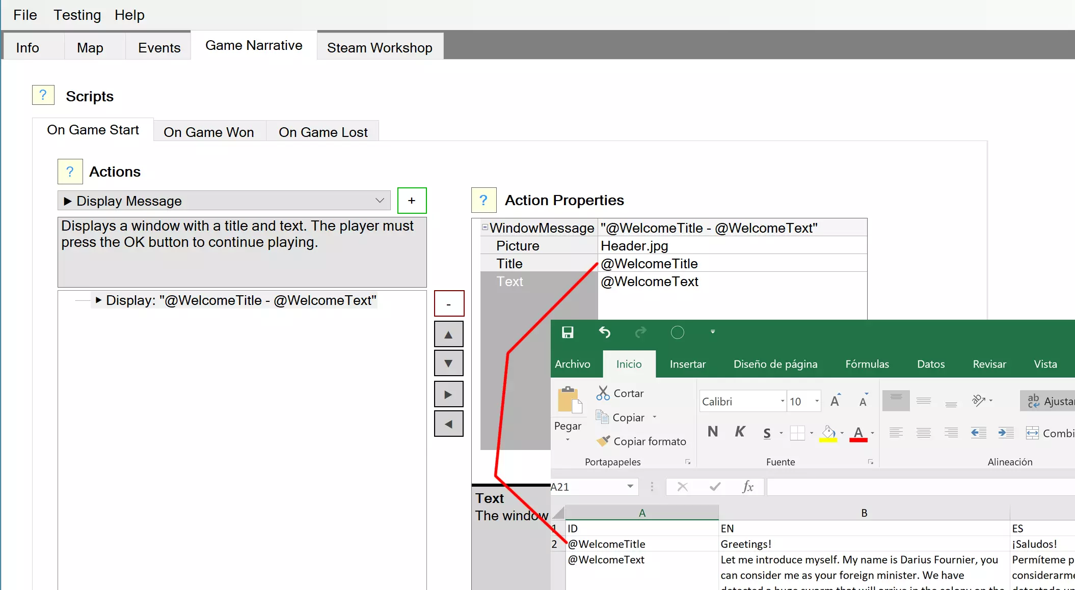 您可以以更有效的方式管理自定义级别中使用的字符串,并支持不同语言的本地化。这对于带有丰富叙事内容的关卡非常有用。 例如,您可能有多个消息使用完全相同的字符串(例如,“邻居送的礼物!”)。如果想要修改文本,就必须更改所有出现该文本的地方。使用此方法,您只需编写一个标识符(例如,“@GiftTitle”),实际文本将存储在一个独立的CSV文件中。 将文本放入CSV文件:在项目所在的文件夹中创建一个名为Strings.csv的文本文件。提交关卡时,该文件将与所有其他资源一同包含在内。您可以使用Excel、任何其他电子表格应用程序或记事本编辑Strings.csv文件。◆CSV结构 -CSV文件只是一个格式像表格的文本文件。每一行代表一行数据,每一列由“:”或“tab”字符分隔。 -第一行是列名。 -第一列使用ID。在本专栏中,您必须填写与自定义级别中使用的标识符相同的标识符。建议使用@符号以使其更清晰。 -其余列是您想要本地化关卡的语言。您可以在游戏中使用一种或多种语言。使用国家代码作为列名。 例如,如果您希望支持英语和西班牙语,CSV会像这样: ID; EN; ES @GiftTitle; A gift from your neighbors!; ¡Un regalo de tus vecinos!@Welcome;欢迎来到殖民地;Bienvenido a la colonia在脚本中引入的所有文本中,当游戏找到其中一个标识符时,它将被对应于玩家语言的文本所替换,或者使用英语条目(如果可用),或者如果不是第一语言。这包括脚本行动中的所有文本,以及关卡名称和信息标签的描述,因为它们也会出现在Steam上的玩家语言中。语言代码 Language Codes English = EN 英语 Spanish = ES 西班牙语 German = DE 德语 Russian = RU 俄语 French = FR 法语 Korean = KO 韩语 Italian = IT 意大利语 Japanese = JP 日语 Brazil = BR 巴西语 Portuguese = PT 葡萄牙语 Polish = PL 波兰语 Simplified Chinese = CHS 简体中文 Traditional Chinese = CHT 繁体中文 随机文本 Random Texts 也许您希望显示随机文本来丰富叙述。要做到这一点,可以很容易地获取您希望添加更多文本的条目,例如“@WelcomeText”,并添加多个ID以相同字符串开头的条目。例如:“@Welcometext1, @Welcometext2....."。当游戏查找几个以相同ID开始的条目,它将取一个随机的。使用这种方法,您可以节省大量时间。无需在脚本中创建大量随机动作来提供不同文本,只需创建一个条目,并将多个条目添加到csv文件中即可。 在每一个新游戏存档中,随机文本可以丰富故事情节,让玩家感到惊喜。例如,酒馆的周期性谣言、其他殖民地的新闻、殖民地事件等。 建议:温和对待玩家。英语应该是必要的,大多数非英语国家的玩家都能很好地理解英语并喜欢您的关卡。 如果您的母语包含在游戏中(例如意大利语),那么除了英语之外,您也可以将其添加到关卡中。这会让母语为该语言的玩家非常感激。翻译中文、日文和韩文都是极具挑战性的语言,但即便是自动翻译这些语言也比完全不翻译要好,这些玩家也会喜欢你的关卡。 高级:变量和函数(ZXCode) 注:本节仅供高级用户使用。