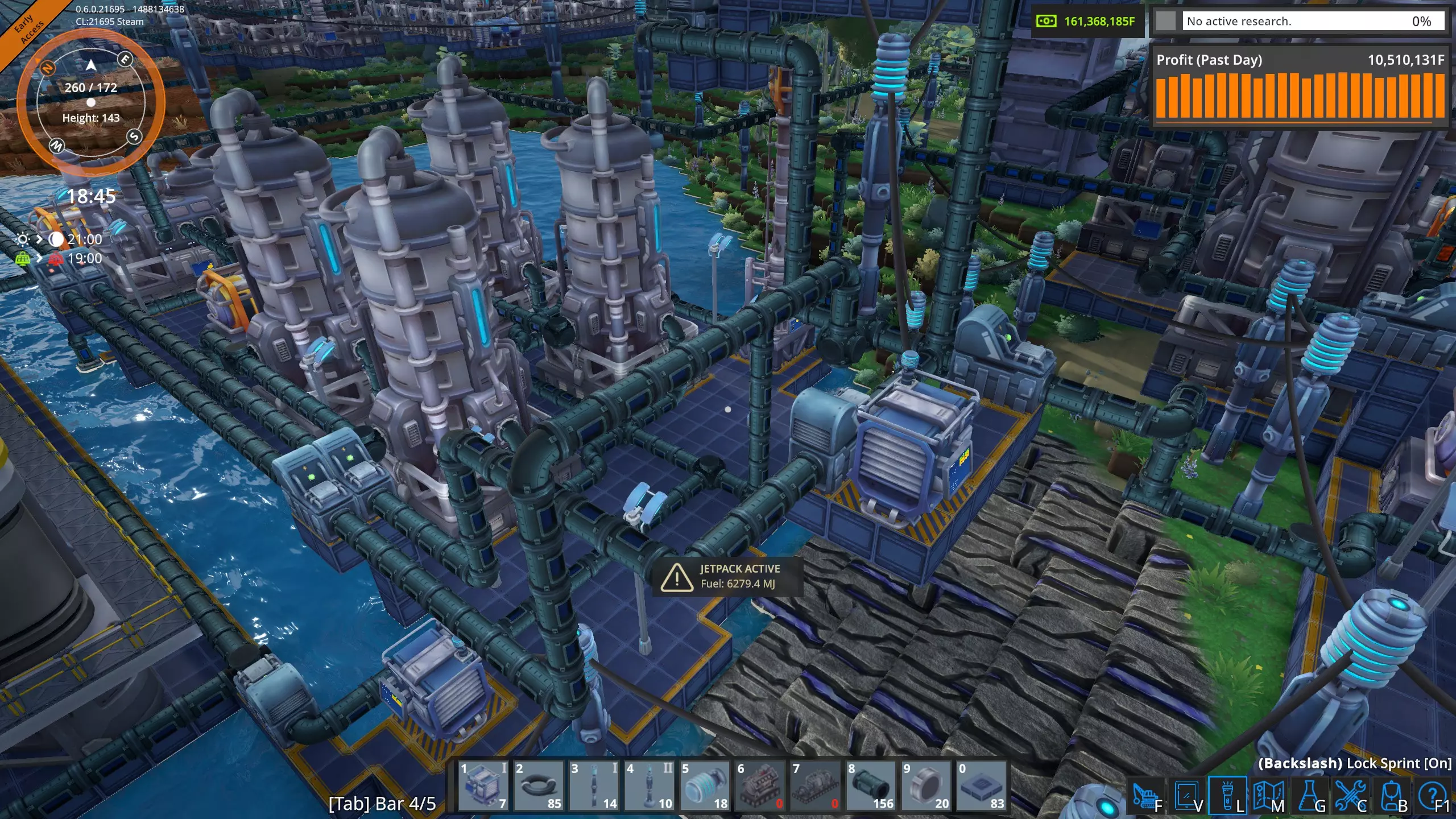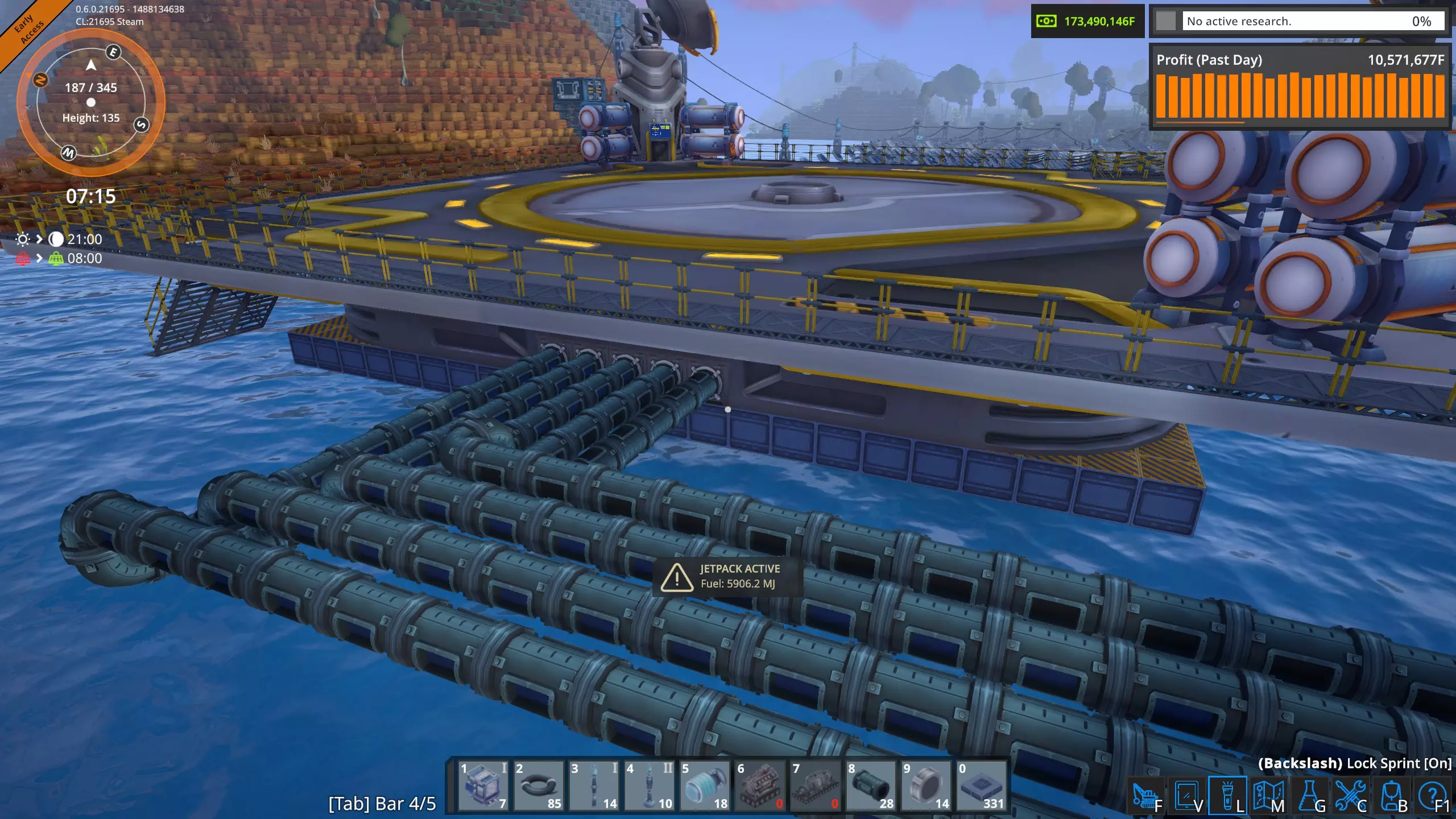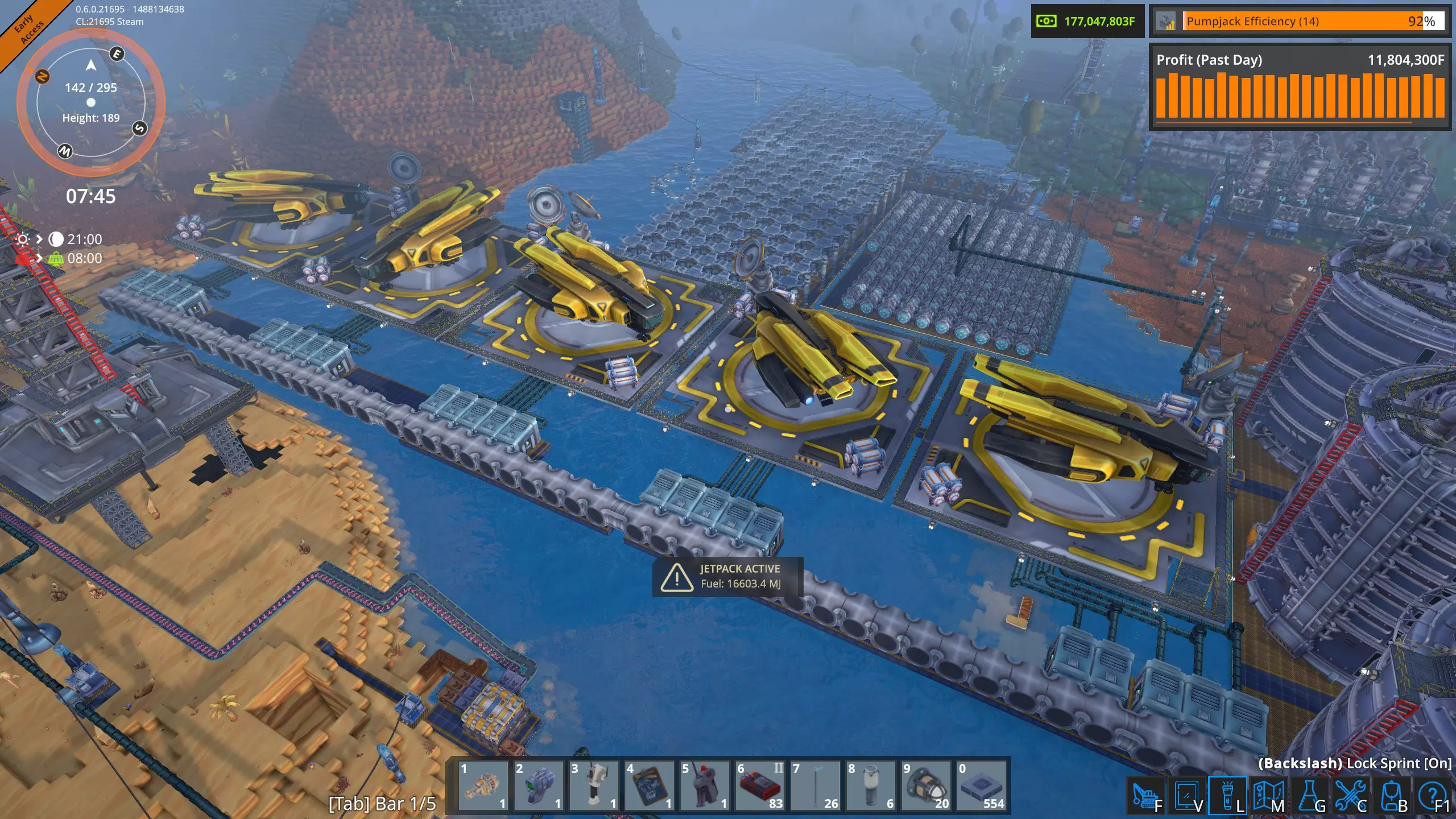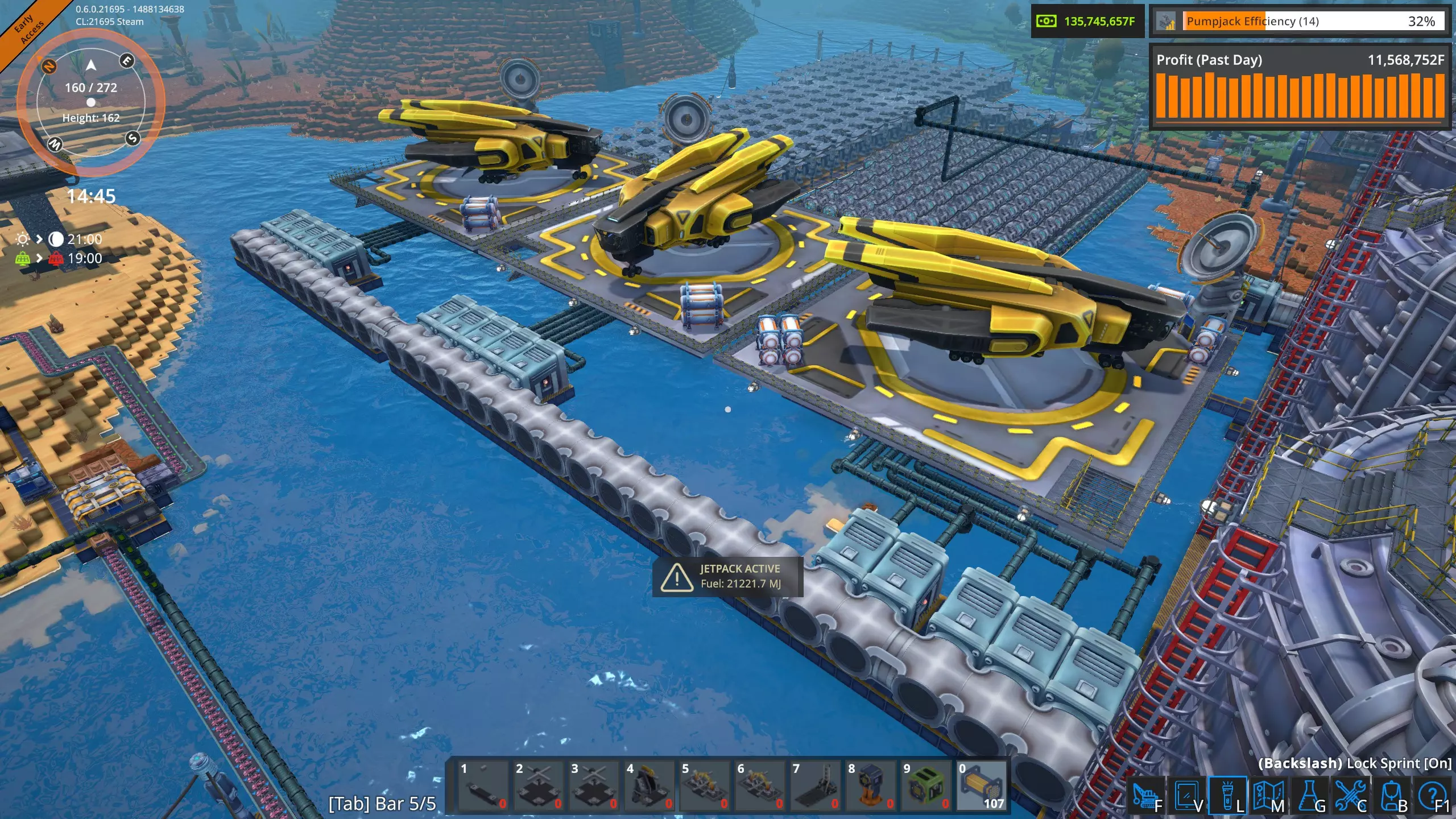 高速卸载 液态起始平台不需要每个平台配置五根管道。一个抽油机每分钟只能产出1800升,因此普通管道(36000吞吐量)可以处理20个抽油机,这比我在单个奥鲁米特矿床使用的数量要多。 因此,我将修正我的结论,并可以肯定地说,只要坚持不懈,确实可以通过空运为工厂供应奥鲁米特。 当前状况 经过几个小时的努力,我已经完全建立了奥鲁米特空运供应系统。