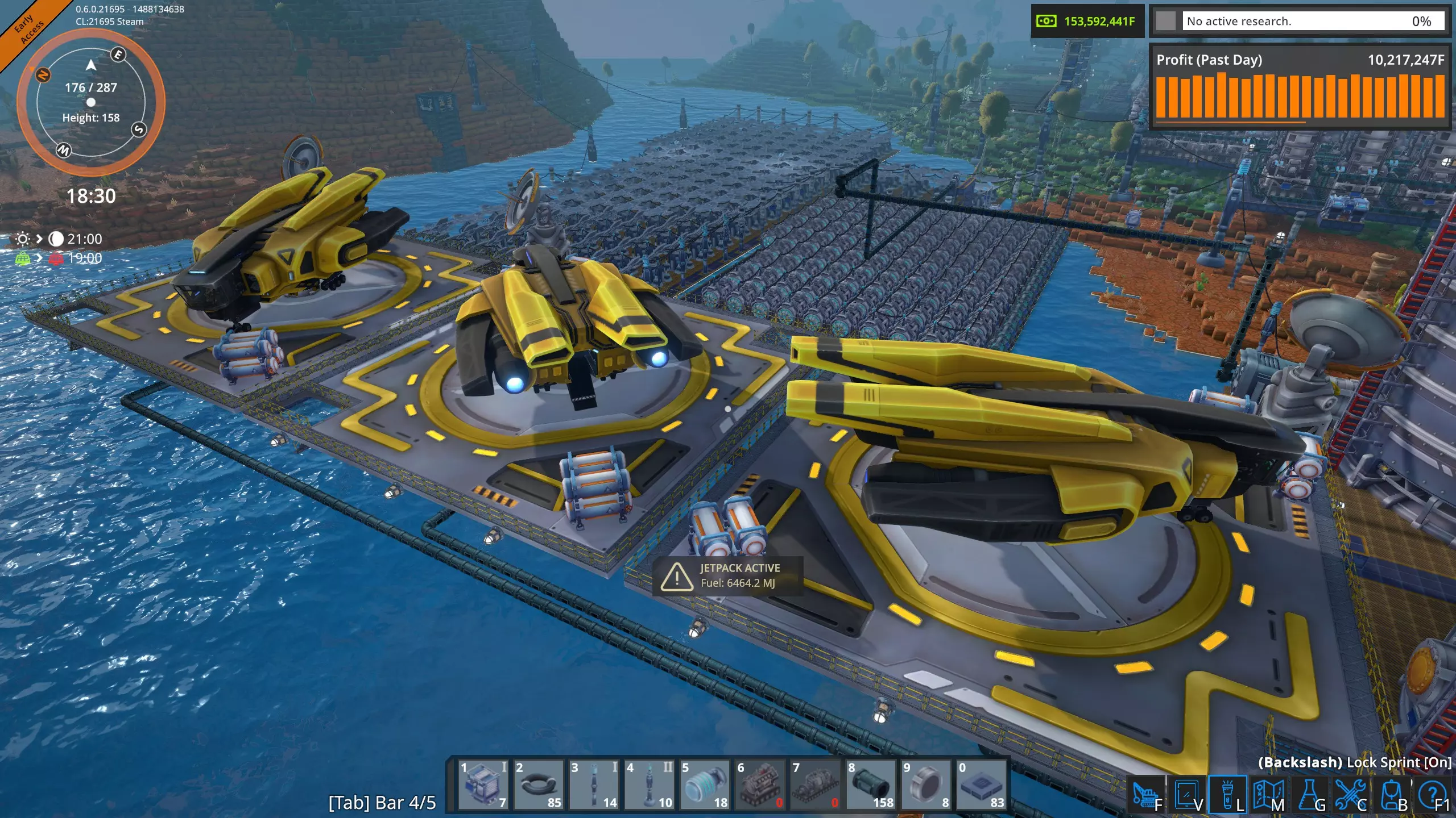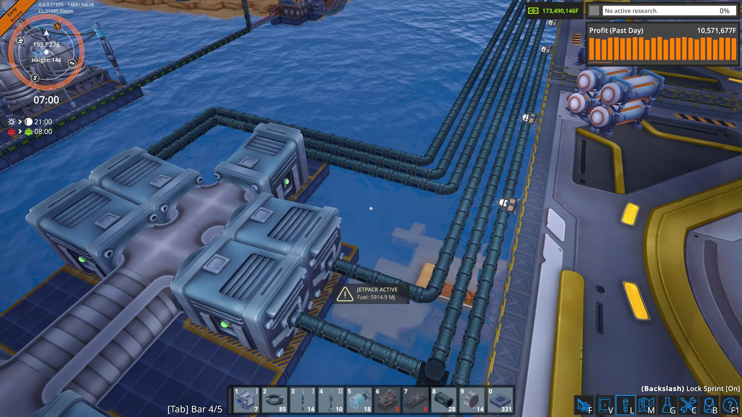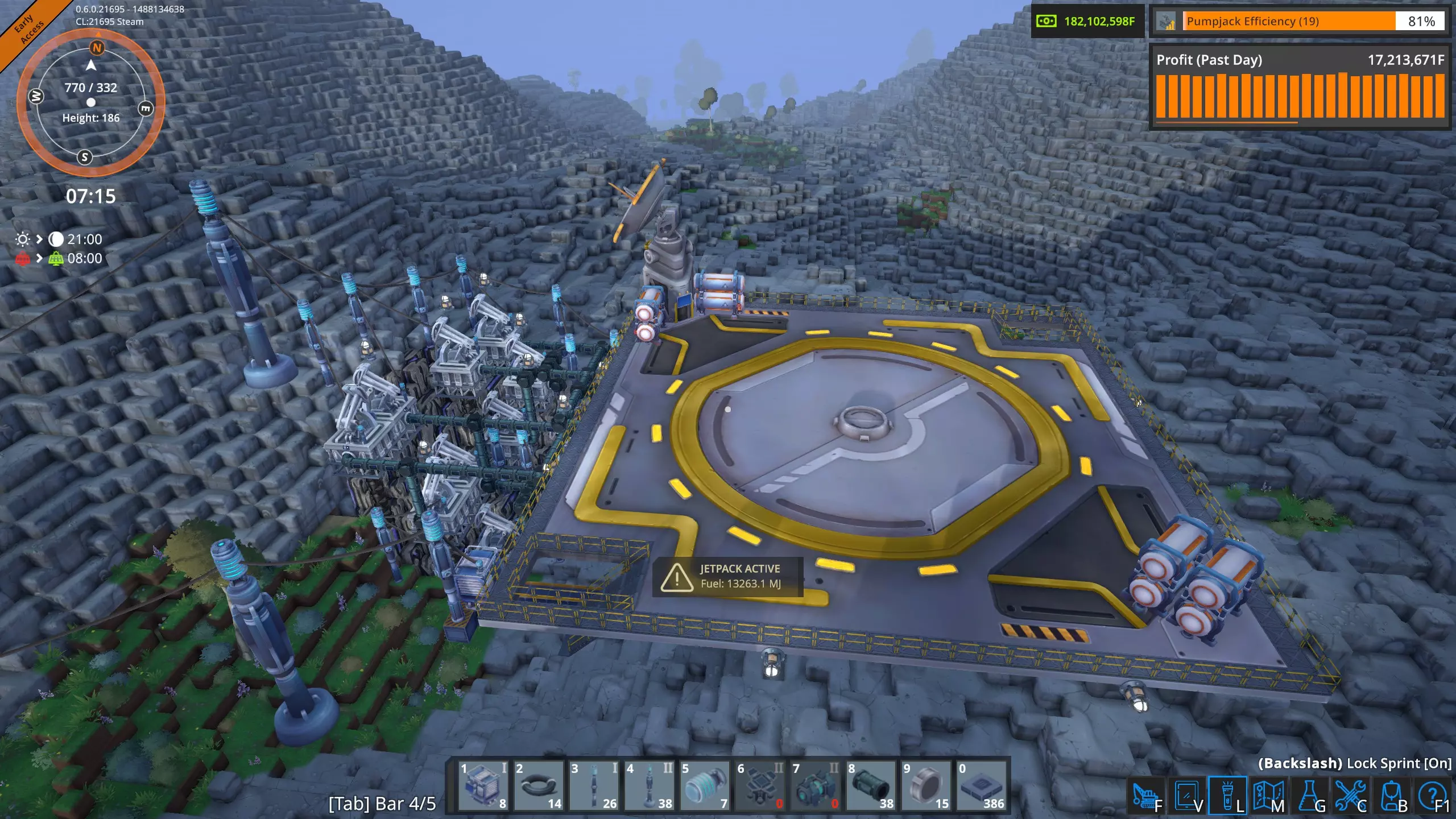 高速卸载 液态起始平台不需要每个平台配置五根管道。一个抽油机每分钟只能产出1800升,因此普通管道(36000吞吐量)可以处理20个抽油机,这比我在单个奥鲁米特矿床使用的数量要多。 因此,我将修正我的结论,并可以肯定地说,只要坚持不懈,确实可以通过空运为工厂供应奥鲁米特。 当前状况 经过几个小时的努力,我已经完全建立了奥鲁米特空运供应系统。