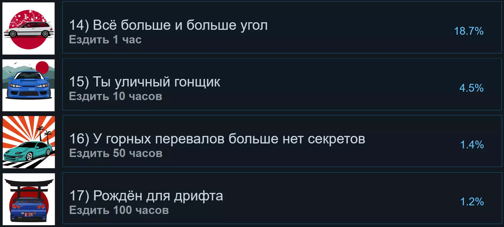 在很多游戏中都有类似的成就机制,只需在游戏中累计游玩特定时长即可解锁。不过我有个建议:我个人有5小时的游戏时长,但最初的5小时不知为何没有被记录。因此,我建议你刚开始游戏时,立即完成第一次豆腐配送。或许只有在完成这个操作后,计时才会开始。如果你的游戏时长仍未被统计,也可以尝试重新登录游戏。按Esc键即可查看。 [18-21] 金钱成就 游戏中自然存在以日本货币——日元¥形式呈现的金钱。 如何达成这些成就想必显而易见……就是积累特定数额的金钱,仅此而已。 正如我之前所述,金钱与经验值一样,您可以通过在与其他玩家的竞赛中获胜,以及成功完成豆腐配送任务来赚取。需要注意的是,要达成这些成就,并不需要你实际持有100,000日元。进度是按整个游戏内赚取的所有金钱来计算的。也就是说,你不必存钱,可以放心购买新车、改装车辆等。