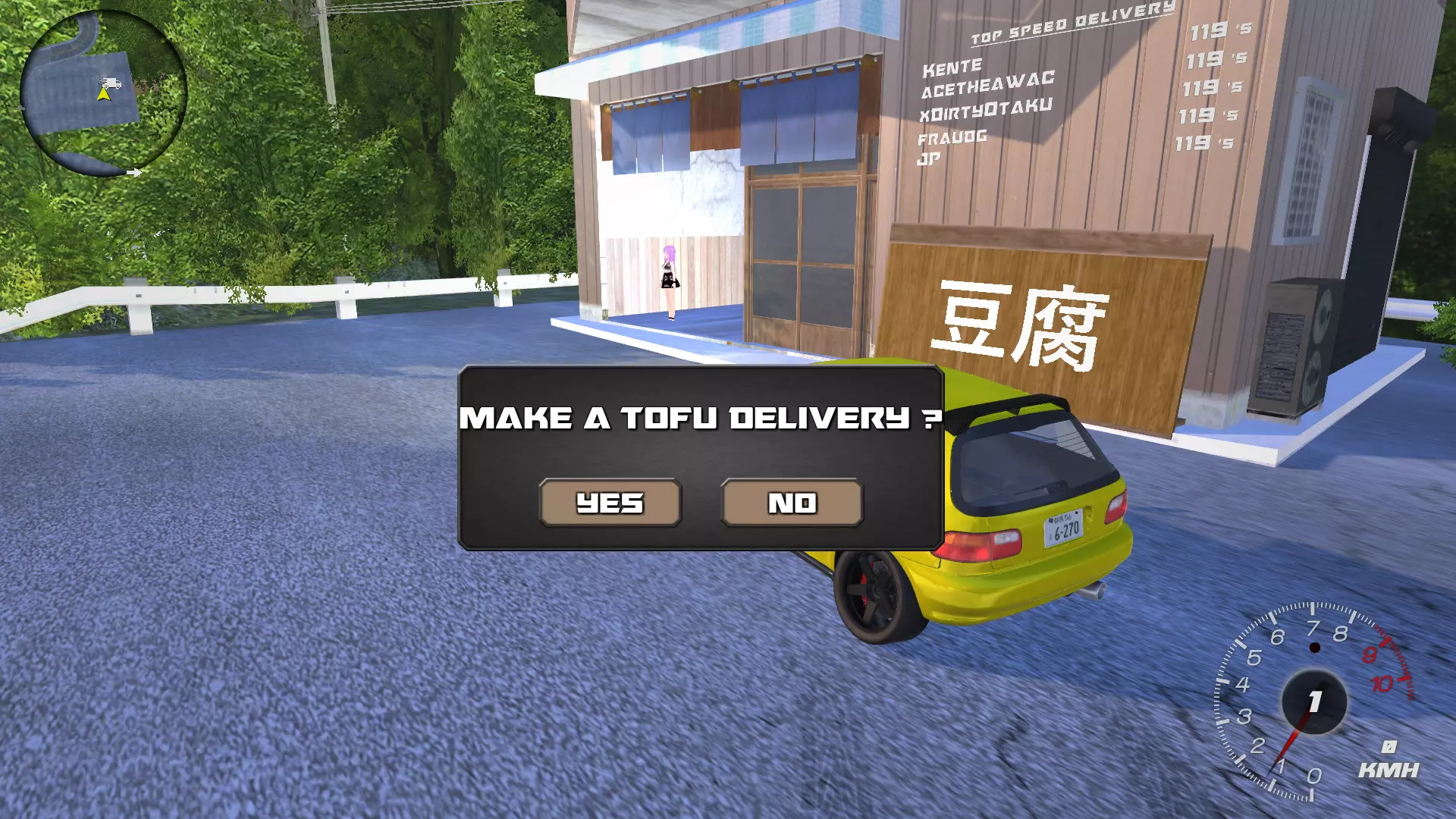 4) 如何开始执行豆腐配送任务? ▬ 所有地点都有带有NPC的小房子。找到这样的房子后,只需靠近NPC,屏幕上会出现选择窗口,点击“Yes(是)”,之后会获得货物。接下来需要沿着该地点的道路行驶,当到达标记点时,豆腐就会成功送达。根据地点的不同,你将获得相应的金钱和经验。 这类小房子的外观如下:
