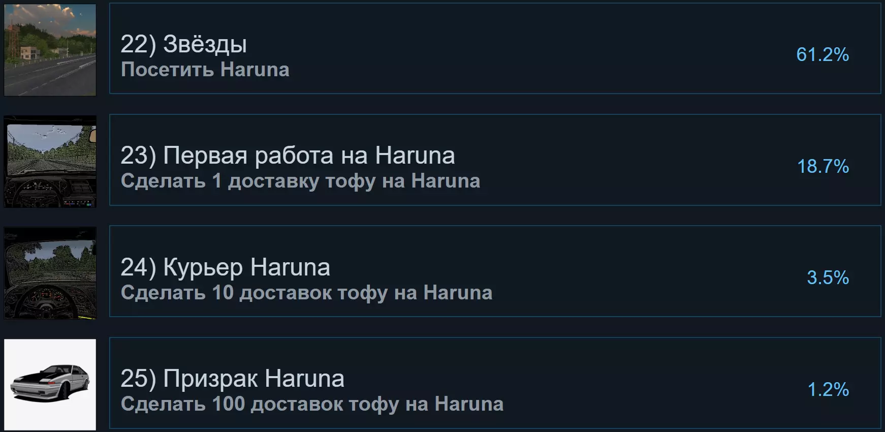 [6-10] 等级成就 这组成就很简单,只需积累经验以达到特定等级。虽然没什么难度,但需要花费不少时间。 玩家等级通过配送豆腐和参与比赛提升。赛道难度越高、长度越长,单次获得的经验就越多,金钱也是如此。因此,最赚钱的赛道是Haruna和Irohazaka。