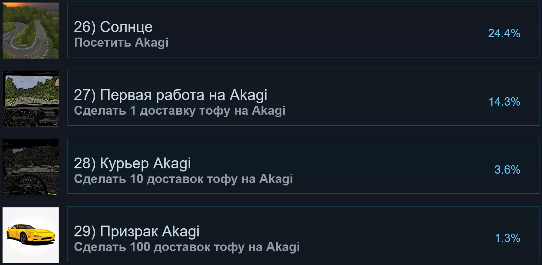要与其他玩家开始比赛,需靠近对方并按下【E】键,然后赢得比赛。 不过,提升等级的主要经验获取方式是豆腐配送。若要进行豆腐配送,需靠近带有NPC的小屋并开始配送任务。不同地图上的小屋外观各异,位置也不同,配送路线同样存在差异,但所有小屋处都有NPC。接下来,只需在取到货物后,将其运往终点。每次完成这样的运输,你都将获得经验。 [11-13] 与玩家竞赛的成就