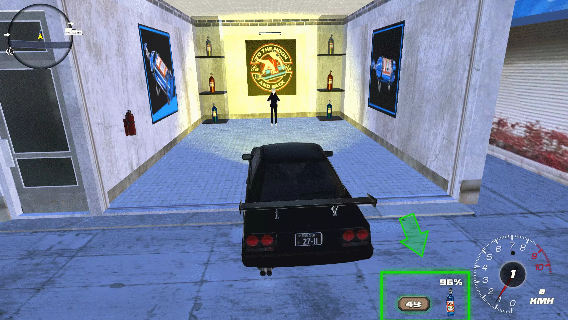 4) 填充N2O气瓶: 车辆的一氧化二氮补充在同一地点进行,位于汽车展厅和车库的左侧。寻找如图所示的建筑,当您靠近它时,速度表下方会出现一氧化二氮(N2O)的加注图标。点击该图标即可补充一氧化二氮储备。