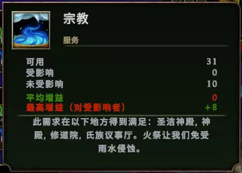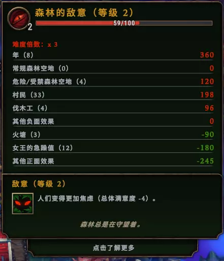 不同的服务满足提高的满意度也不同,但都很高,是后期通过满意度获取声望的主要方式。可用数表示仓库里有多少消耗品。 可以看出,一个种族人数越少,越容易提高平均满意度,从而贡献声望。由评论区指正,人数越多声望贡献速度也越快,该速度粗测与人数成正比,与满意度溢出值成指数关系。在粮食充足的前提下,尽量选你最容易满足的种族新来者。颓废值低的种族获得服务需求后能提供好几格声望(海狸和鹰身人)。前期以满足精致食物解决粮食问题为首要目的,服务类建筑如果有合适的(能否被享受、消耗品是否容易获取)也提前选上。 物流每个建筑有自己的内部储存空间,在达到上限(或你设置的上限)后工作者才会把暂存物品搬去仓库(主仓库和小仓库是共通的四次元仓库),一般情况下,只有被放进仓库里的物品才能被使用(例如休息时吃食物、高级配方拿取材料、交付指令或税收、处理事件等)。为了避免这种滞后效应,你可以: ①在仓库处设置搬运工,搬运工只负责该仓库附近X格范围内建筑的物流,可以免去建筑内工作者搬运物品的时间,在一个工作周期内增加他们的生产时间。 ②建筑规划,在放下一个建筑前你会发现有些建筑跟它有虚线箭头相连,从建筑A指向建筑B表示建筑A内的工人可以从直接从建筑B中获取配方所需材料,无需经过仓库(搬运工也一样)。由于大部分建筑完全建好后就不可动了,修筑之前就需要先规划动线。 特别注意,农田如果离主仓库比较远,最好在农田旁边修小仓库,因为在农田建筑的临时仓库被填满后,农民们会停止收割,直到先把收获物全放进仓库了才会继续收割,如果仓库太远,进入风暴季后还没收割的作物都会死掉。不想修仓库的办法,一个是多修一个农田建筑多派个农民;另一个是买商人佐格偶尔会卖的基石 - 黑曜石镰刀:收割作物速度+50%。播种速度的没必要买,因为播种没有物流要求。 开荒总督难度以上,每开一个小空地+15敌意,大空地+30敌意(危险林地和禁忌林地都一样)。某次更新了一波小空地特有内容后,小空地的收益也不是太低了(主要看脸)。小空地内特有的内容: 钻头:修复可以生成2~3格矿脉。该矿种类不受地图限制。裸矿一般小空地只有1~2格,大空地有3~5格,但大空地不一定都有矿,钻头算是一个赌脸但不太危险的选择。处理完算事件。 方尖碑:修复可以-50敌意,算1格美观。处理完算事件。 流浪商人:卖的东西比贸易站商人少,从开空地开始计时,时间到了就走。不算事件。 宝鹿:开出后会逃进附近某个大空地,在5分钟内开出该大空地可以发现宝鹿,否则消失。每种鹿都可以选择抓捕或放生,金鹿抓捕获得大量琥珀+(没选过不知道)debuff,放生获得获得少量琥珀+总体满意度;黑鹿抓捕随机获得3个史诗基石并随机摧毁一个已有基石,放生随机获得1个传说基石;绿鹿(皇家宝鹿)抓捕获得(没选过不知道)声望+debuff,放生获得半格声望+总体满意度。发现不算事件,处理完算事件。个人建议黑鹿不管,因为传说基石大部分有副作用,都是看情况去选的。危险空地事件大部分都有两个处理选择,一个带临时负面影响,一个无负面影响(少部分两个都有负面影响);一个奖励物品、石板或基石,一个奖励声望和琥珀。时限内没处理完会产生一个负面影响,且危险事件不会消失,会继续倒计时第二条时限。 禁忌林地事件也有两个处理选择,也分两种奖励,但两个处理选择都一定有不同的负面影响,看情况可能比较致命。某些禁忌林地事件处理完会给予强力buff,沼泽地甚至会有999上限的资源节点。 开大空地最主要的目的是为了处理事件获得声望,如果你偏好开荒,多带大采集营地吧。 雨朋克与疫腐病 雨朋克更新后,疫腐病比以前常见了。在大火塘的标签卡可以看到疫腐病积攒的腐蚀值(一条公式和进度条,按住快捷键z可简单显示),意思为根据现有囊肿数量×腐蚀速度=预计最大达到的腐蚀值。只在风暴季时积累腐蚀值,腐蚀值进度条达到100%就会死掉村民,然后再从0开始积累进度条。建立小火塘、升级营地等级可以增加腐蚀值上限。防疫站平时可以生产火把,但只能在风暴季才能用它消灭囊肿,每个囊肿需要1个火把*20秒左右消灭。产生囊肿的原因有: 雨朋克设施:间歇泉或集雨器生产雨水不会产生囊肿,温室和粘土坑等使用雨水作为原料的也不会,但其他用管道建立雨朋克功能的建筑每使用32点雨水就会产生1个囊肿(各建筑独立计算)。 森林空地事件:根据某个条件在处理期内刷出囊肿。根据事件处理所需时长,计算最多会出现多少个囊肿。总数超过12的话建议在晴朗季过半了再开始处理事件,这样可以把囊肿分开到两年来处理——因为一个风暴季处理12个以上囊肿的话,很可能焚烧的速度跟不上腐蚀的速度。或者修两个以上的防疫站,这样可以多安排几个防疫员。注意燃料消耗,必要时可以向商人买火把。 其他:例如难度在声望3以上,以及部分森林之谜等等。 如果设置了雨朋克设施并且消耗了雨水,记得风暴季前看看预计腐蚀值会不会超过上限太多,根据情况降低用水量或者停止用水,并且防疫站要提前做够火把(做火把也挺耗燃料的,缺燃料的局慎用雨朋克)。雨朋克可以加快建筑的生产效率和提高工作村民的满意度,主要给常用建筑(车间、各种食品店等)用,或者风暴季就差一点满意度走人时也可以用。 总督大人请看基石推荐 m(_ _m) 每年初都可