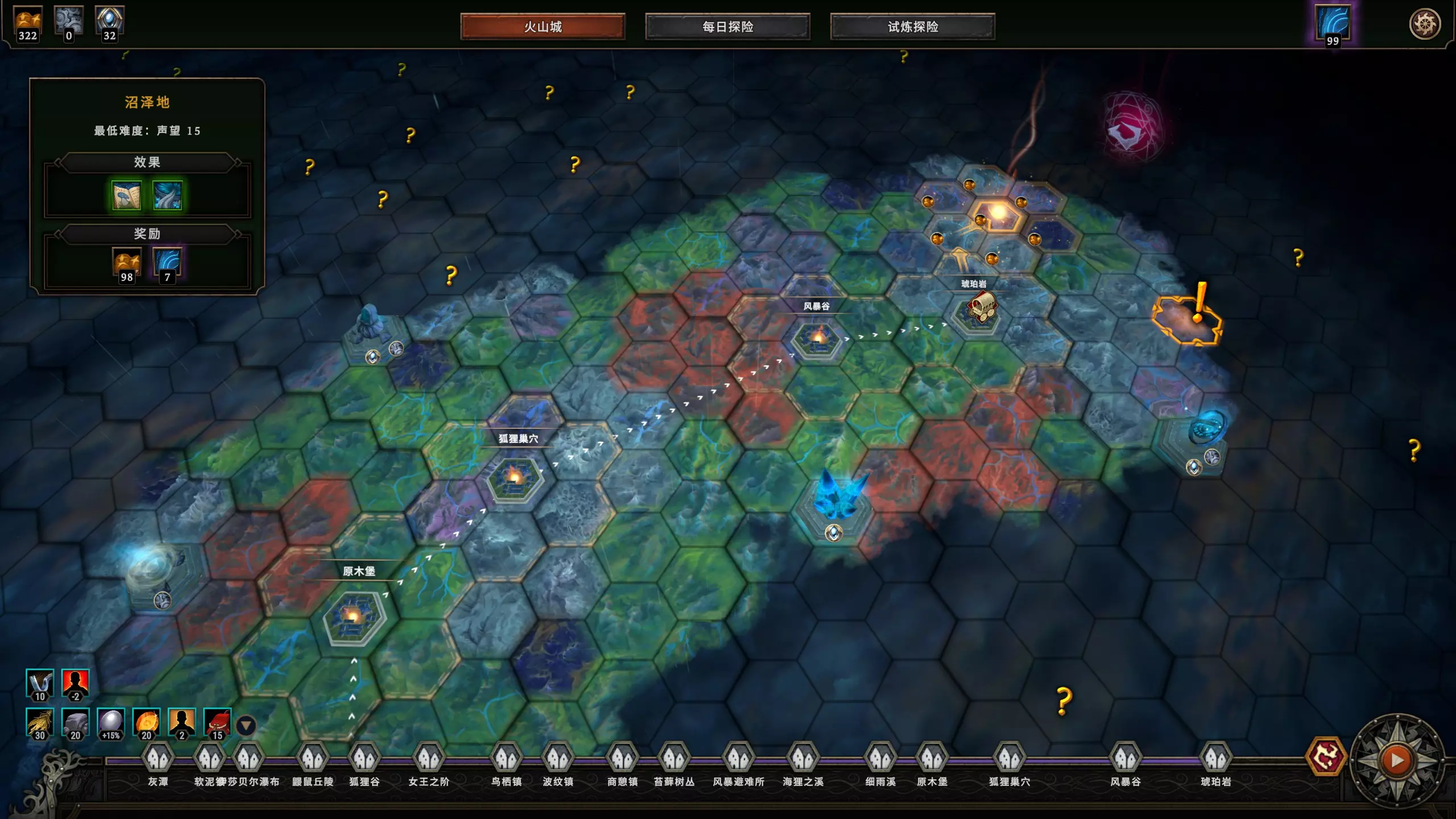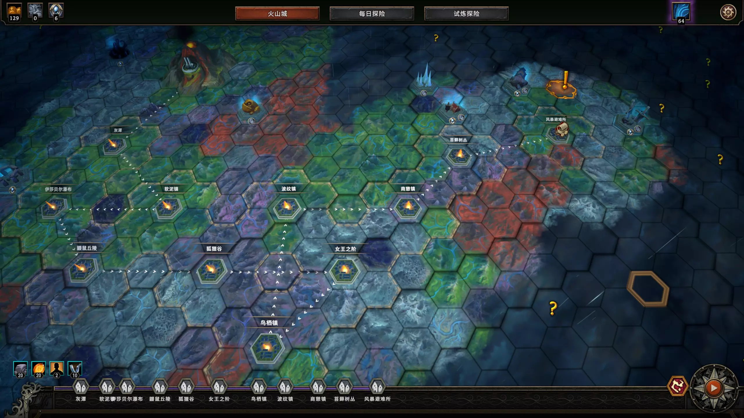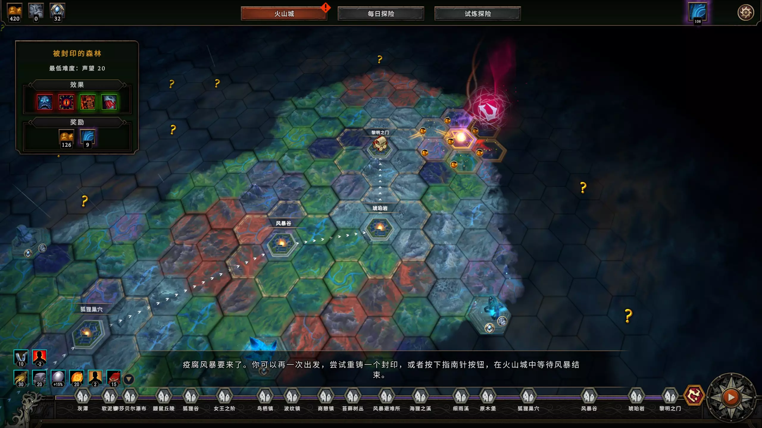 举例如图:可以看出前面的局都是在火山城附近尽可能快而多地吃红修改,最后以一条沿路都有问号点(包括红修改和感叹号事件)的最短路线向封印点前进。 当你将要出第五个圈,也就是最低难度为声望10以上时,红修改只能酌情吃了,如果你前面攒的门票够多,你这之后都能以略低于最低门票效率的速度完成一局,也可以在一些感叹号事件用门票换永久buff,别忘了规划门票数量。 快到封印点时,火山城升级虽然不满,但肯定剩了很多食物点数,它可以用给遗忘祭坛。 吃什么?低难度基本什么都可以吃,除了几个陷阱款:【渔民的仪式地】【强盗营地】没有指令和商人,低难度局的攒资源优势就很小了。 感叹号事件也有不太推荐的,例如【考古学家(还是啥名字)】需要解决两个受禁事件,因为禁忌林地都比较远可能会拖时间;各种奖励村民的,循环前期都可以选,毕竟低难度局比起缺食物更缺人手,但快到后期时建议找机会把多的人数抛掉,除非你有很多自带食物buff。 赶路小tip: ①循环后期如果能吃多的红修改,可以看情况选马车,不仅是赶路,这个模式下高难度的局翻车风险不低,而且最好把循环中尽可能多的年份留给低难度局攒资源。这需要提前规划路线。②找一个能【一步到位】的角度进入封印点,如下所示: