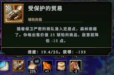 温室自愧不如.jpg 萨希达的秘密食谱、佐格秘方 - 每生产10馅饼获得10肉干、每生产10腌制品获得10烤串。在馅饼或腌制品很容易做的情况下选(基本取决于面粉或容器的获取难度)。 各种输送线,每分钟3个。缺啥补啥。(植物纤维输送线+3星油配方可以解放火塘燃料。) 农田增产(大篮、耕作工具、先进的草药技术)。 蒸汽烹饪 - 库存每有50细雨水,食物生产速度+10%。取决于你有没有建细雨水泵。 蘑菇苗 - 所有农场建筑都可以种2星蘑菇。2星种植产量比1星翻了一倍,不然缺食物的图也不会推荐种植园了。 富饶的森林空地 - 新发现的资源小节点上限+5,大节点上限+15。已开空地的资源不受影响。 燃料相关(主要是伐木)伐木工的祈祷 - 木头产量+1,选择该基石后失去现存所有燃料。燃料告急就选它,别选得太早把煤炭储备丢了…… 强化斧 - 伐木速度+40%。变相木头增产。 满是根茎的地面 - 木头产量+1,种田收菜速度-25%。放弃种地的地图选,或者向商人买农耕加速的基石。【1.3】该基石(及其他“使用沃土”的基石等)不影响温室和粘土坑。【1.4】你们一个都逃不掉.jpg。 无质量控制 - 木头产量+2,每次风暴季过完会清除现存木头,并获得50虫子。适用于既缺木头又缺粮食并且风暴季还要停止伐木的局(或者风暴季继续伐木,并开启献祭,这种策略下搭配【啄木鸟技能】说不定虫子会爆仓噫,好恶心)。 烧成脆皮 - 每烧掉3个囊肿获得20煤炭。因为一个火把只需要3煤炭,囊肿直接变成正收益。 其他材料相关过于勤劳的木工 - 每生产10木板获得3木桶。相比于家人答谢,这个来得方便快捷。 制革架 - 皮革生产+1。【1.3】在沼泽地有奇效,直接进行一个皮革水袋的做。【1.4】算了吧皮革已经滞销了…… 钢镐 - 石头生产+2。除了做砖块,多的石头能用来做训练装备等。 皮手套 - 芦苇生产+2。采完一个大芦苇几乎够用到结束。 小蒸馏厂 - 每生产20树脂获得4晶露。仅在皇家林地有用但也非常有用。 地图勘测 - 每开一块空地获得20黏土+20芦苇。【1.4】布料改配方后,伐木无纤维的图选这个很好。而且考虑到砖块配方也经常稀缺,这个基石选的越早越好。 刺雾器 - 可以看未开空地的内容,但每开一块空地+0.5急躁值。有了它就可以避开较难处理的危险森林事件了,也能用来寻找资源、废墟和沃土。 注:古老的协议 - 可以看未开空地的内容,但开危险/禁忌空地会死掉一个村民。如果全程只开小空地的话其实也用不着开透视……如果有死人+收益的buff可选。 贸易相关农民的补给 - 每来一个村民就有3个补给包。不仅是每年一批的新来者,完成指令和林中营地来的村民也算。由于是按人数×3,给的补给包非常多。 剩下的庄稼 - 每生产10香草获得3补给包。【1.3】虽然香草也能做补给包但你还得留些做食物和服务品对吧。【1.4】其实是个懒人选项因为随着面粉需求减少,香草最多的用途就是做补给包了。 床和早餐 - 每次来商人你获得10琥珀。 伐木税 - 每砍10棵树获得1琥珀。蚊子腿也是肉。 勒紧裤腰带 - 贸易路线费用-1。对于原本只要1补给包的路线,可以0补给包走5倍贸易满5包邮。贸易等级升上去后就很少有1费用的贸易路线了,主要是前期省邮费。 风暴行者税 - 每来一批村民获得15琥珀,选择该基石后失去现存所有琥珀。注意,你此时暂停去把钱花掉再回来是选不了它的。你问我怎么知道的?嗯…… 森林敌意相关安全港 - 每有一个火塘升至2级,敌意-40。不多,其实相当于降低人均敌意。 火焰护身符 - 伐木工敌意-4。不如雷铸,主要是前期可以帮助风暴季伐木。 火的洗礼 - 每烧掉3个囊肿,敌意-10,火塘腐化时(即有活跃囊肿时)禁用献祭。2个防疫员半个风暴季就能烧完10个囊肿。 受保护的贸易 - 你每出售30琥珀商品,敌意-10。经常走贸易的话可以选,直接商人交易也算。貌似太imba被削弱了,难道是制作组看到了我之前的截图【想多。