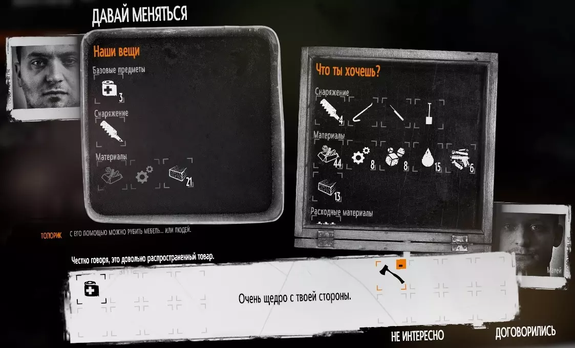 第二天,你应该考虑在背包里准备一把斧头——用它可以破坏不需要的家具,获得木板和燃料。 现阶段木板的最佳用途是修补避难所的所有破洞,从而降低劫匪的袭击几率。 燃料最好节省到冬季再使用。 斧头可以在升级后的工作台上制作,或者在“车库”地点用药品交换获得。把避难所稍微弄得更舒适一些,这样就能提升角色们的心情。
