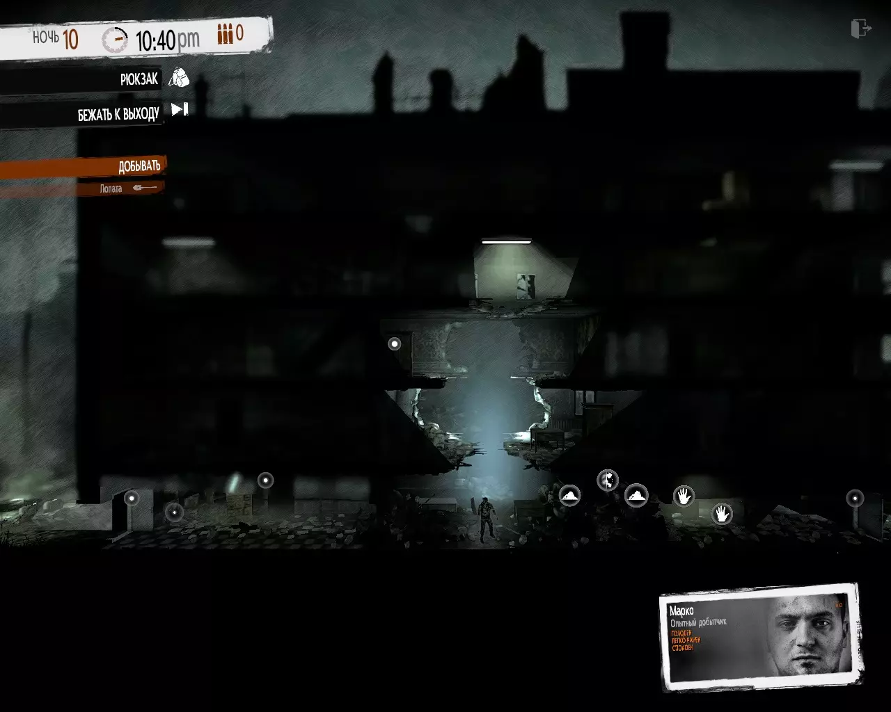 马可·波扎尔尼克(背包有15个格子) — 拥有游戏中容量第二大的背包,是最出色的收集者。 鲍里斯的奔跑速度明显不如他。 — 在情感上难以承受杀戮行为。 错误观点:— 搜索速度比其他角色快。 这并非特殊能力,他的搜索速度与其他角色相同。