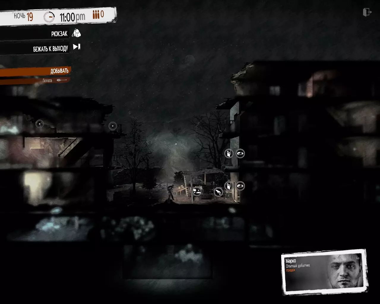 游戏赋予你完全的行动自由。你,也只有你,能决定角色首先要做什么,如何布置他们的避难所,派谁去休息,以及派谁去半废墟的城市搜集物资——那里到处都是和你一样为了生存不择手段的人。你必须决定夜晚要去哪个地方,以及需要带哪些资源回避难所。由于背包容量有限,你经常不得不将重要物品留在场景中无人看管。