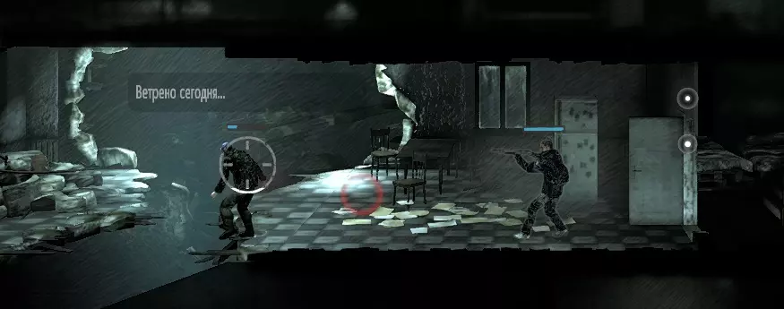 即使你选择了和平的游戏通关方式,也很难避免遇到那些想要通过暴力伤害你或他人的人。在这种情况下,你将不得不进入战斗,而且往往是不公平的战斗。你可以在左上角将模式切换为战斗模式来进行战斗。在战斗模式下,你的角色无法搜索房间,也看不到战利品,因此要回到搜索状态,你必须将模式切换回去。游戏的战斗系统分为两部分——潜行和强攻。 潜行: 正如我之前所说,在战斗模式下,屏幕上所有的战利品图标都会消失,但会出现其他图标——掩体。掩体包括阴暗处、门口以及各种箱子之类的物体。最佳的攻击方式是从阴暗处发起。游戏中有足够的冷兵器可供使用。你可以徒手攻击,也可以使用刀、斧头、铲子以及撬棍。匕首可与枪械搭配使用以提升战斗力。所有声音和动静在盲区内以红色圆圈显示在屏幕上。