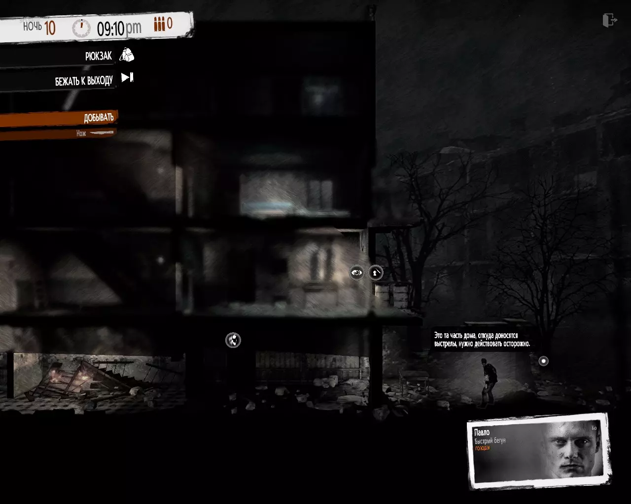 白天时,所有角色共享一个无限容量的背包,因此游戏开始后应立即清理大量杂物,收集所有资源。右键点击可加速角色移动。首先制作铁匠工作台并打造撬棍,它将在撬锁过程中派上用场。这样我们就能打开上锁的柜子,取出里面的所有战利品。为什么不应该使用消音器? 消音器可能在需要悄无声息地溜过人群的场景中派上用场,同时也能节省背包空间,因为消音器与撬棍不同,使用后会损坏消失,而撬棍使用后仍会留在背包里,占用宝贵的格子。一个小技巧:如果你在外出探索归来后发现有角色生病,或者你的队伍遭遇了劫匪袭击,而战斗结果完全不符合你的预期,那么你可以大胆地重新加载最近的存档。关键在于,游戏会在采集者返回避难所后的早上进行保存,此时夜间随机事件尚未生成。第二天。