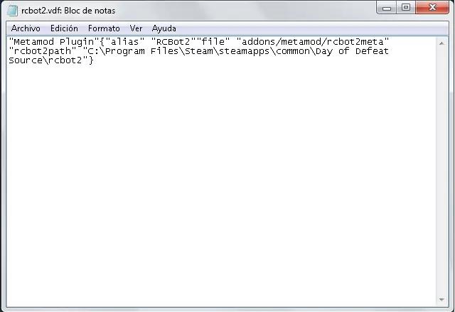 步骤4 用记事本打开rcbot2.vdf文件,该文件位于我们刚刚粘贴的dod文件夹中:dod addons metamod