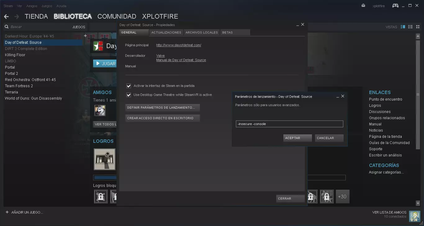 《胜利之日:起源》是《胜利之日》的新版本,后者是《半条命》的一款模组,背景设定为二战期间的欧洲战场。该作采用Valve广受好评的Source引擎开发,带来了更强的真实感、更出色的画面和音效,尤其是物理效果。游戏以团队合作为核心,在二战历史场景中展开。 遗憾的是,由于已推出超过10年,游戏的玩家数量已不复当年,很难找到有人游玩的服务器……即便找到,也因服务器延迟过高而几乎无法正常游戏。在本指南中,我将教你如何为游戏添加机器人,这样你就能舒适地游玩这款Valve已放弃的佳作了…… RcBot2 首先,你需要在启动选项中添加命令“-insecure -console”。 操作方法:进入【库】,右键点击《胜利之日:起源》,选择【属性】。