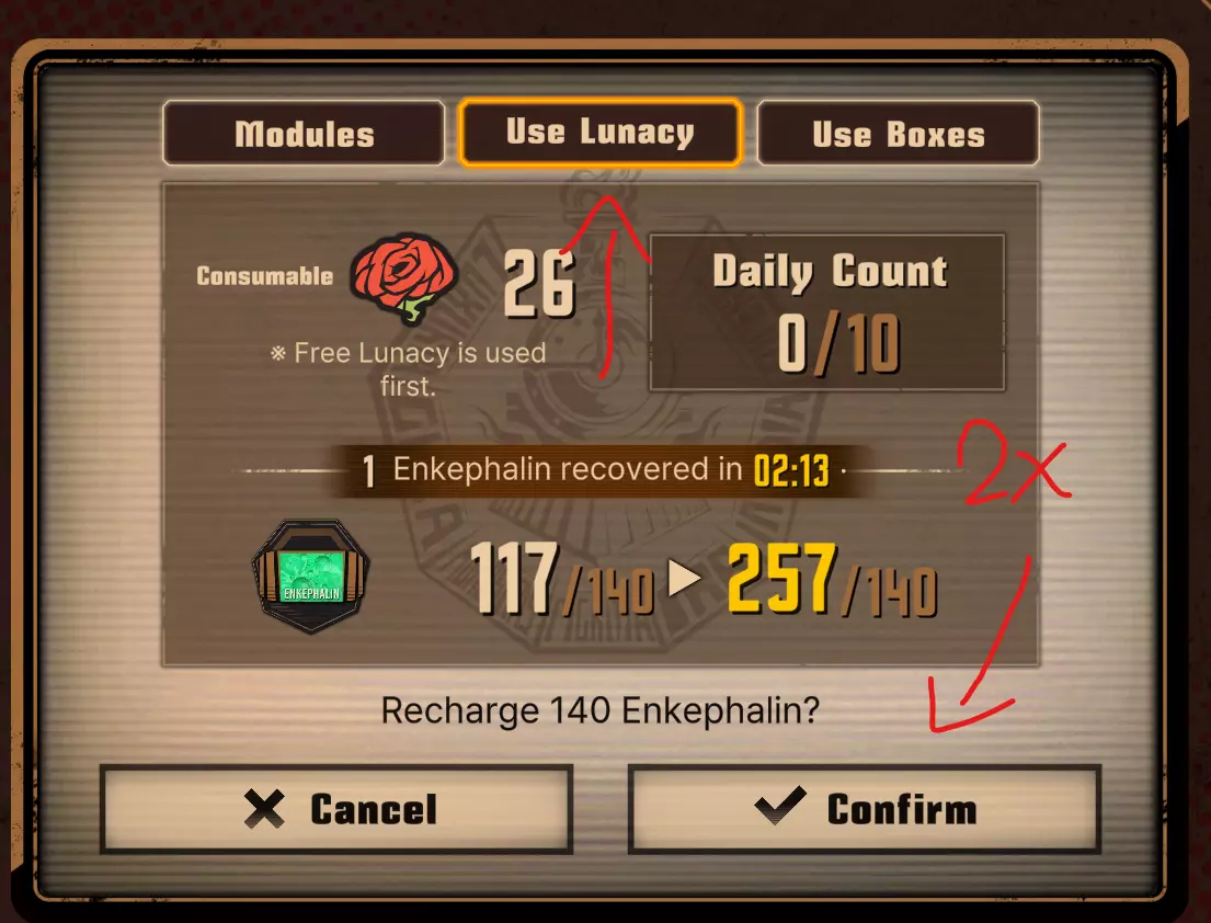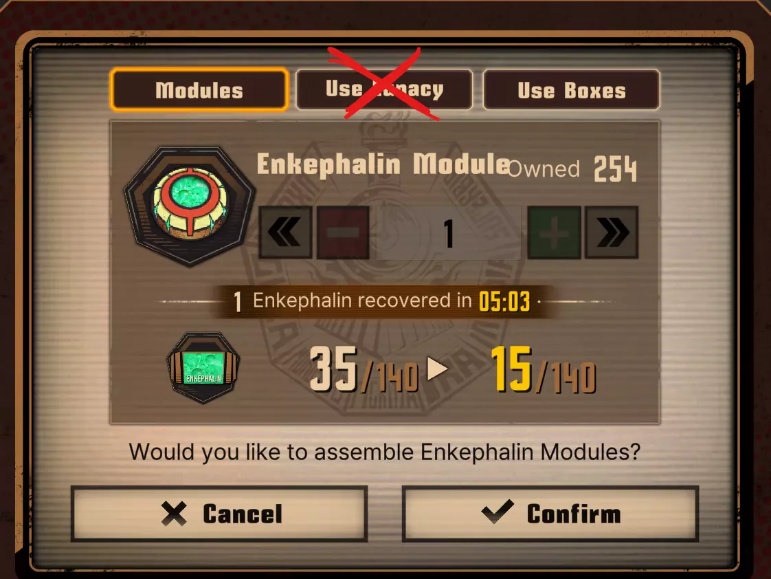 步骤3. 使用精神值为脑啡肽容量充能两次,并在X点整制作脑啡肽模块
