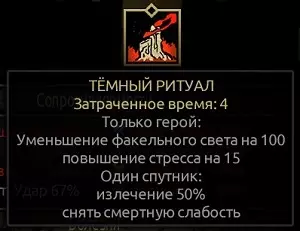 黑暗仪式 只有三名英雄能够消除致命弱点——【神秘学者】、【修女】和【十字军】,其中只有第一位能附带50%治疗量的额外效果。该技能有一个相当严重的缺点——火炬光芒减少100%,不过如果你有火炬储备,或者无论如何都要在黑暗中行进,这个惩罚就能轻松抵消。