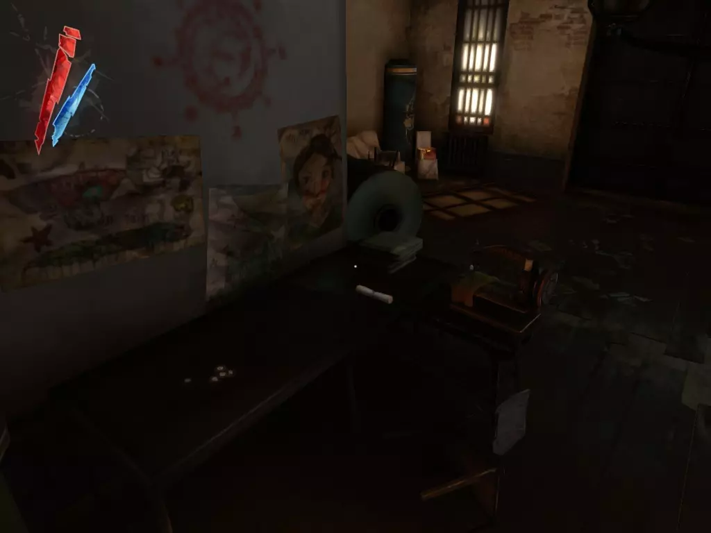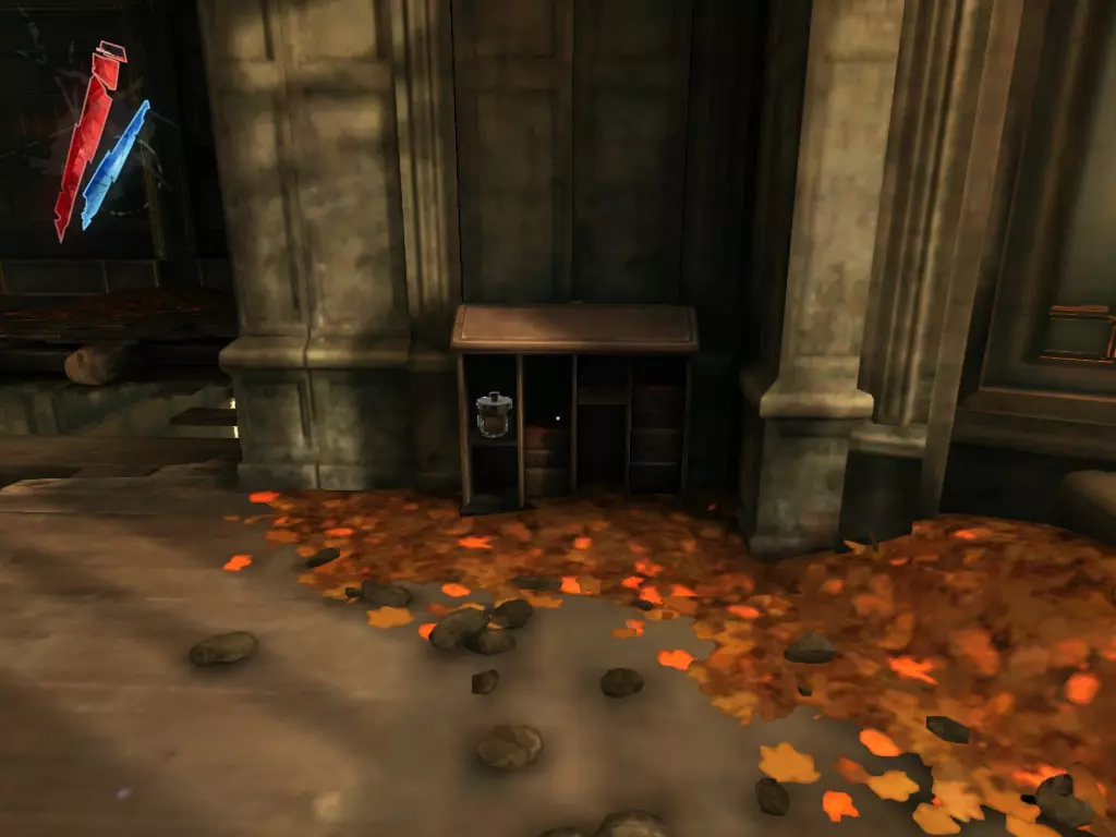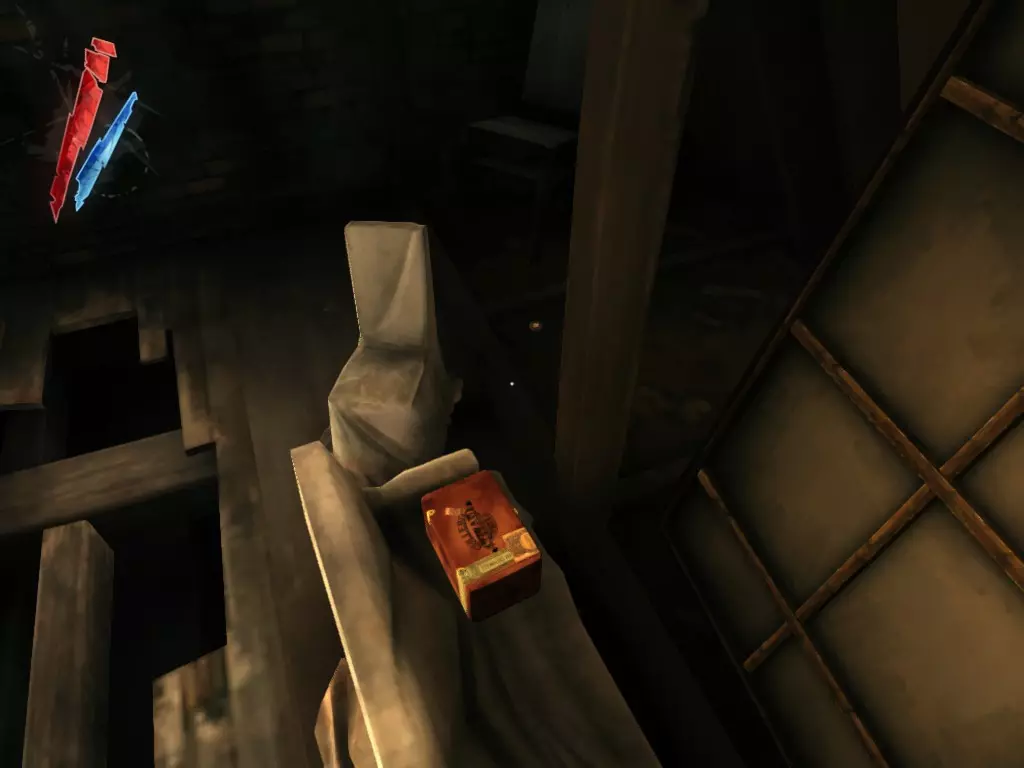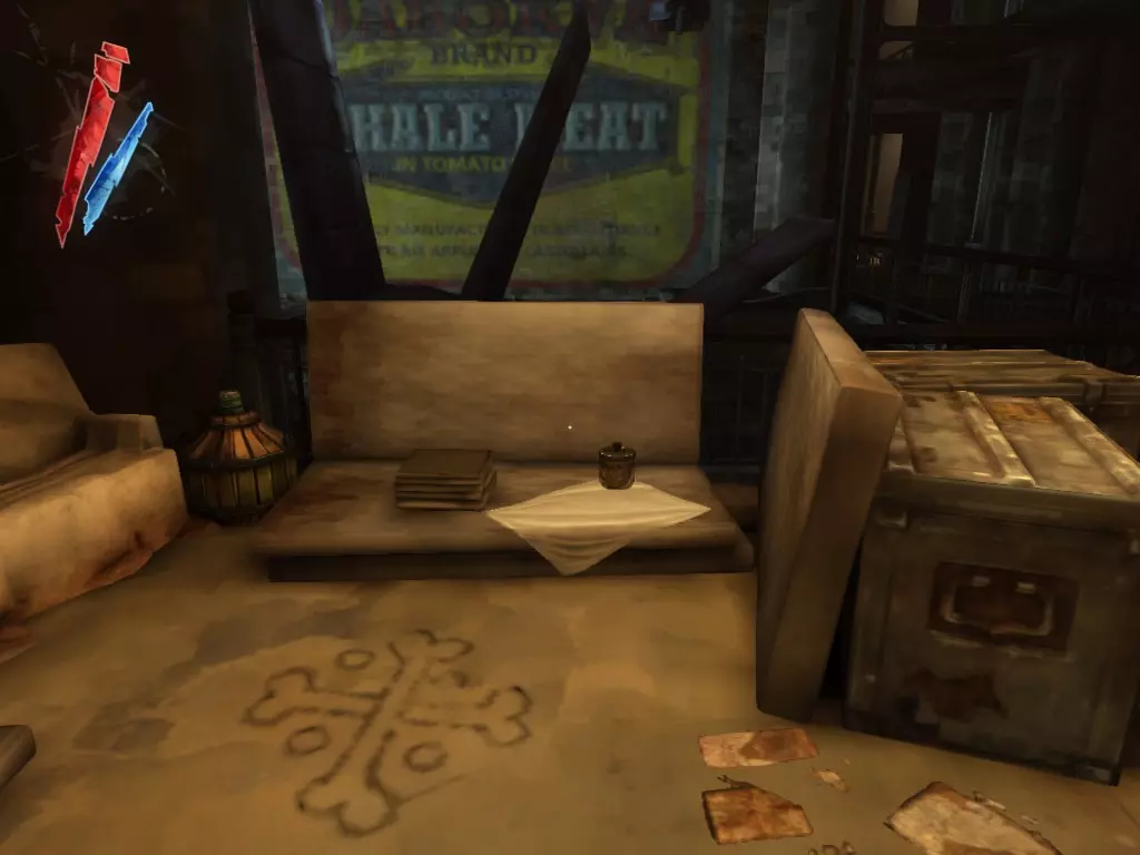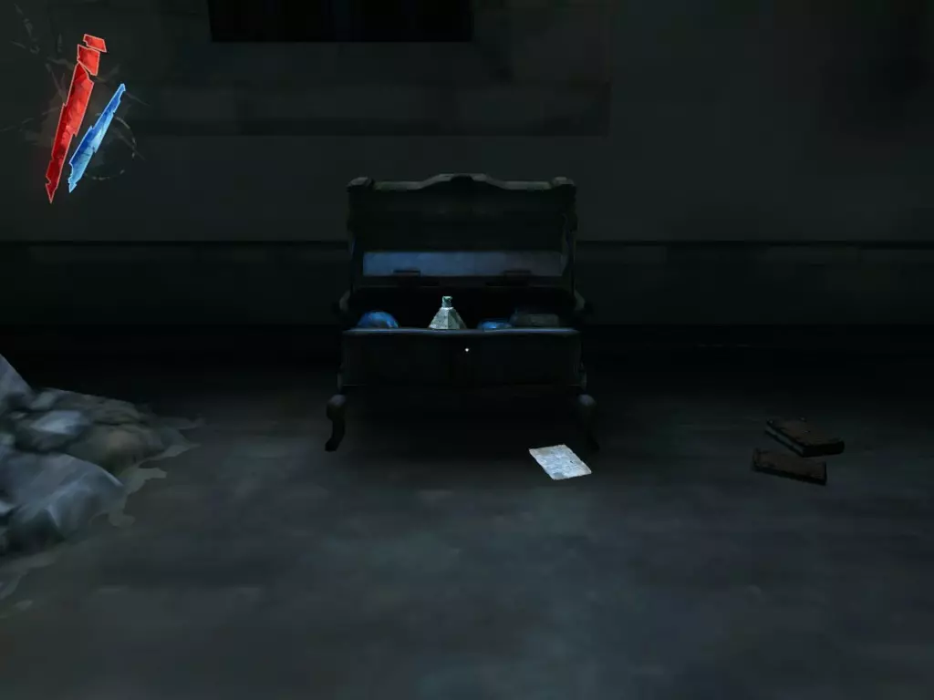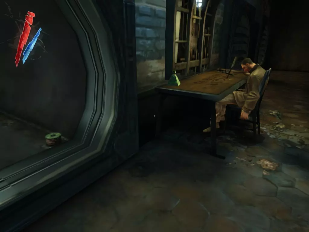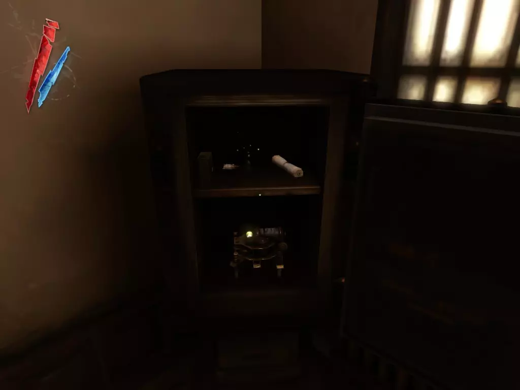 在倒塌画作后面的同一个房间里,地板上有一个符文和5块金锭。 (从这里开始,你的监工伪装将不再起作用,所以是时候潜行行动了。) 战利品:500 总计:855