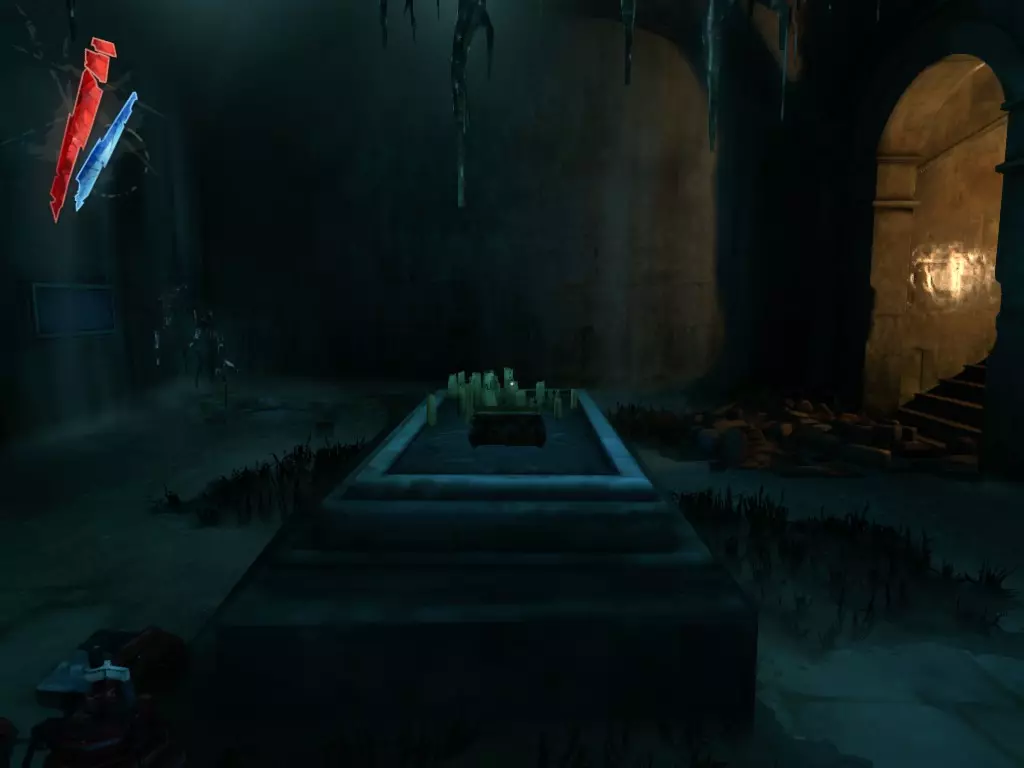 从这里返回门厅。走过楼梯和被瓦砾掩盖的骸骨护符,就能在地上找到一枚布里格莫尔六分仪。 战利品:150 总计:1460
