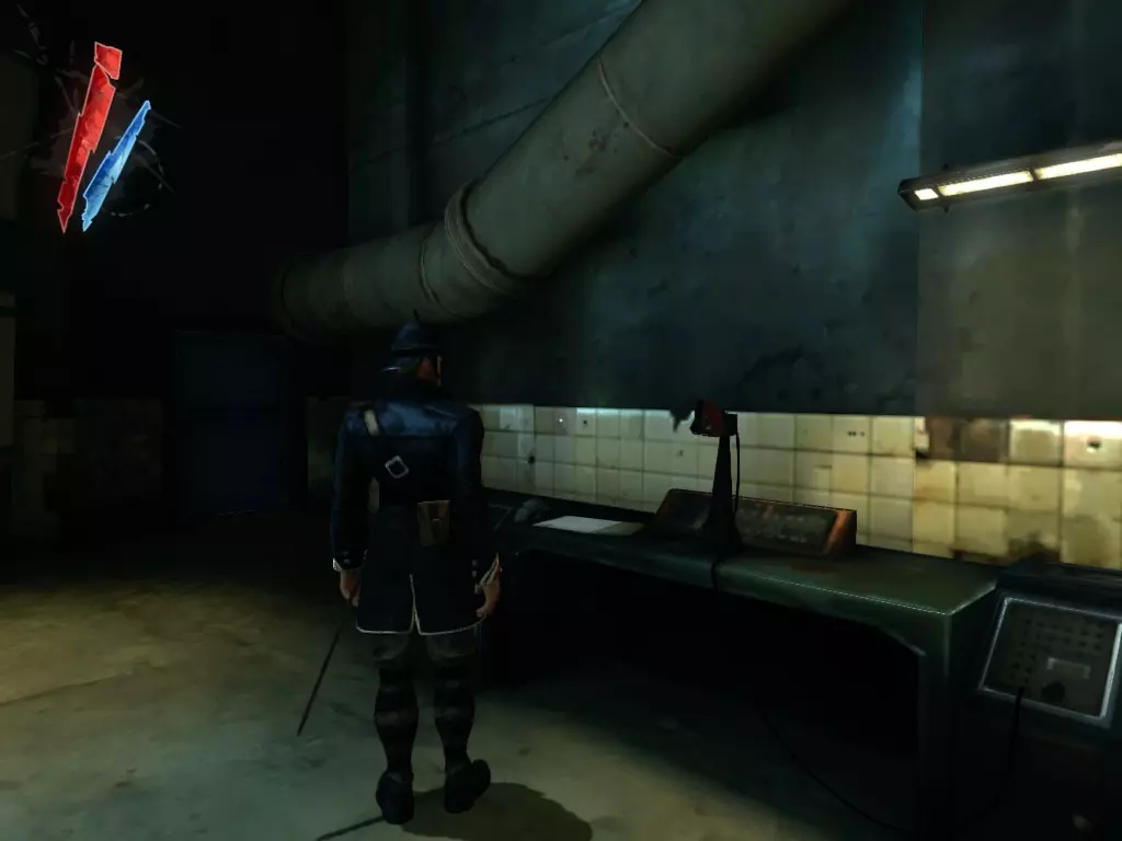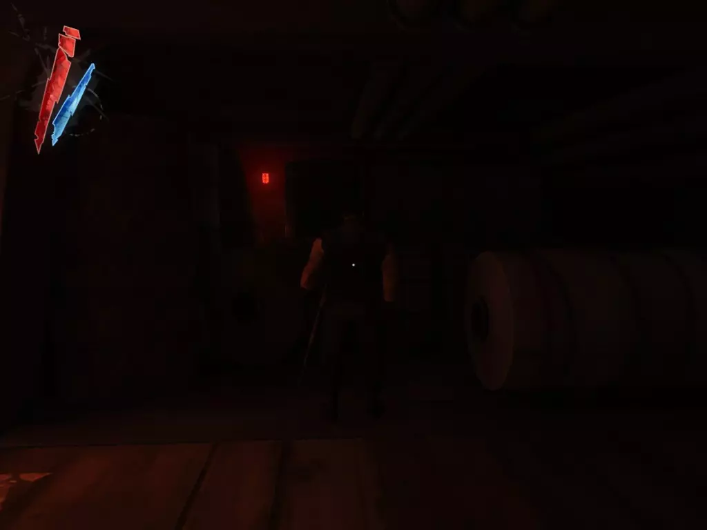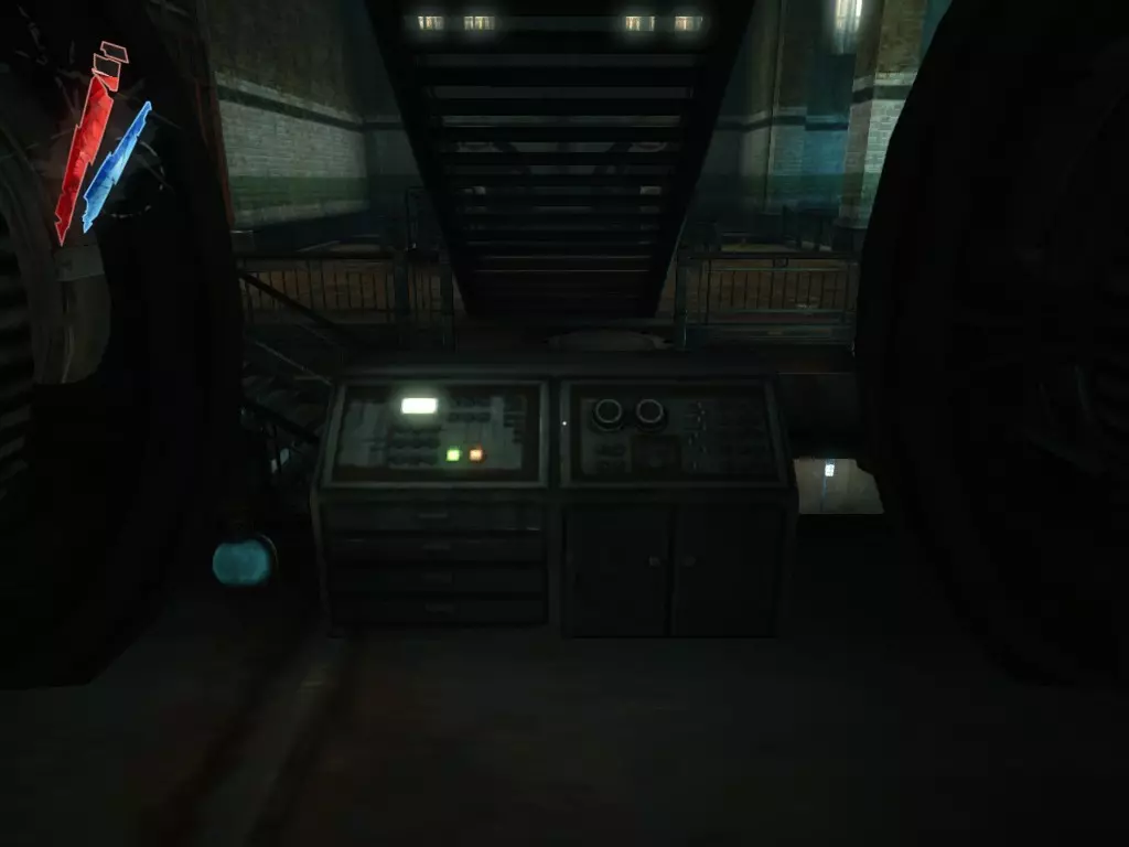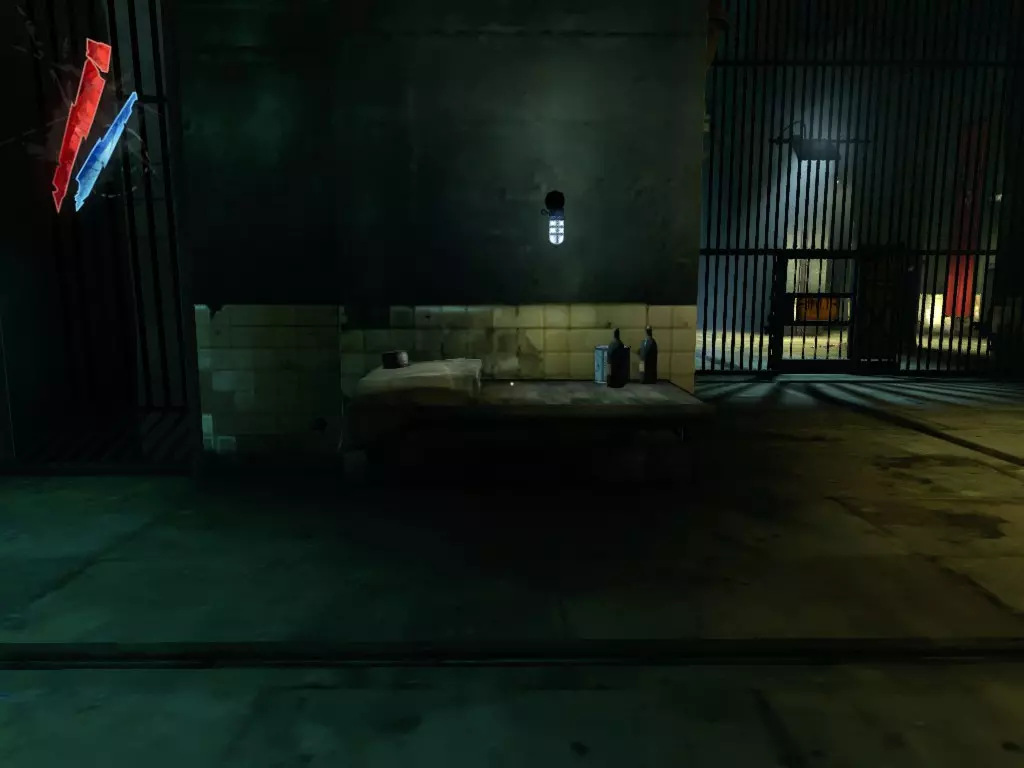 在院子上方的观察室里,那里有个牢房解锁装置(3个红色刻度盘),桌上放着一个装有25单位物品的袋子。 【战利品】:25 【总计】:880 离开这个区域前,抬头看走廊,爬进那个打开的面板。