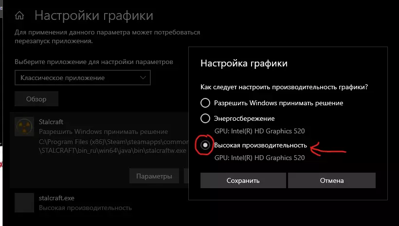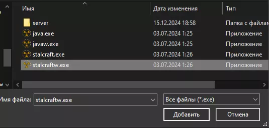 在我们进入的窗口中,需要点击“浏览”按钮。粘贴我们之前复制的地址,然后按照指定路径找到“stalcraft.exe”文件并添加它。对“stalcraftw.exe”文件也需要执行同样的操作,这些文件位于同一目录下。