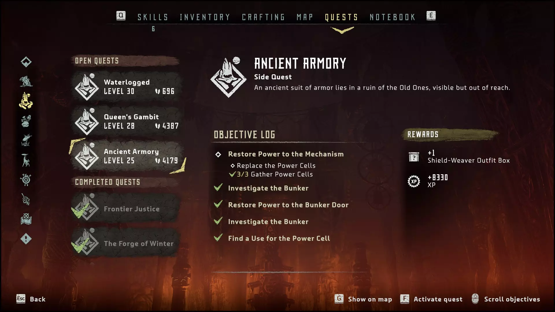 获得护盾编织者套装 回收并启用了一项古代科技。