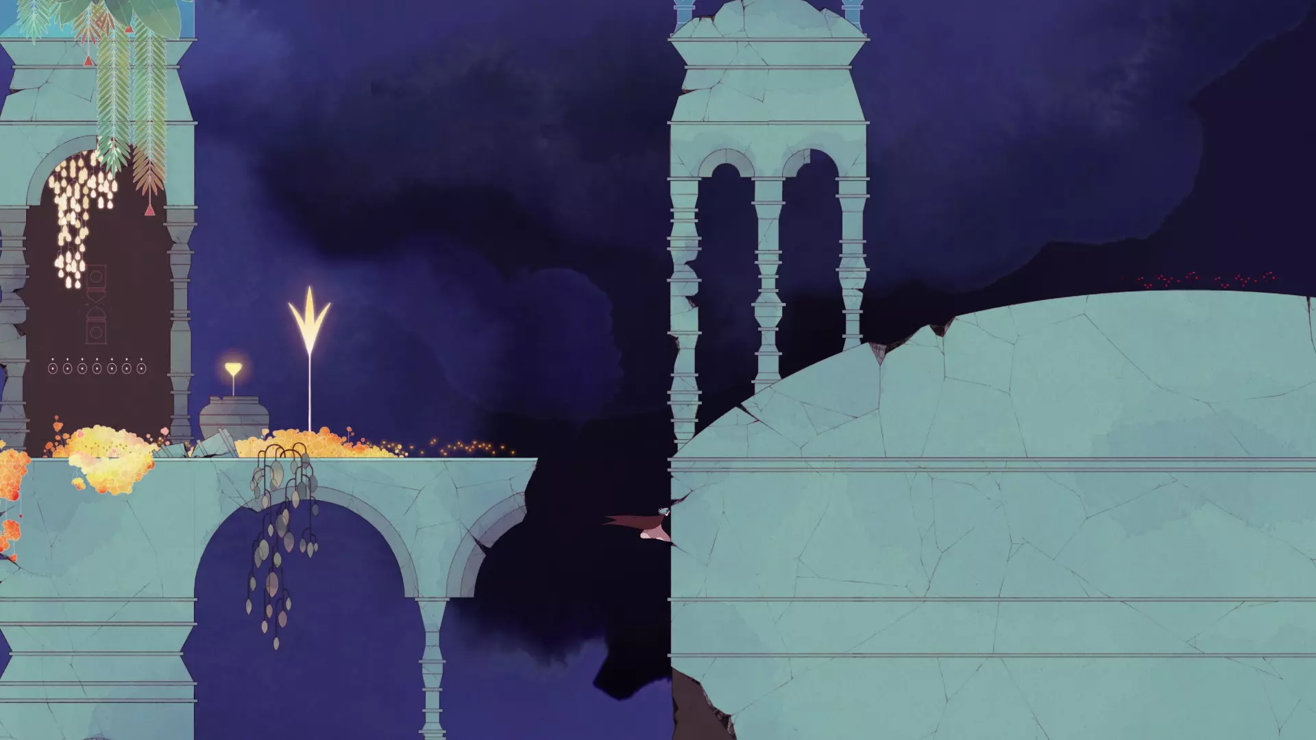 回忆/记忆 5-3 解开翻转谜题后,向左走并朝这个方向跳下。你的到来会点亮 lamps,同时地面也会显现出来。