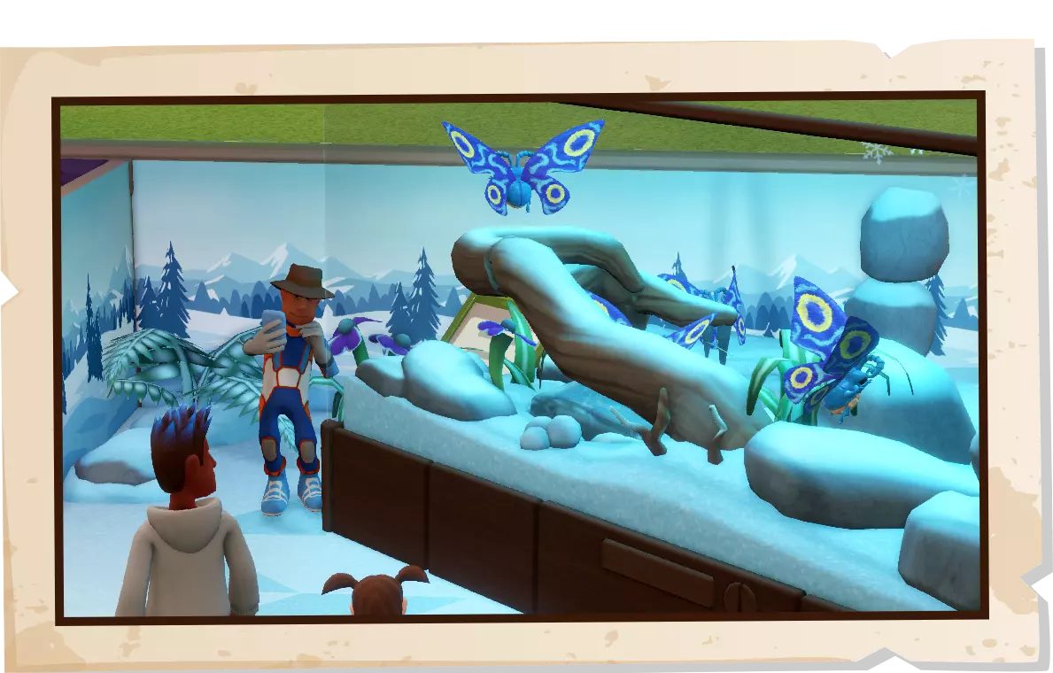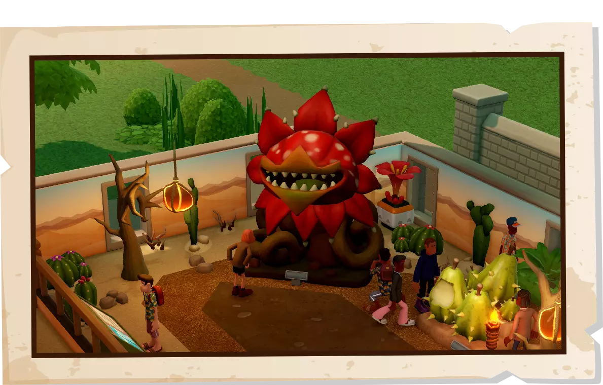 双点医院的专家们在数字宇宙中发现了一道裂隙,裂隙通向一个神秘的行星系统,那里充满了有趣的外星动植物。探索三个兴趣点,收集来自《野蛮星球的复仇》的展品,用野蛮星球上充满活力、有时甚至有些“焦虑”的动物(比如可爱的布雷纳德)以及该系列中会咬人的植物来吸引游客——我们建议你最好不要与这些植物对视,以防万一。 本次更新包含六个全新展品,员工休息室也新增了一些物品,为双点郡原本充满“地球风”的装饰增添了一抹太空时代的色彩。此外,还有全新的装饰物品以及一套全新的科幻风格员工服装。 野蛮星球的复仇 欢迎加入先锋计划! 各位太空殖民者,你们好!在数字时空的裂缝中穿梭,是不是很刺激?我宁愿这样,也不要在ALTA低温休眠舱里睡上一个世纪……总之,我们来这里是为了在深空为人类建立一个繁荣的据点!而我们任务的关键一环,就是记录原始的外星生态系统,这正好符合你的……你是做什么的来着?馆长?管理员?不管怎样,这现在是你的工作职责了,所以我们开始记录吧。
