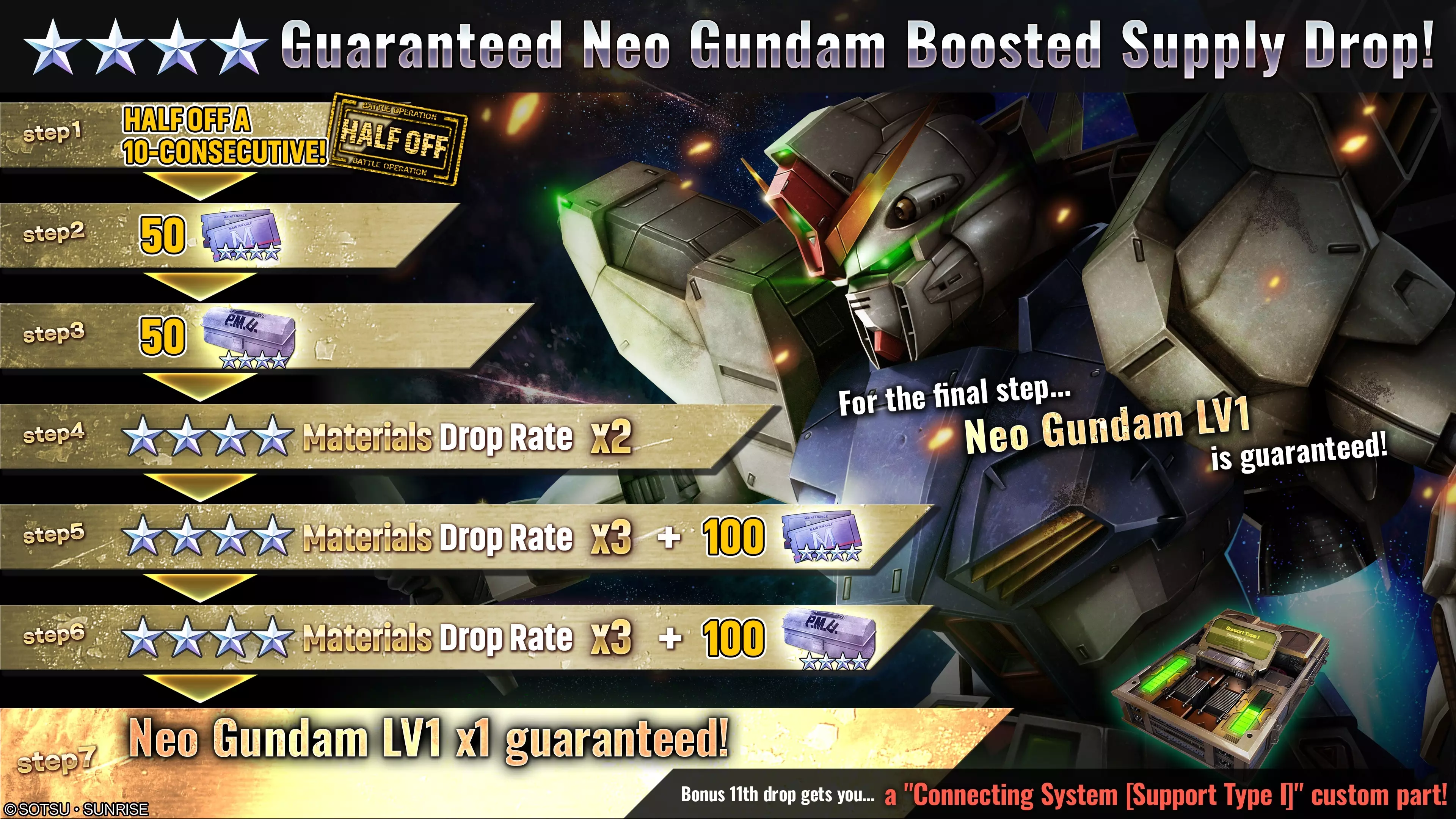 ■活动时间 [太平洋标准时间] 2026年1月29日 00:00 – 2026年2月4日 20:30 [已计划] [中欧时间] 2026年1月29日 09:00 – 2026年2月5日 05:30 [已计划] ■活动内容 本次补给箱活动中,最多可请求10连补给箱直至达到第7阶段。 每次请求后阶段将提升1级,顺序为阶段1→阶段2→阶段3→阶段4→阶段5→阶段6→阶段7。 达到阶段7后,强化补给箱活动结束。 ・阶段1(15代币):代币50%折扣! ・阶段2(30代币):额外奖励50张★★★★机械师票! ・阶段3(30代币):额外奖励50个★★★★改装套件! ・阶段4(30代币):★★★★材料掉落率2倍! ・阶段5(30代币):★★★★材料掉落率3倍!・第6阶段(30代币):★★★★材料掉落率3倍! +额外奖励100个★★★★改造套件 ・第7阶段(30代币):必定获得“新高达LV1”×1! +额外奖励自定义部件“连接系统[支援型I]LV1” ■自定义部件 连接系统[支援型I]LV1 特性: 远程光束武器对敌方单位造成的伤害提升5%,过热恢复速度加快10%。 装备于支援型机体时,远程光束武器的蓄力时间减少10%。 无法同时装备多个相同类型的自定义部件。