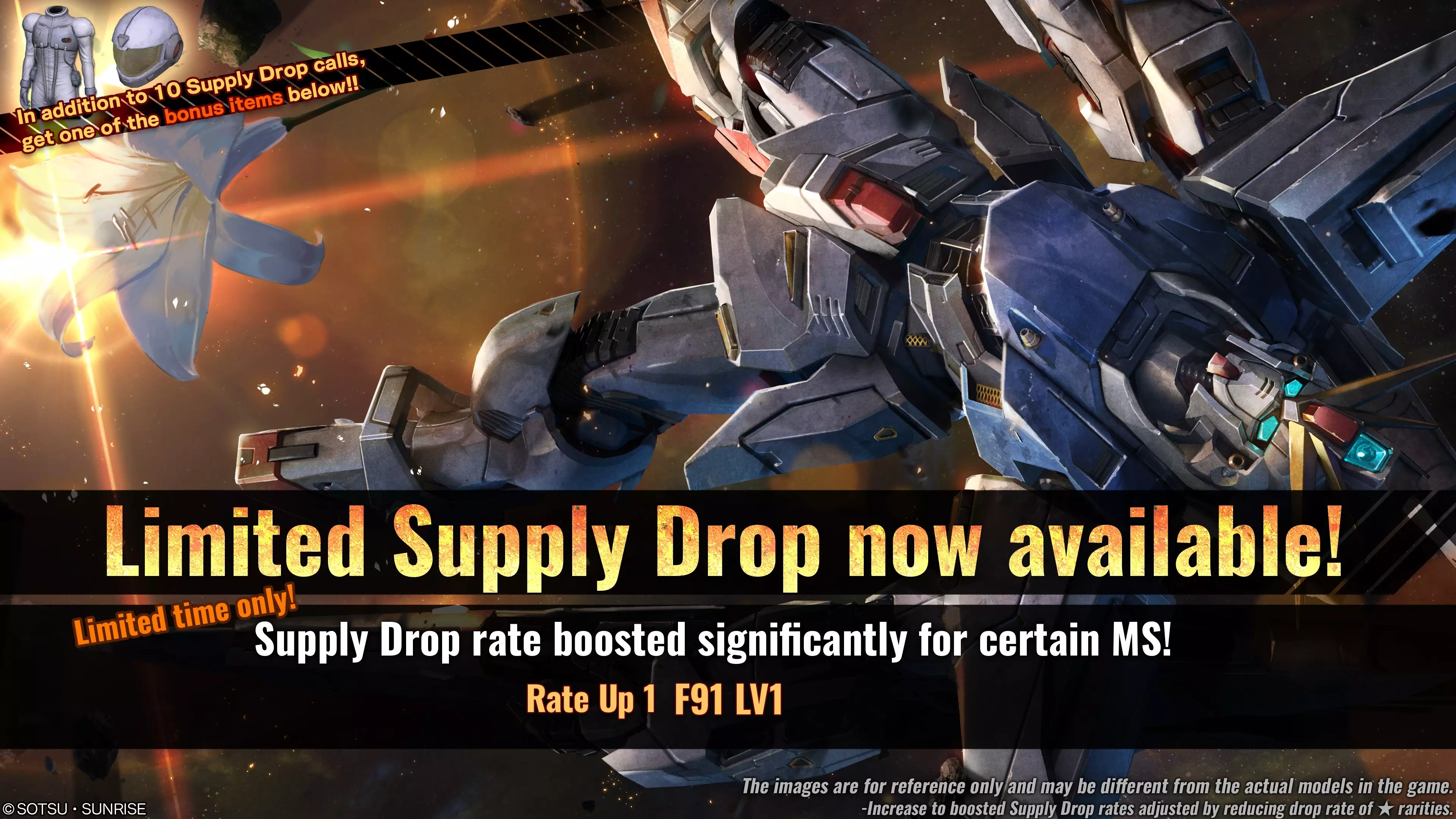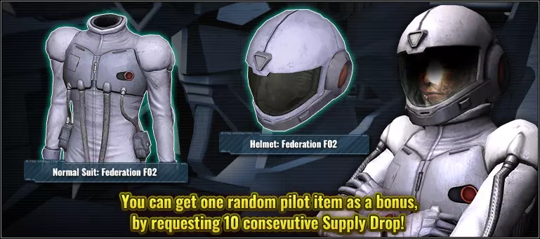 ■活动时间 [太平洋标准时间] 2026年1月29日 00:00 – 2026年2月4日 20:30 [已计划] [中欧时间] 2026年1月29日 09:00 – 2026年2月5日 05:30 [已计划] ■含奖励物品的补给箱 普通10连补给箱 ■奖励物品内容(随机获得以下2件物品中的1件) ■服装 普通套装:联邦F02 ■配饰 头盔:联邦F02 ※活动期间进行10连补给箱抽取,将额外获得第11个补给箱,并获取1件额外物品。 ※单次补给箱不适用此福利。 即使连续进行10次单次补给箱抽取,也不会获得奖励物品。关于更新后的补给掉落列表的更多信息,请参考【补给掉落列表】。 【补给掉落率大幅提升活动公告】 部分新添加的素材将在限定时间内获得补给掉落率提升。 【活动时间】 【太平洋标准时间】2026年1月29日00:00 – 2026年2月4日20:30【预定】 【欧洲中部时间】2026年1月29日09:00 – 2026年2月5日05:30【预定】 【掉落率大幅提升的重点素材】 ・★★★★ 新高达 LV1(支援单位,陆/空通用,cost:750) 【掉落率大幅提升的补给类型】 ・普通补给掉落 ※活动结束后,所有补给掉落率将恢复至与其他素材相同水平。【"限时补给投放!F91"公告】 自[太平洋标准时间]2026年1月29日/[欧洲中部时间]2026年1月29日起,将开启MS掉率提升的限时补给投放活动。